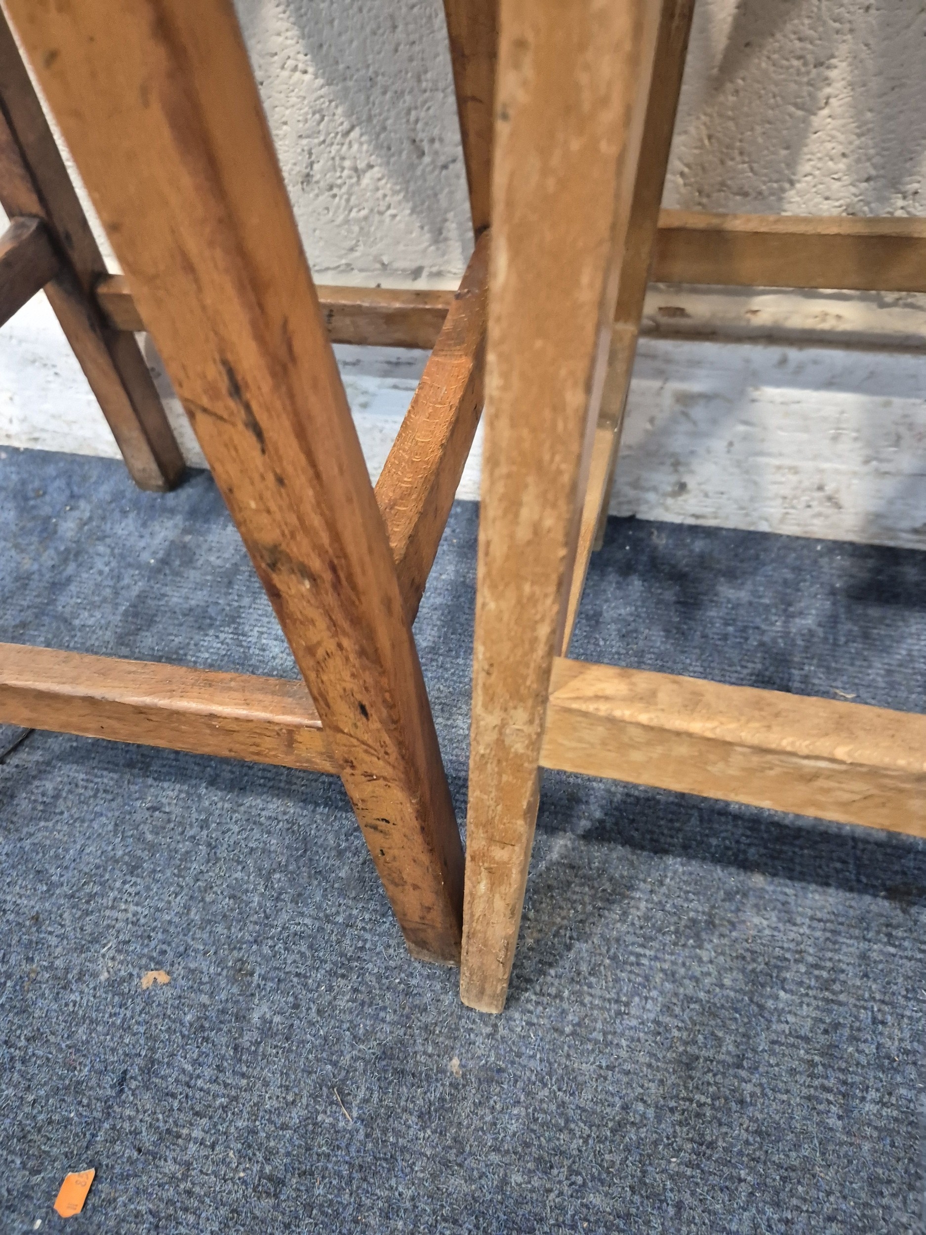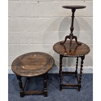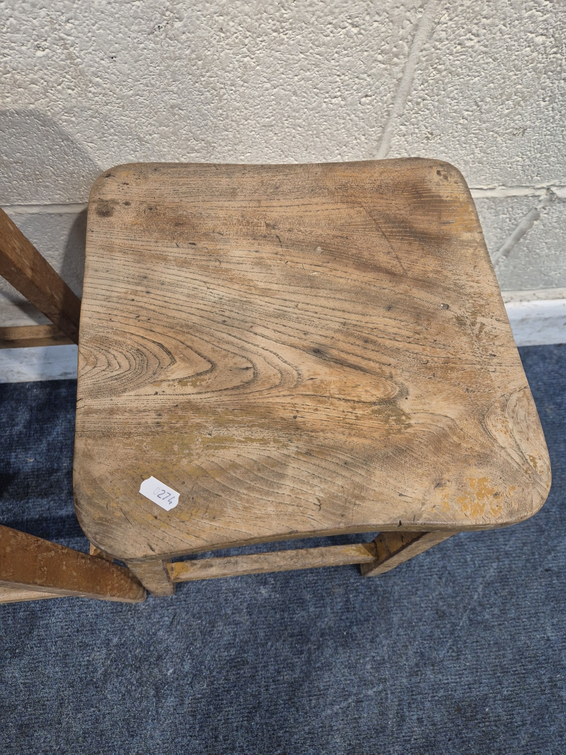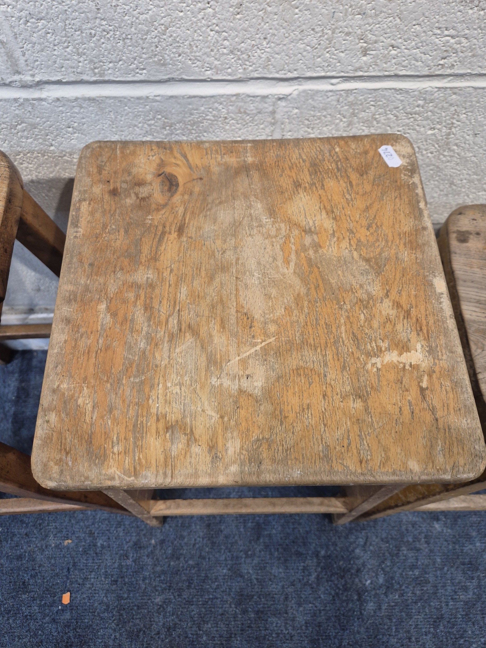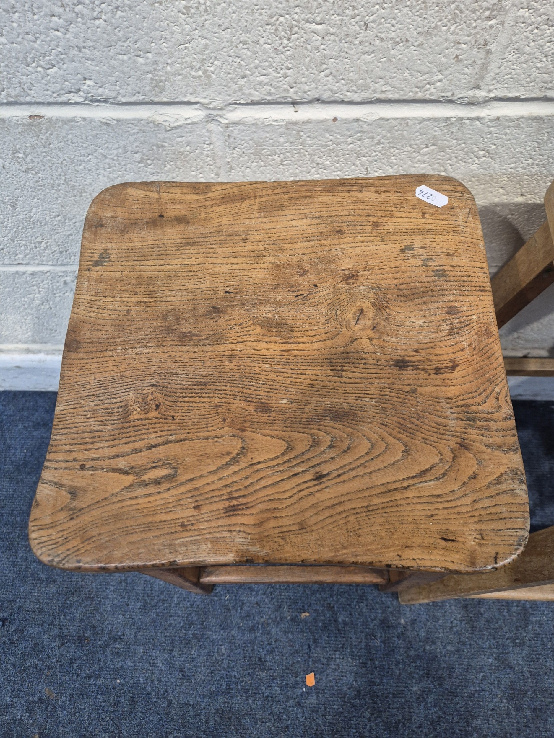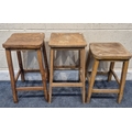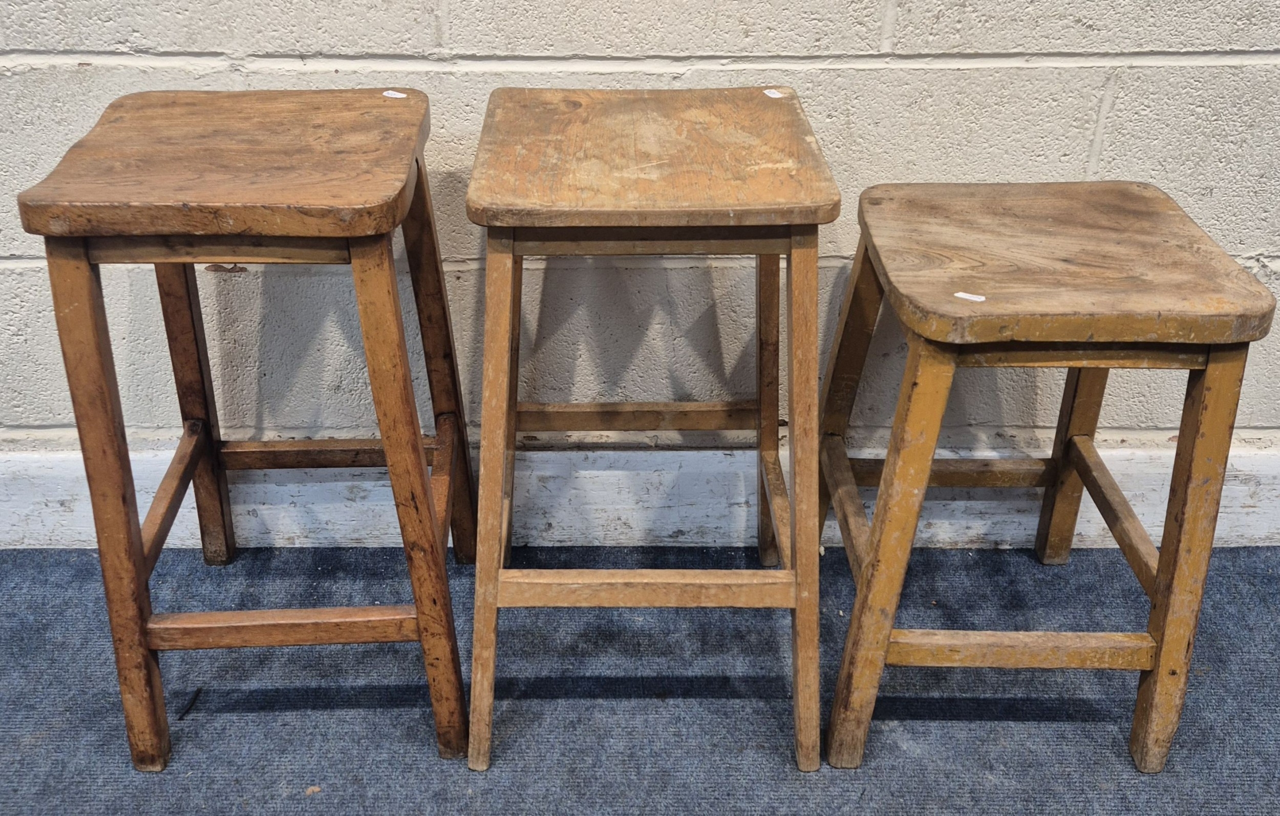THREE 20TH CENTURY ELM SEATED STOOLS, varying in sizes, tallest stool height 62cm, condition report: all with marks, scuffs, discolouration, other wear and usage (3)