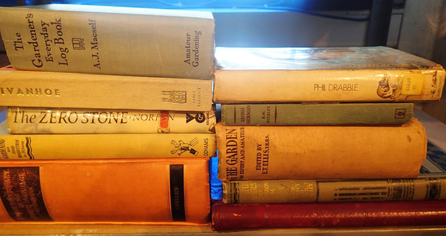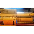 Shelf of vintage books to include an unused ledger book. Not available for in-house P&P, contact Paul O'Hea at Mailboxes on 01925 659133