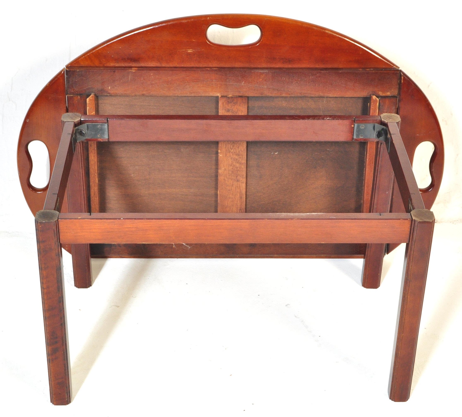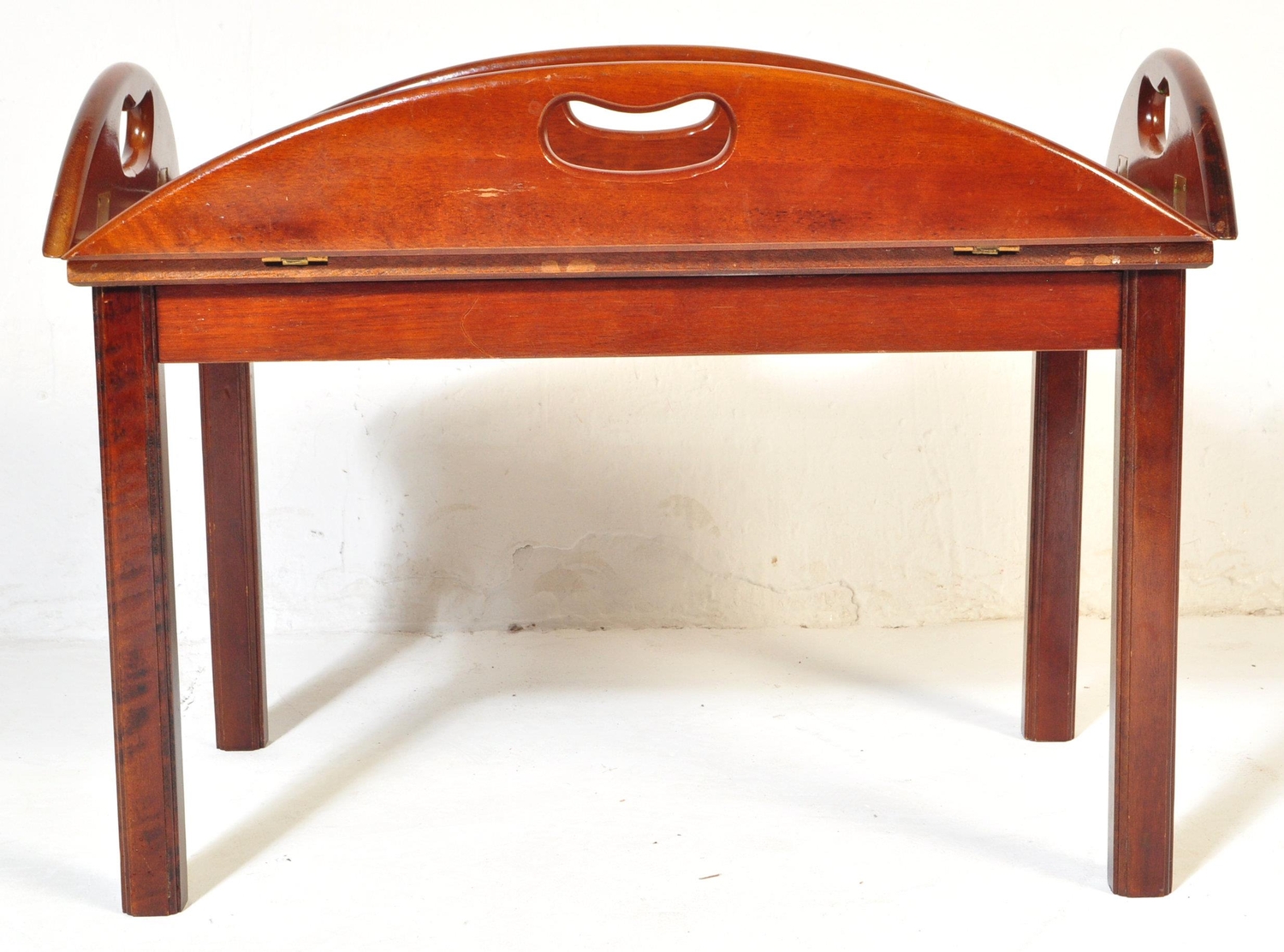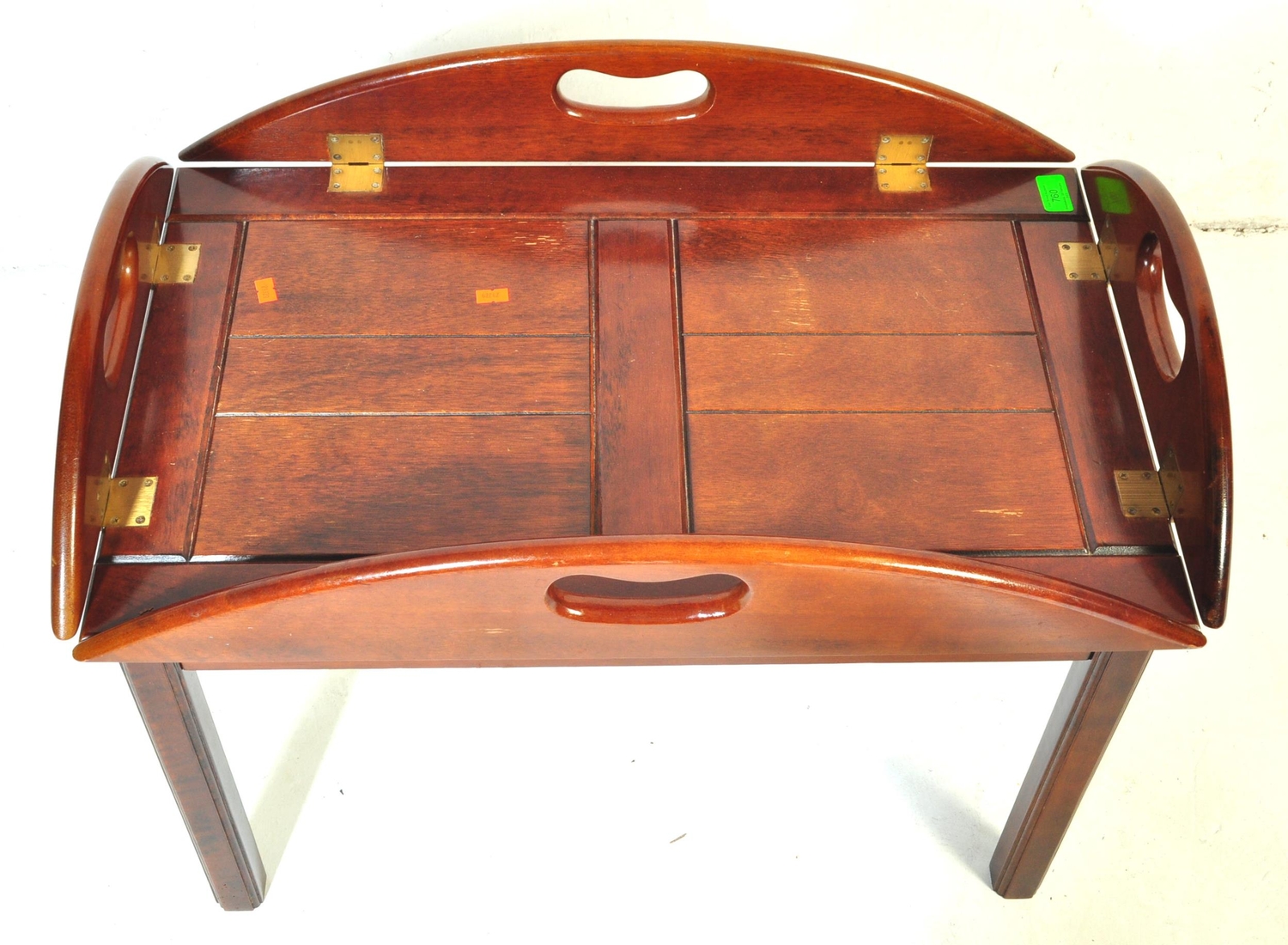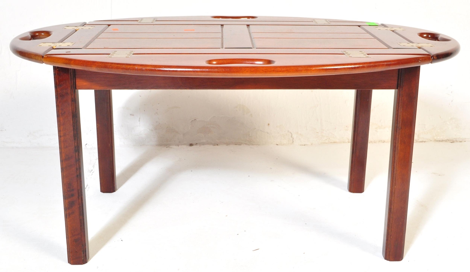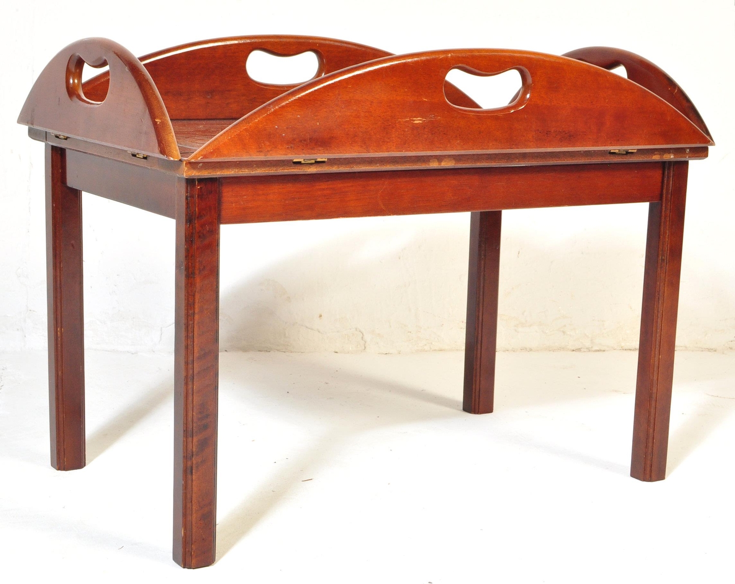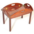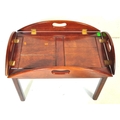 A 20th century mahogany and brass bound butlers tray coffee table with panelling to top over squared supports.