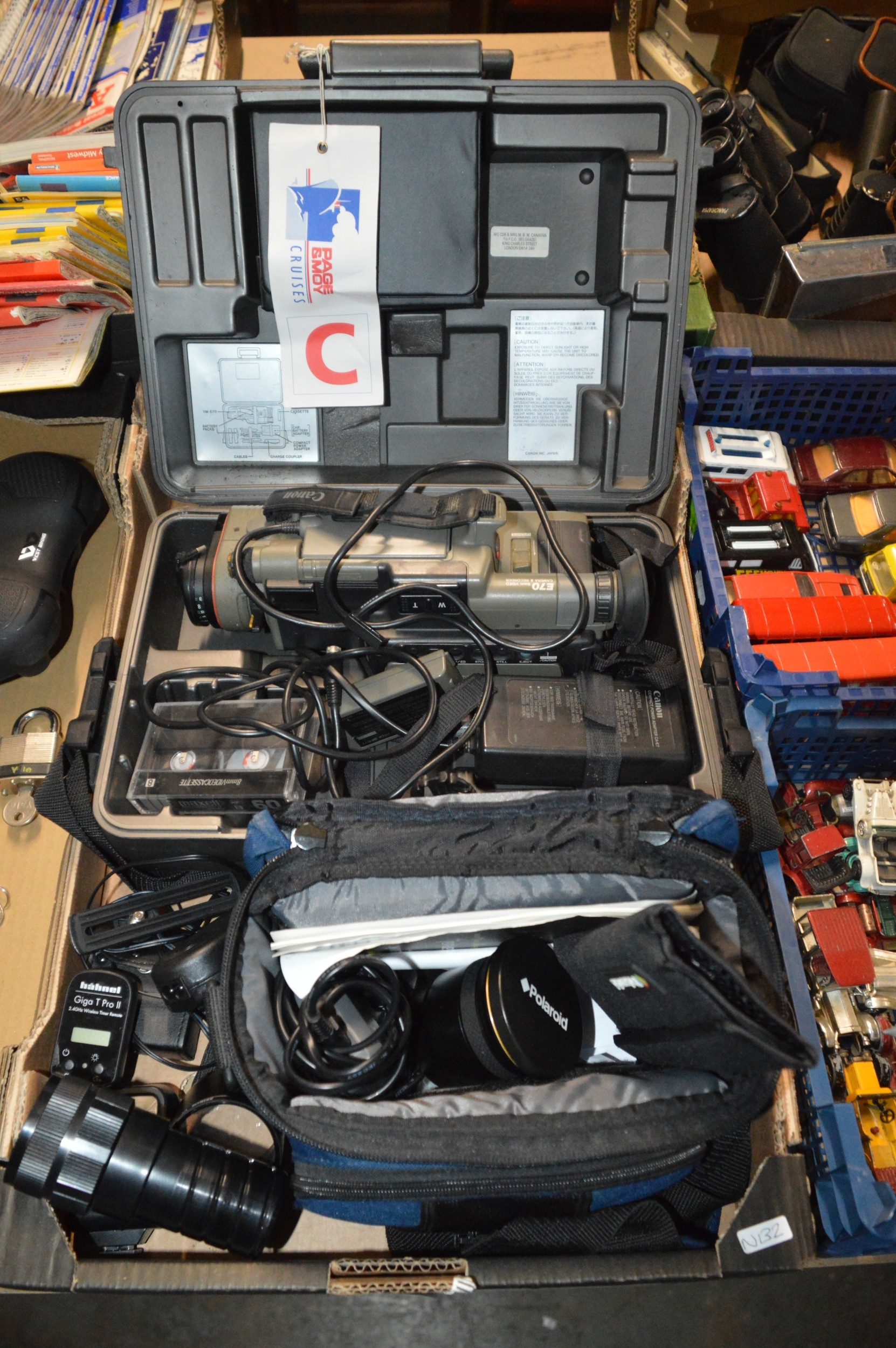 box of assorted camera equipment