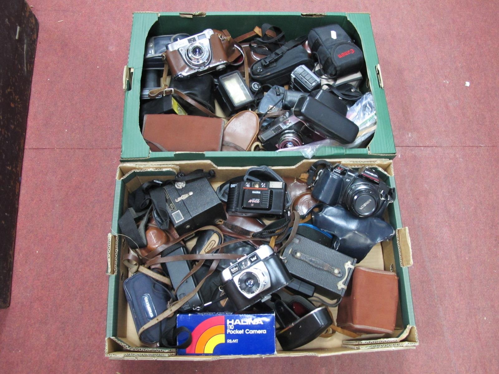 Cameras - To include many Kodak, Comet, Canon, Olympus and Minolta together with accessories, booklets and flashes:- Two Boxes