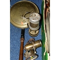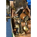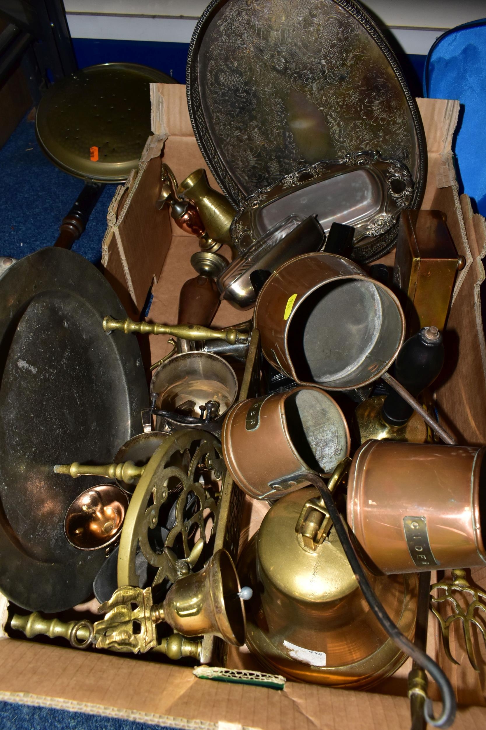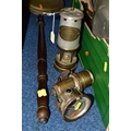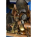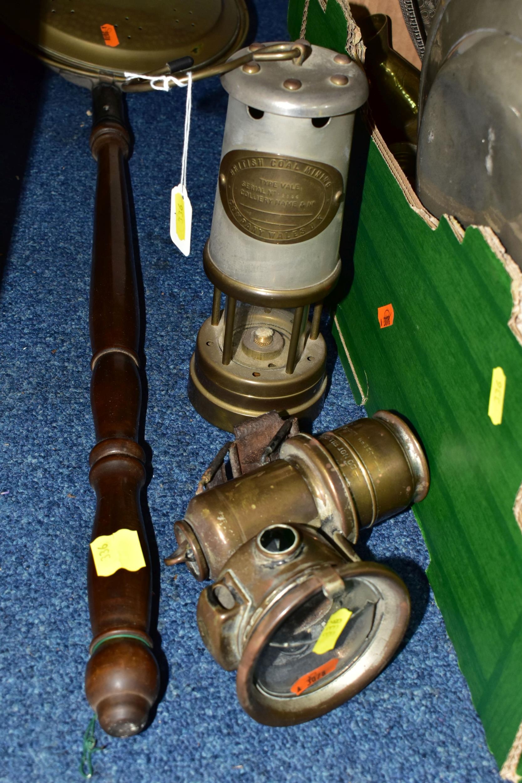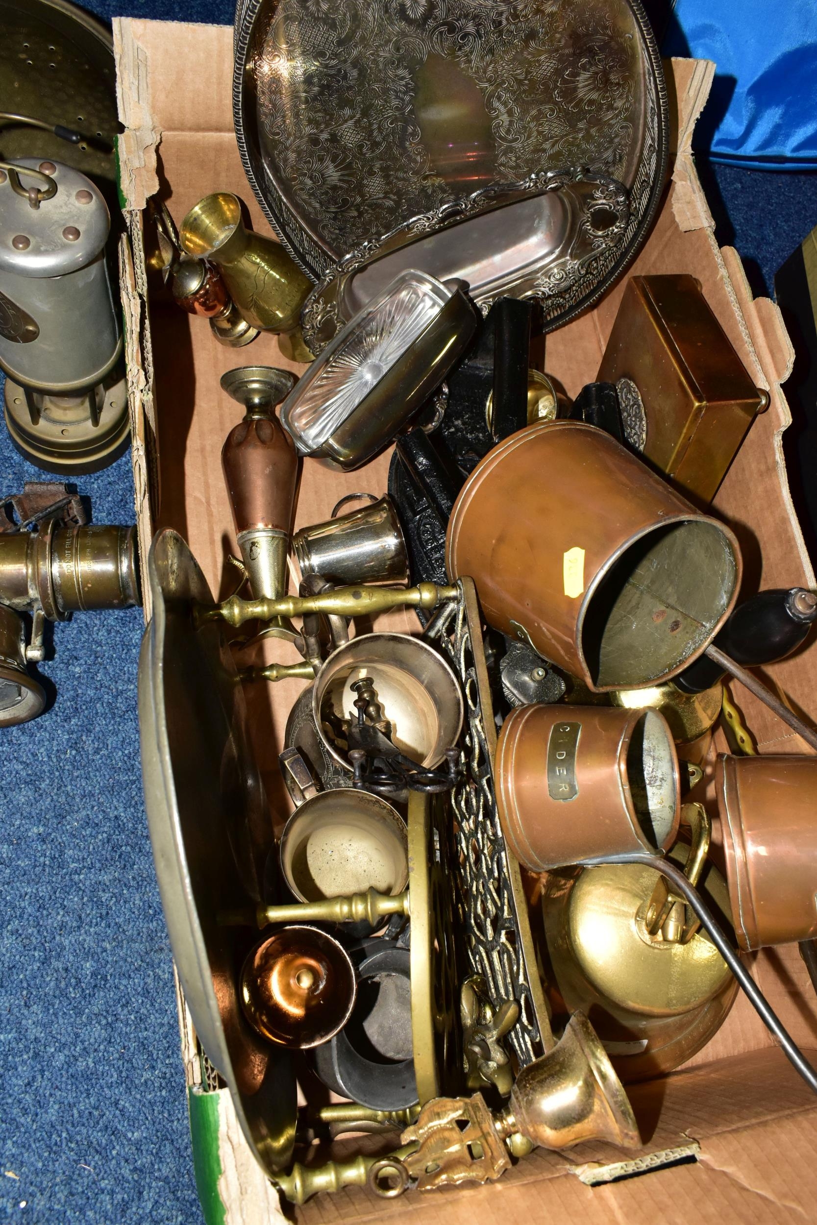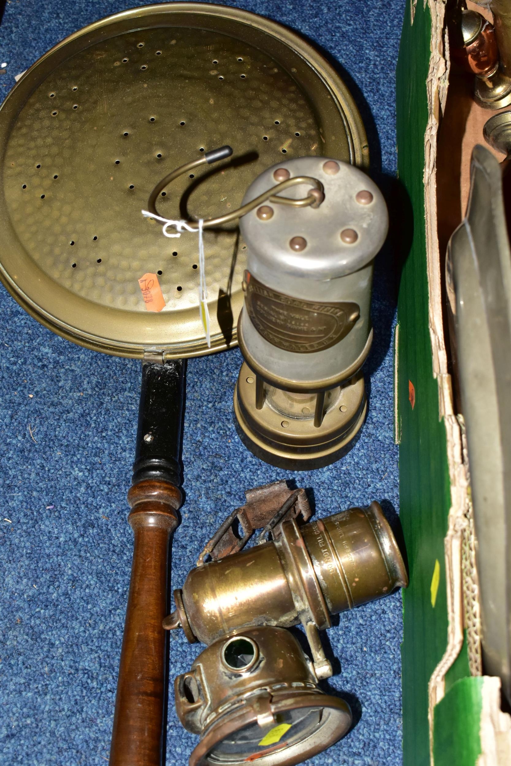 ONE BOX OF BRASS AND METALWARES, to include a vintage brass calcium carbide bicycle lamp, stamped Joseph Lucas Ltd - Birmingham (dented and glass cracked), a British Coal Mining Co. Wales UK miner's lamp Serial No.12106, an early pewter platter, brass bell, shoe horn, ship's bell, a Rothman's Ltd table cigarette box marked Pall Mall London, three cast irons, two brass trivets, three graduated copper cider measuring jugs, etc. (s.d) (1 box + loose)