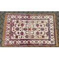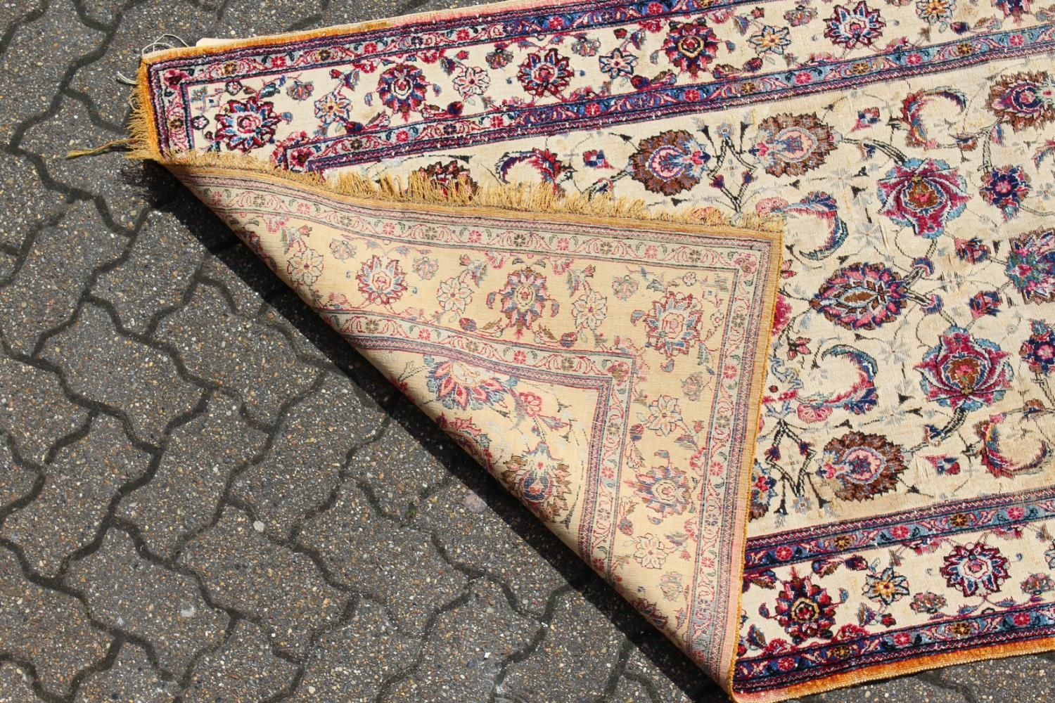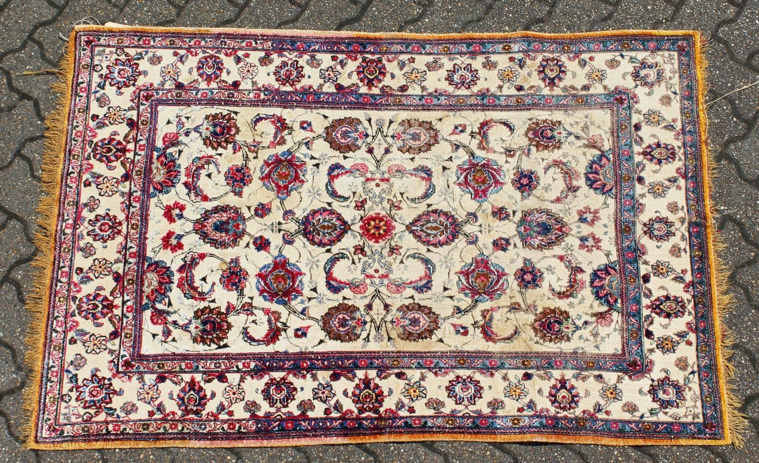 A GOOD SMALL SOUF KASHAN SILK RUG, beige ground with stylised palmettes, within a similar border.