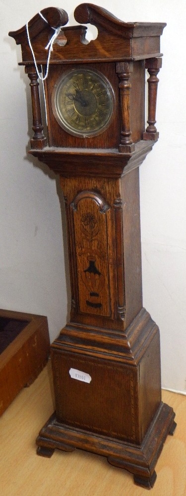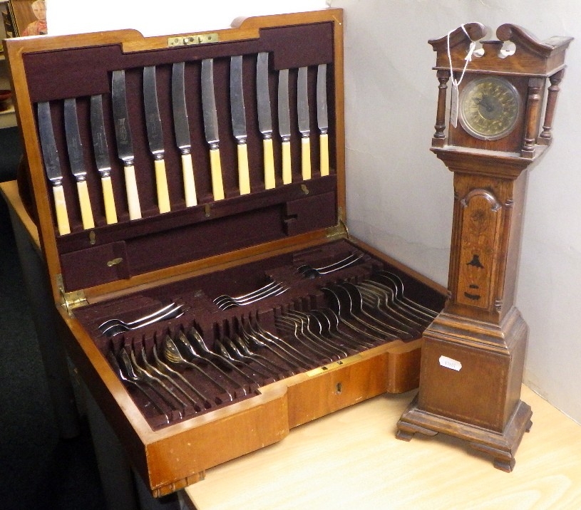 A part canteen of cutlery together with a miniature longcase clock (2)