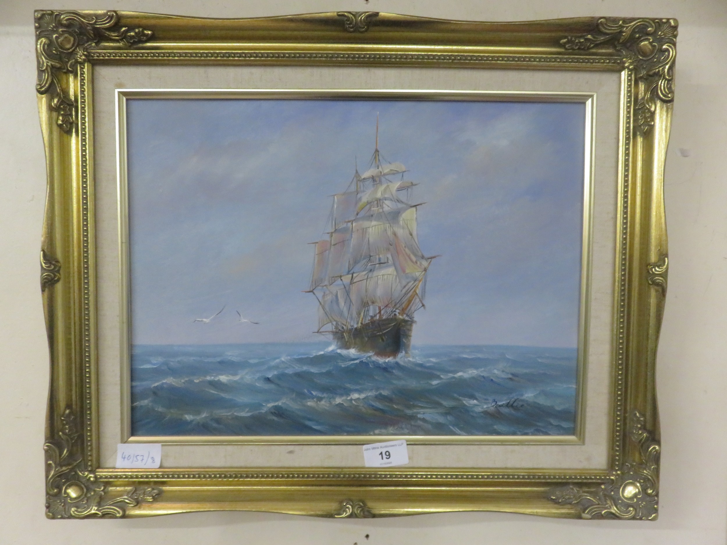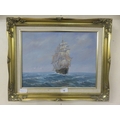 Gilt Framed Oil on Board - Ship at Sea - signed