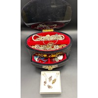 White metal table jewellery box decorated central scene of dancers, embossed case with four enamel roundels, velvet interior