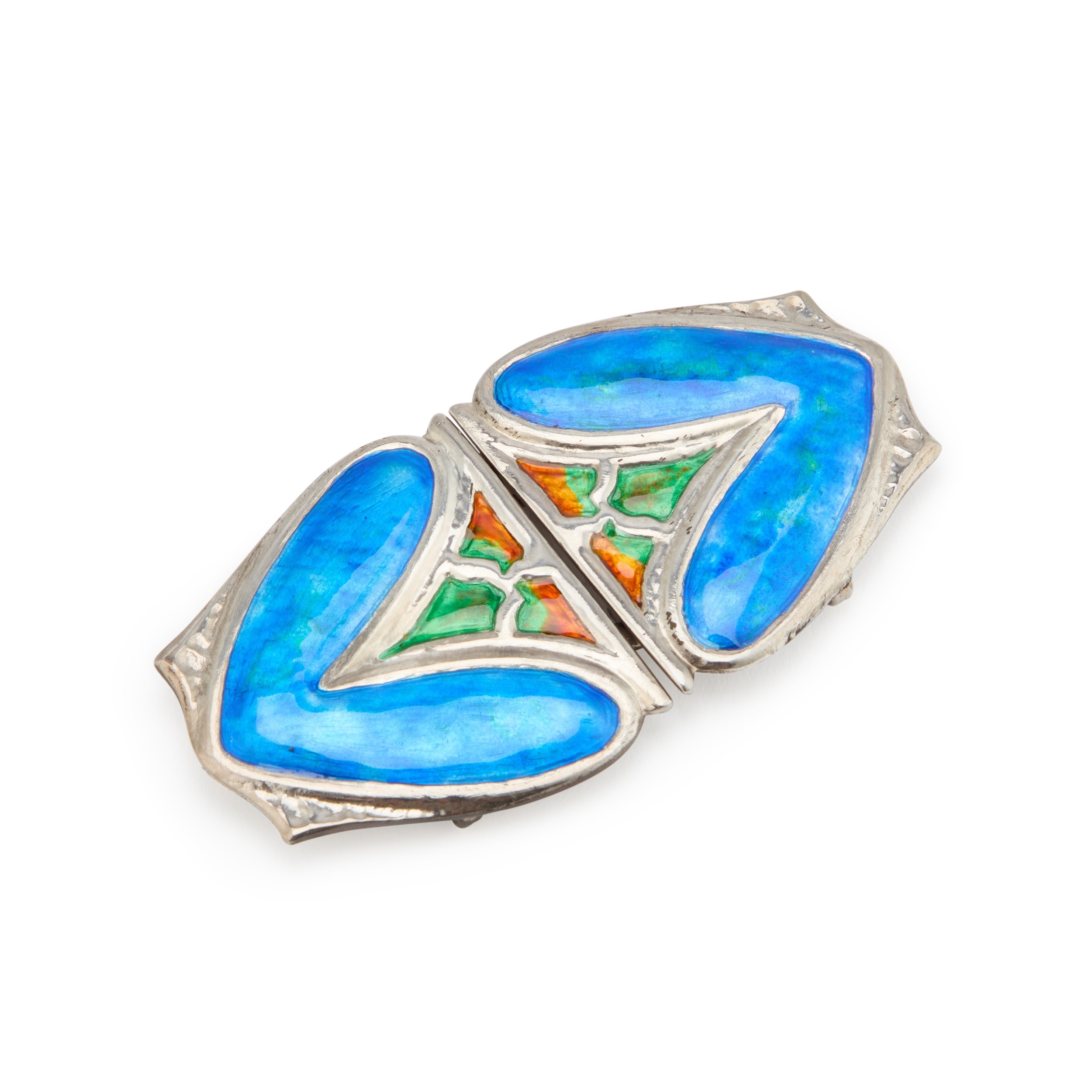 by Liberty & Co Ltd, Birmingham 1903, the two stylised sections decorated with orange, green and blue enamel, stamped CYMRIC. 8.5cm by 4.5cm, 45.5 grams