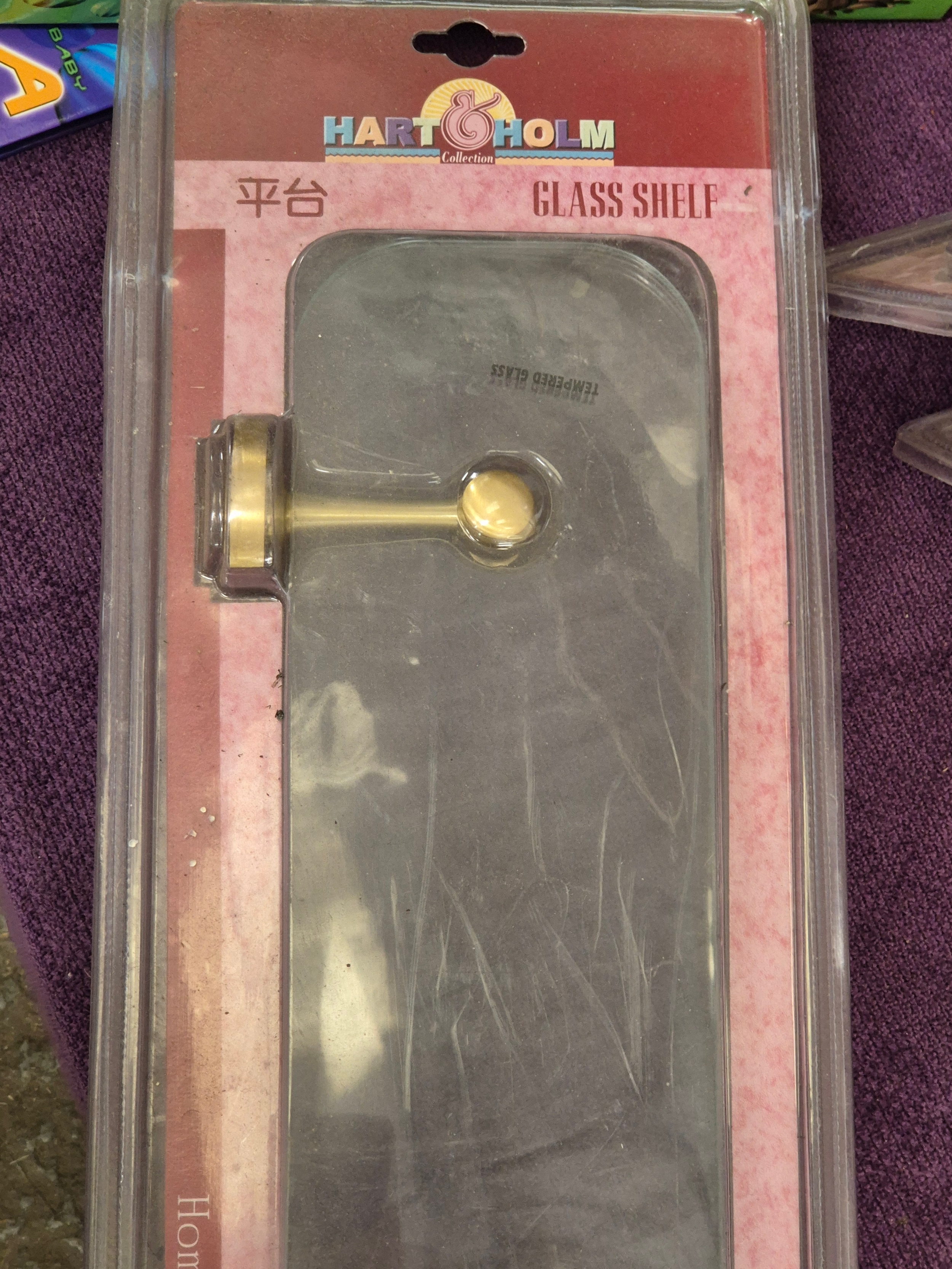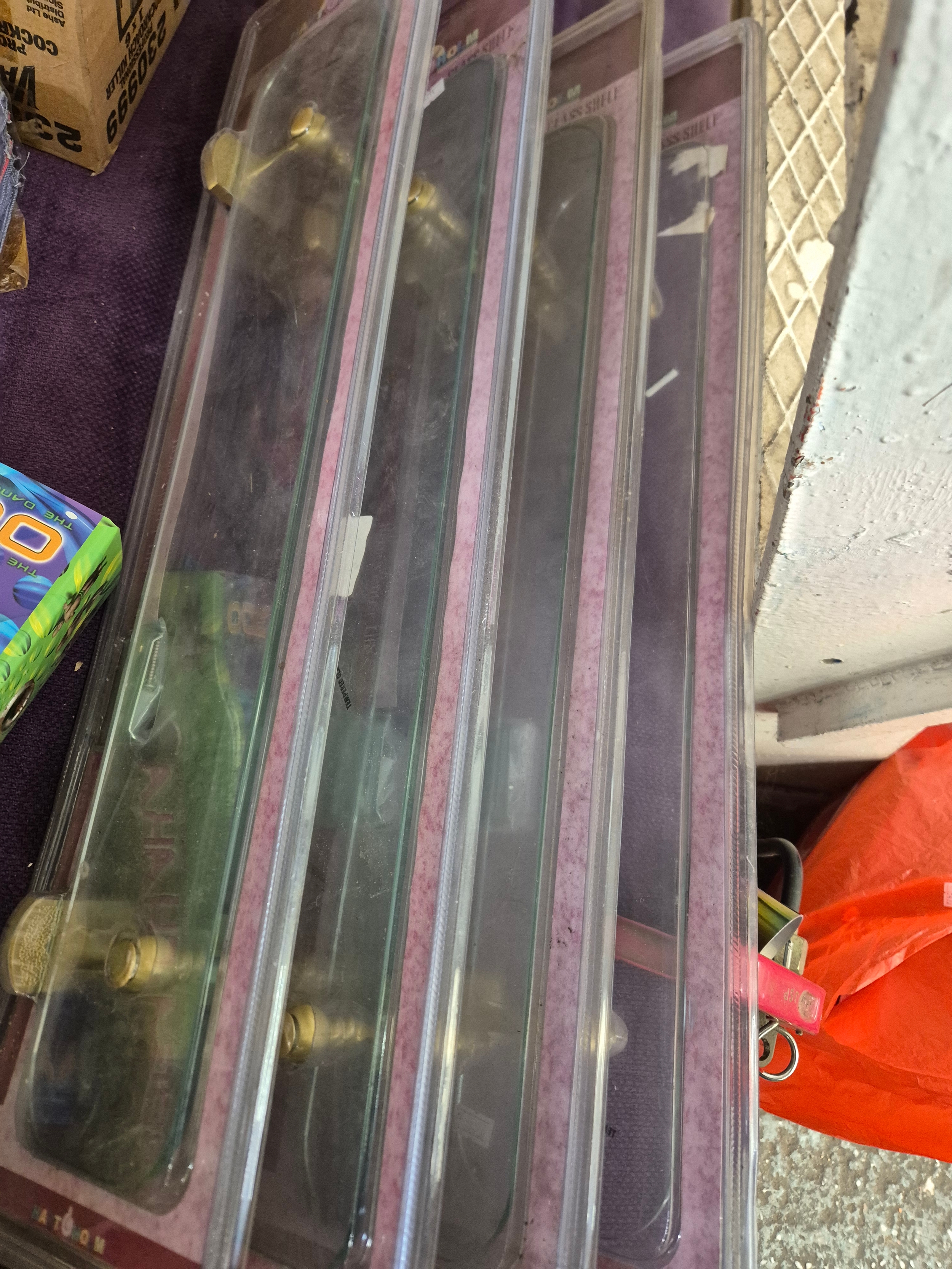 4 brand new glass shelves with brass coloured brackets