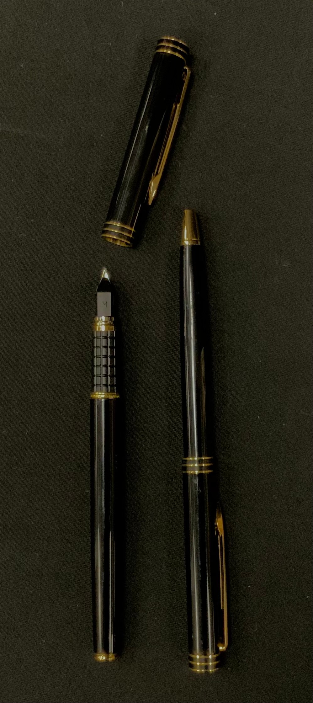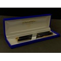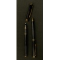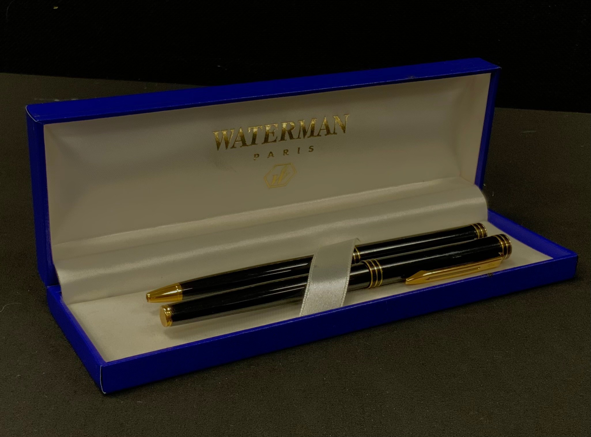 A Waterman Ideal Fountain pen and ball point two piece pen set, black and gold exteriors, , fountain pen nib marked Waterman Ideal, Paris, 18K, 750, boxed