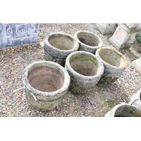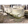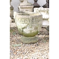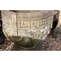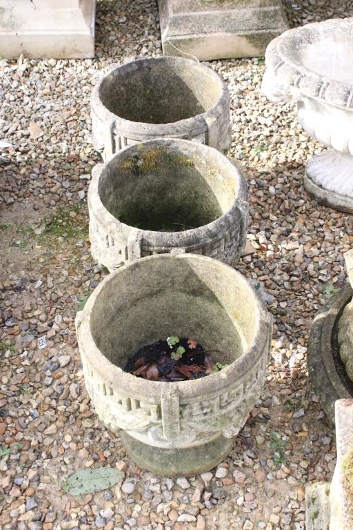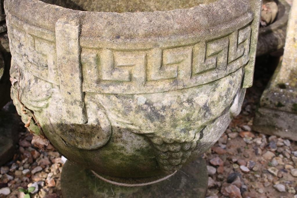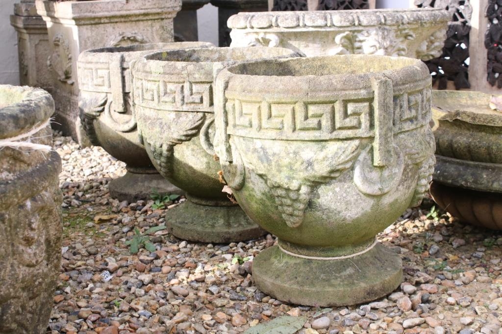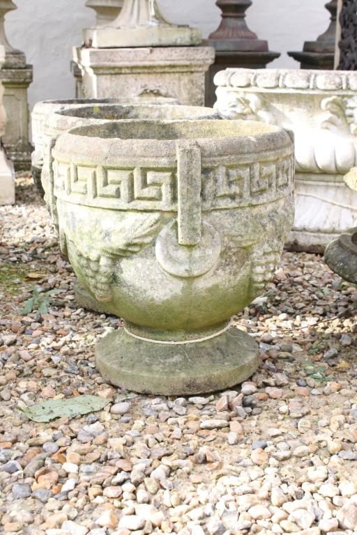 Set of three reconstituted stone planters with Greek key and grape decoration, raised on circular feet (approx 37cm high)