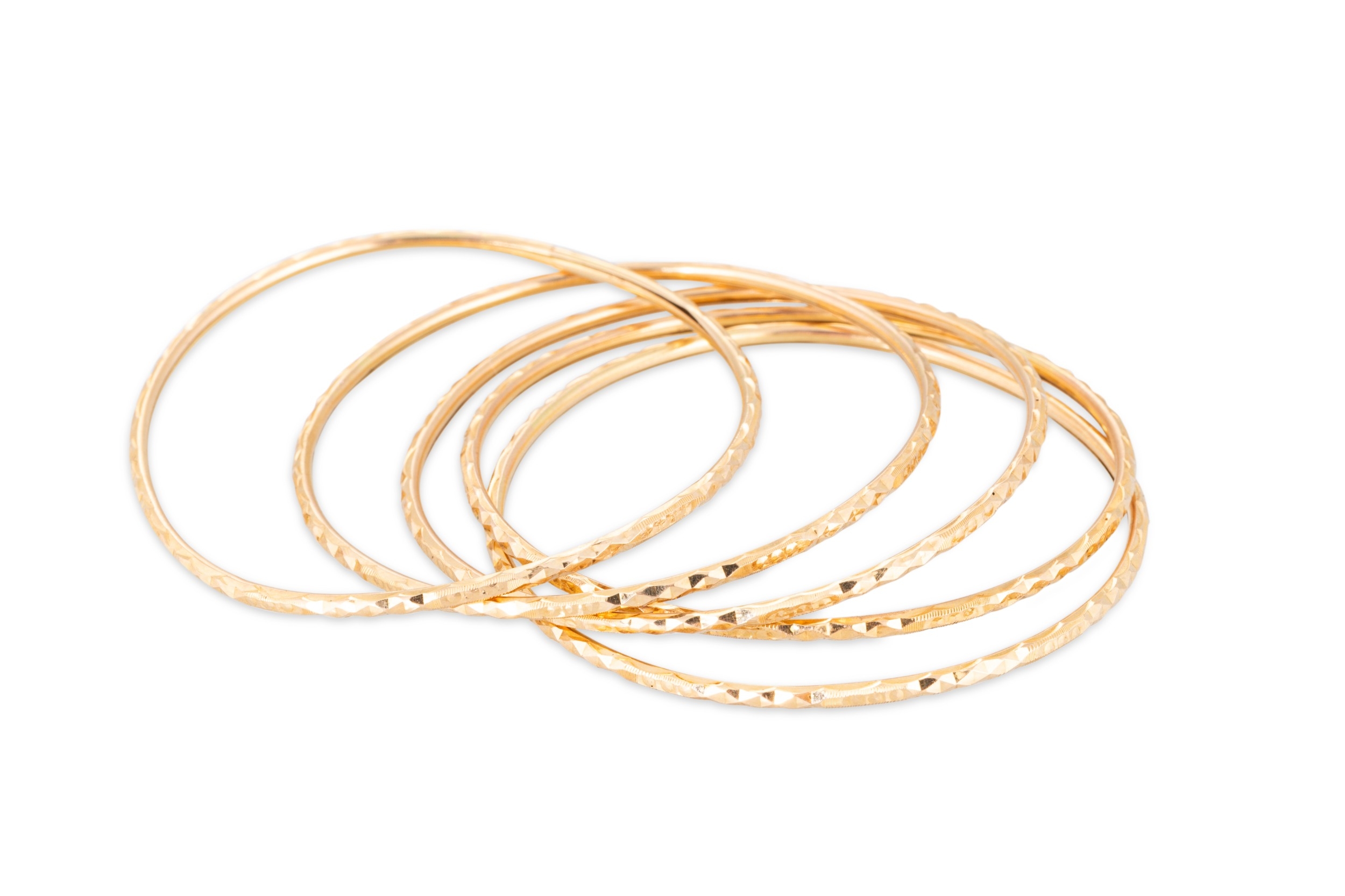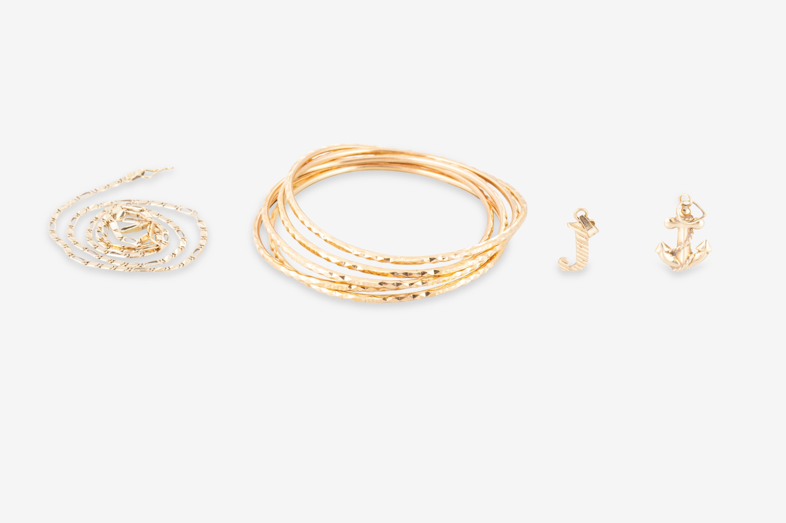 A COLLECTION OF GOLD JEWELLERY, 5 x baby bangles and a chain, 14ct gold 10.76 g., 2 x pendants 15 ct gold, 1.66 g.