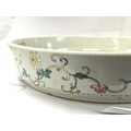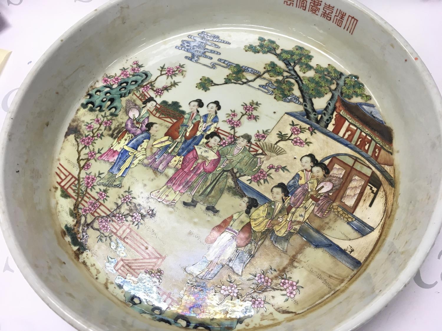 A Chinese Famille Rose Courtyard scene large dish , 41cm wide. No obvious large damage or restoration, some flaws in the glaze. This lot cannot be posted