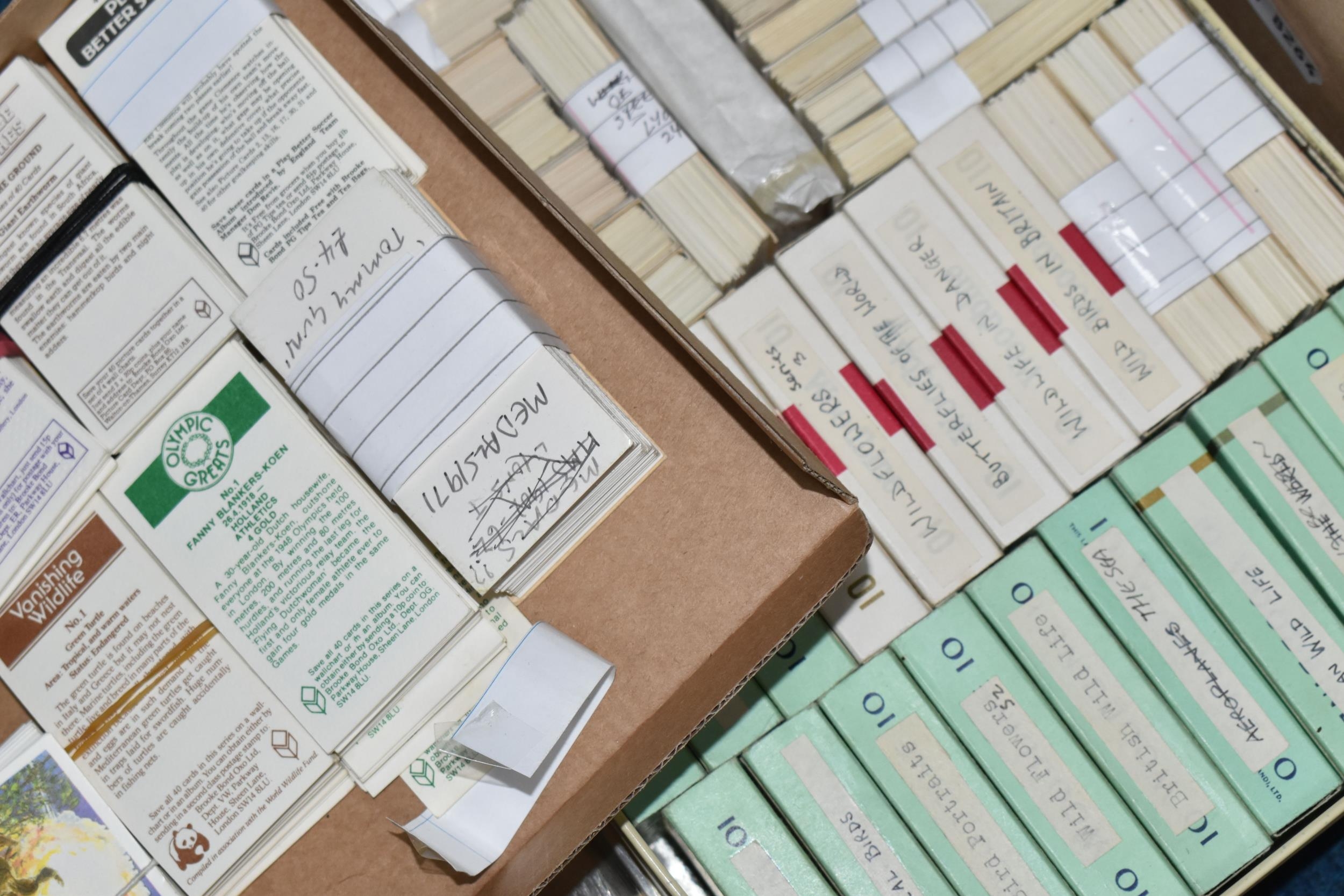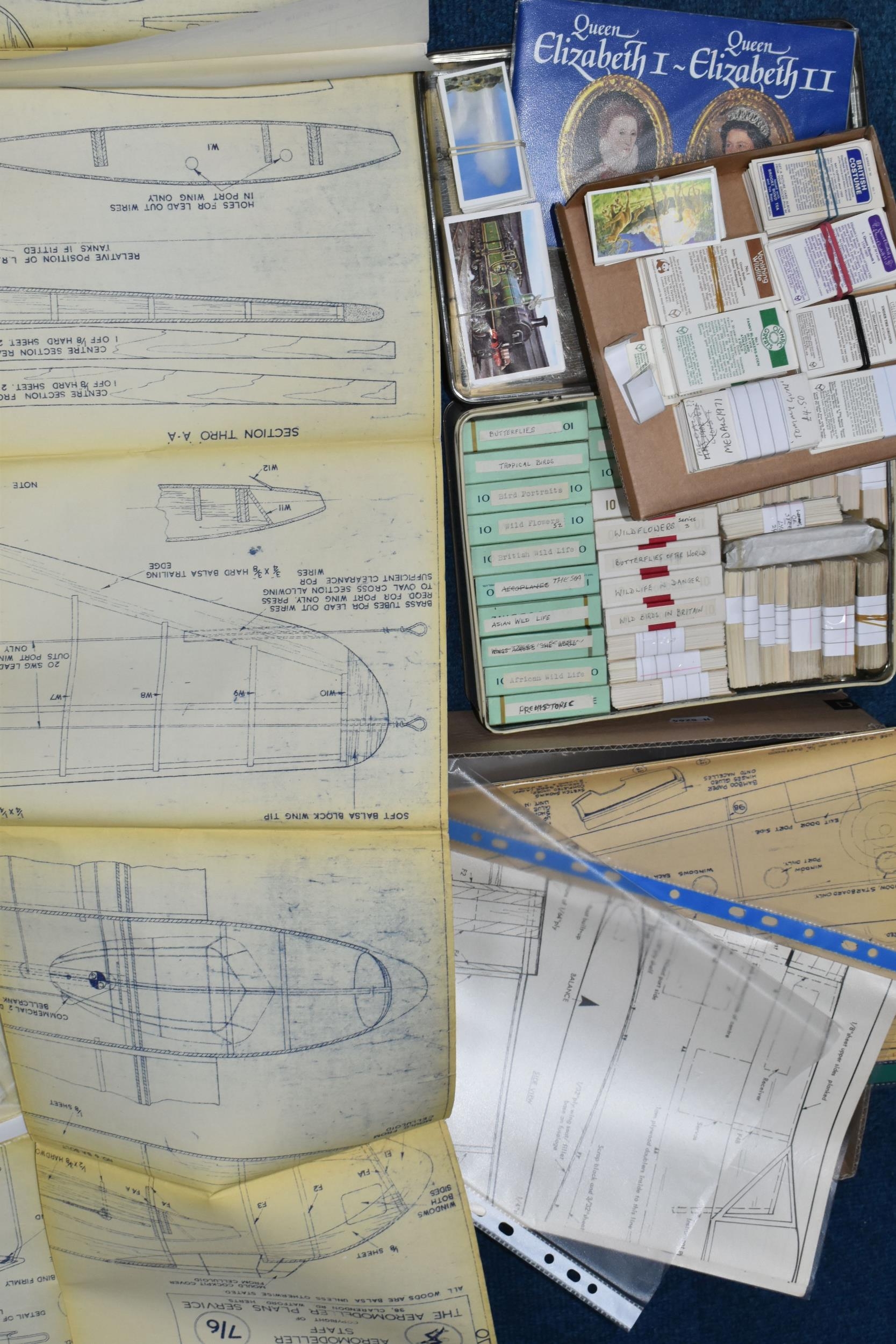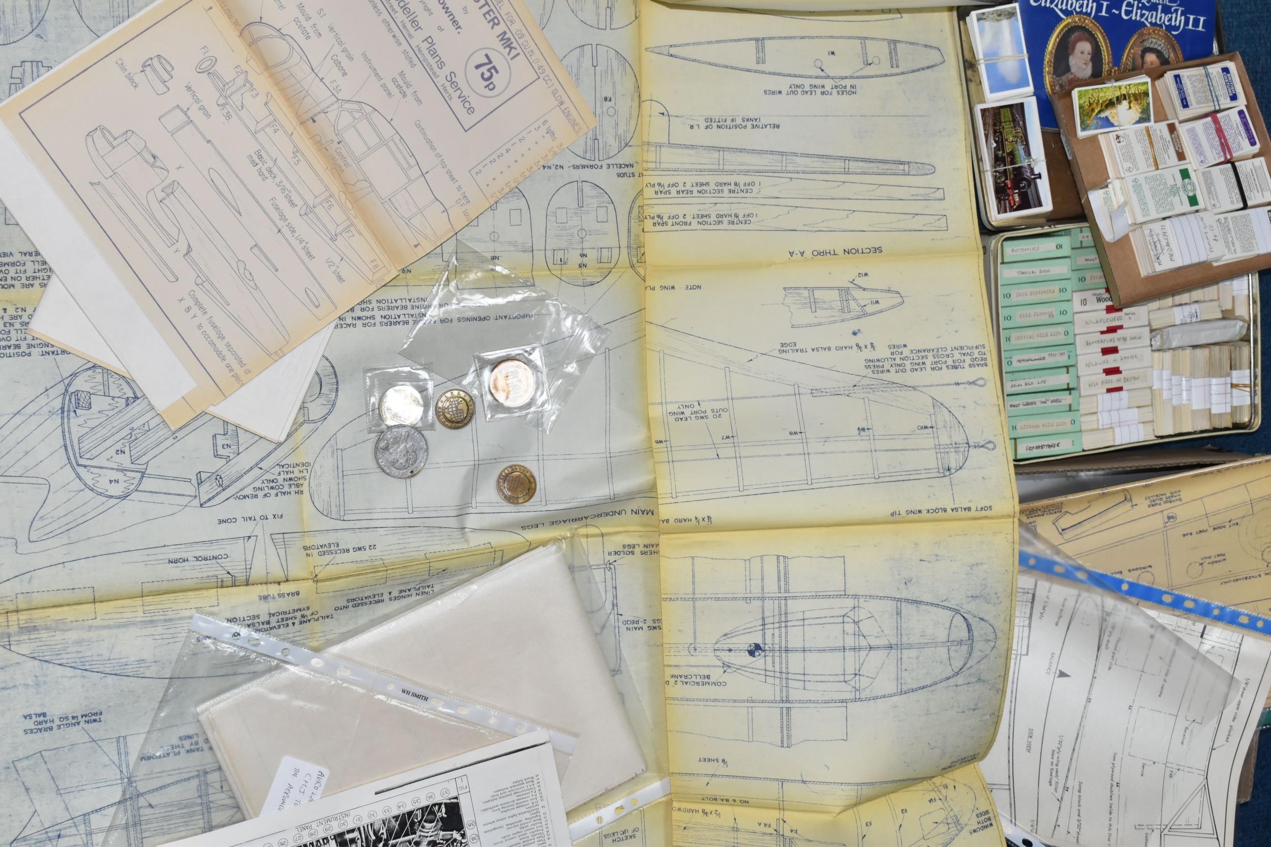 A QUANTITY OF ASSORTED TRADE CARDS, various Brooke Bond and other issues from the 1960's onwards, mixture of part and complete sets, some contained in old cigarette packets, quantity of model aircraft plans, small quantity of medals to include Aston Manor 1911 Coronation, printing plates for Railway Accident Prevention book