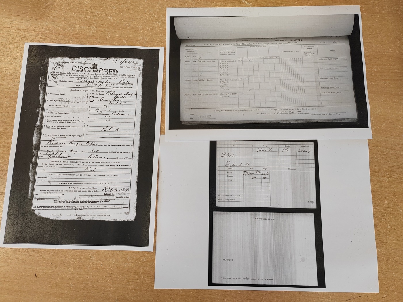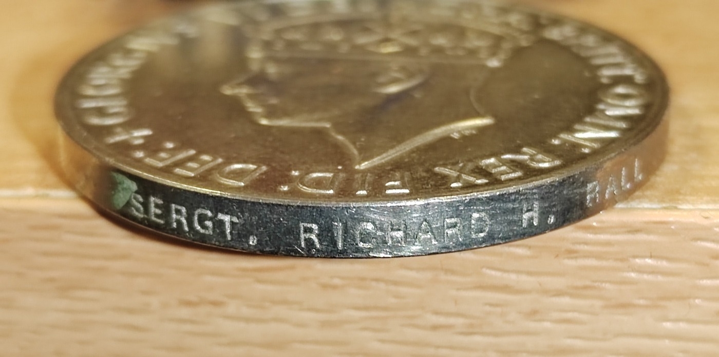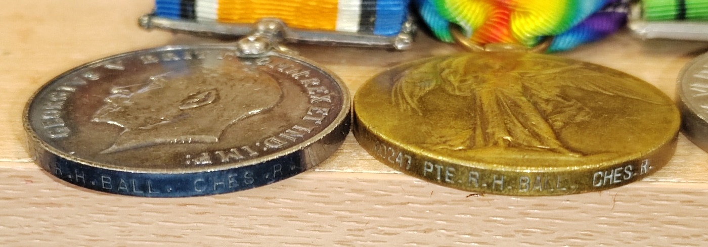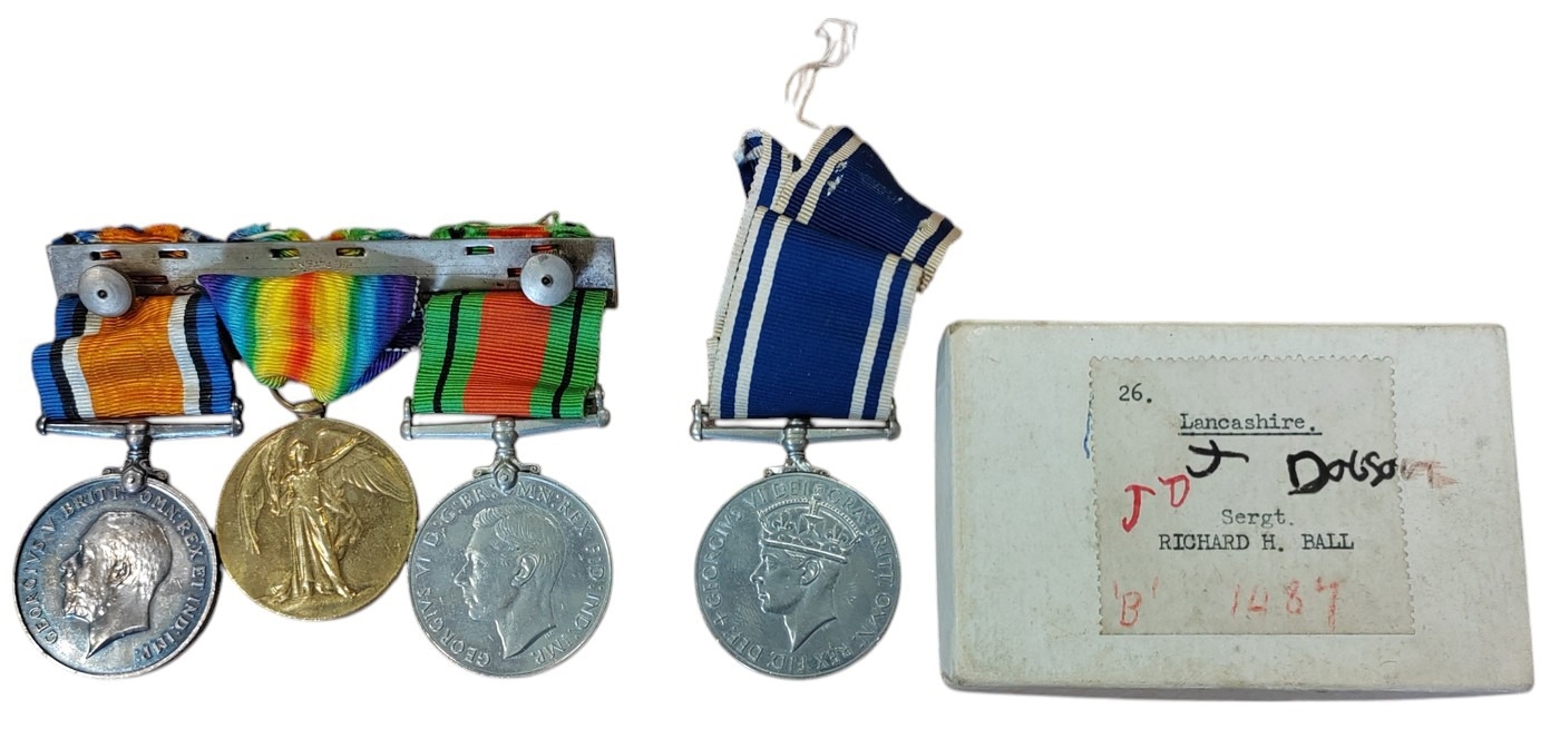 Medal group to Sergeant Richard Ball with WW1 BWM and Victory medal to 40247 Pte. R.H. Ball. Ches.R., WW2 Defence Medal swing mounted as worn plus George VI Police Exemplary Long Service Medal to Sergt. Richard. H. Ball with box of issue, copies of medal roll and discharge letter, mixed condition. (R)