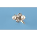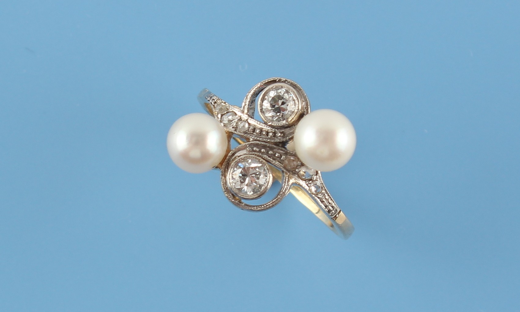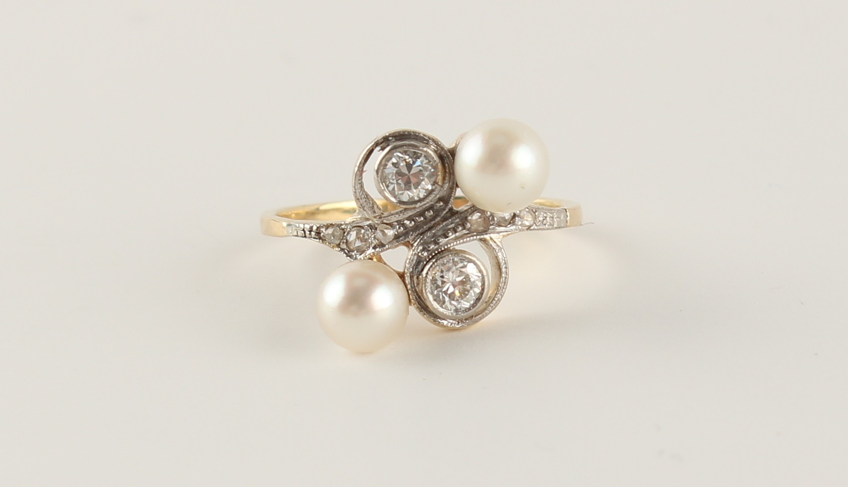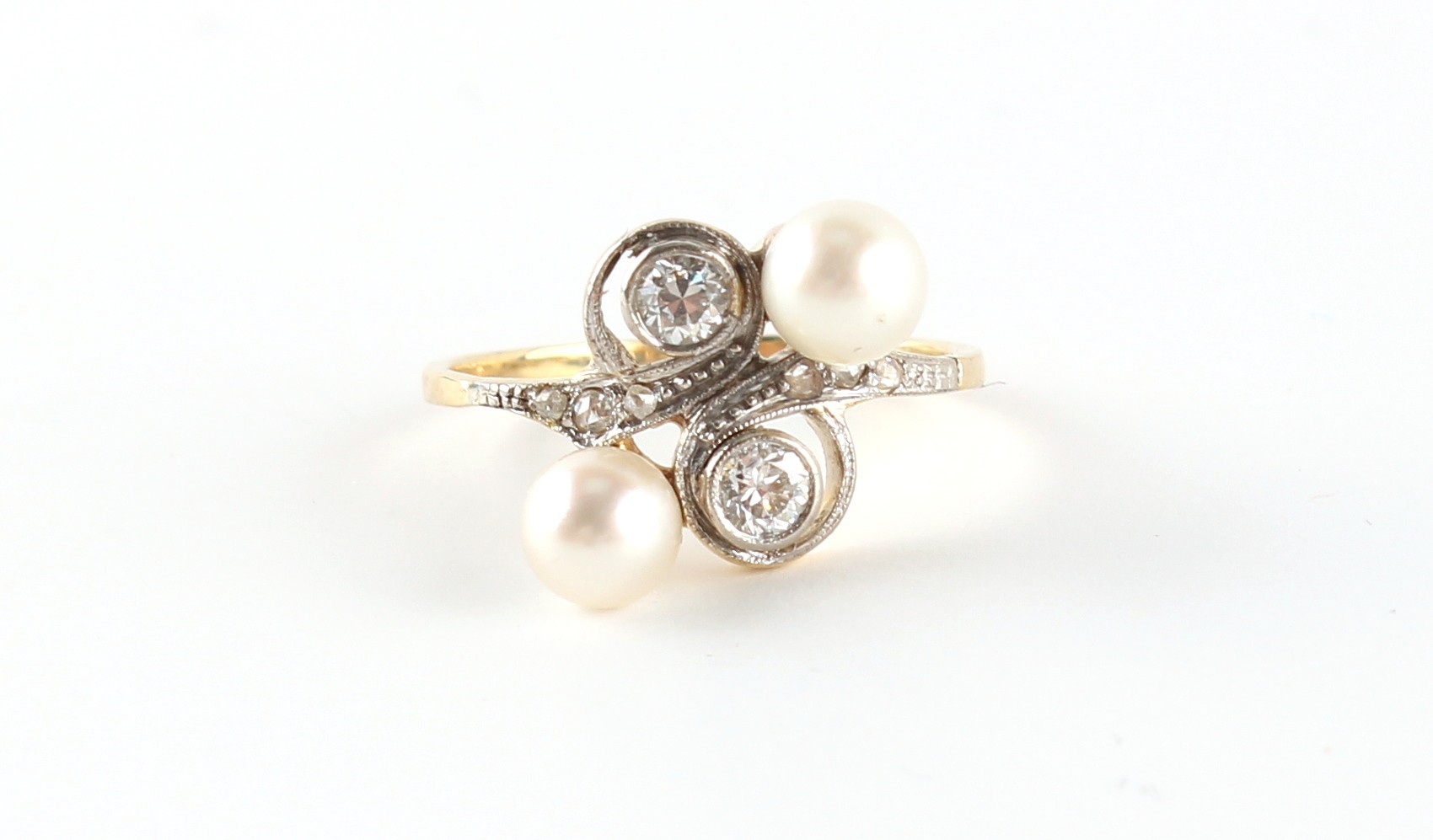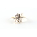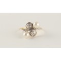 An unmarked yellow gold pearl & diamond crossover ring, with two round brilliant cut diamonds in millegrain collets & two pearls each measuring approximately 5.25mm diameter, with rose cut diamonds to the shoulders, size L.