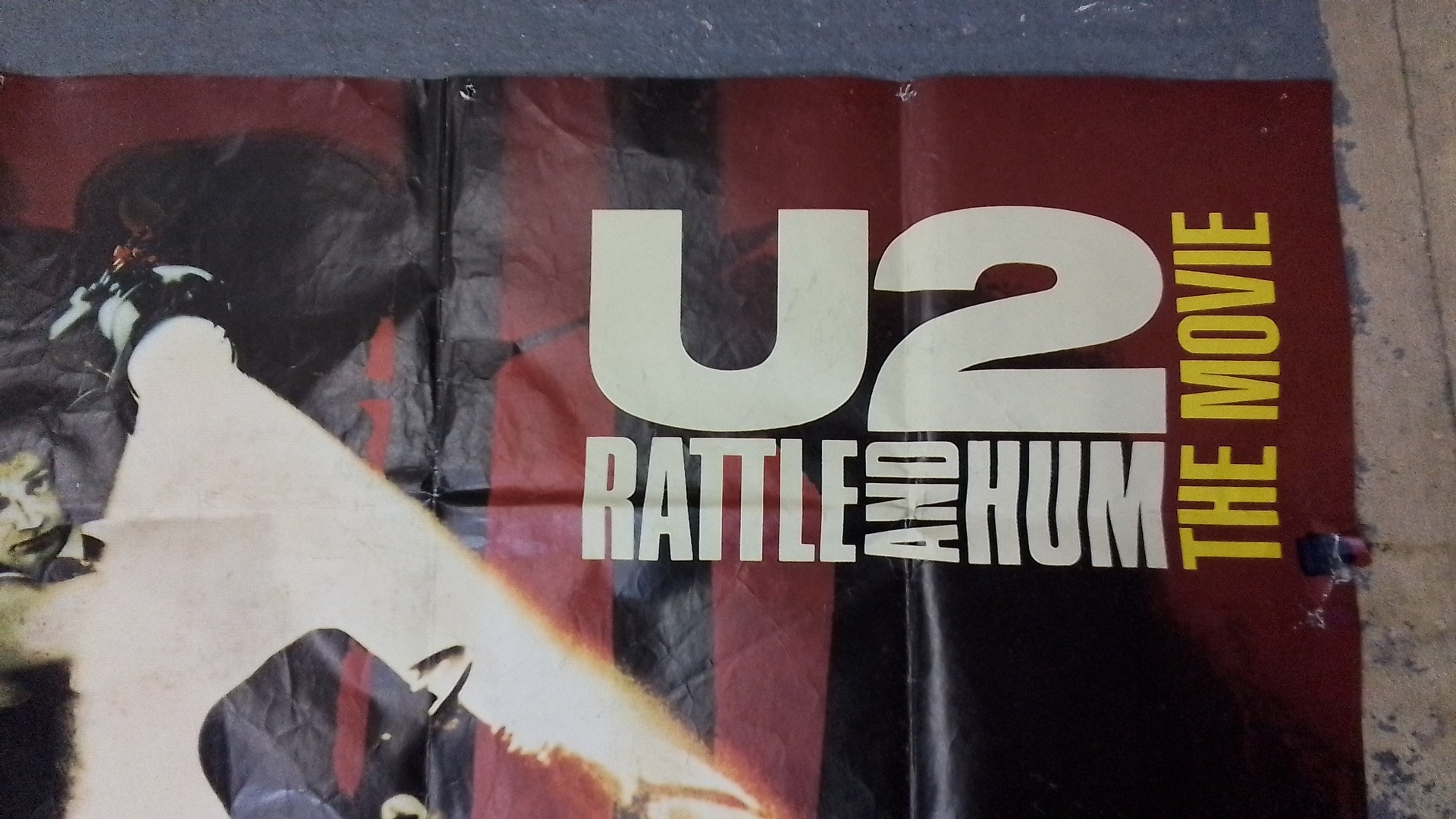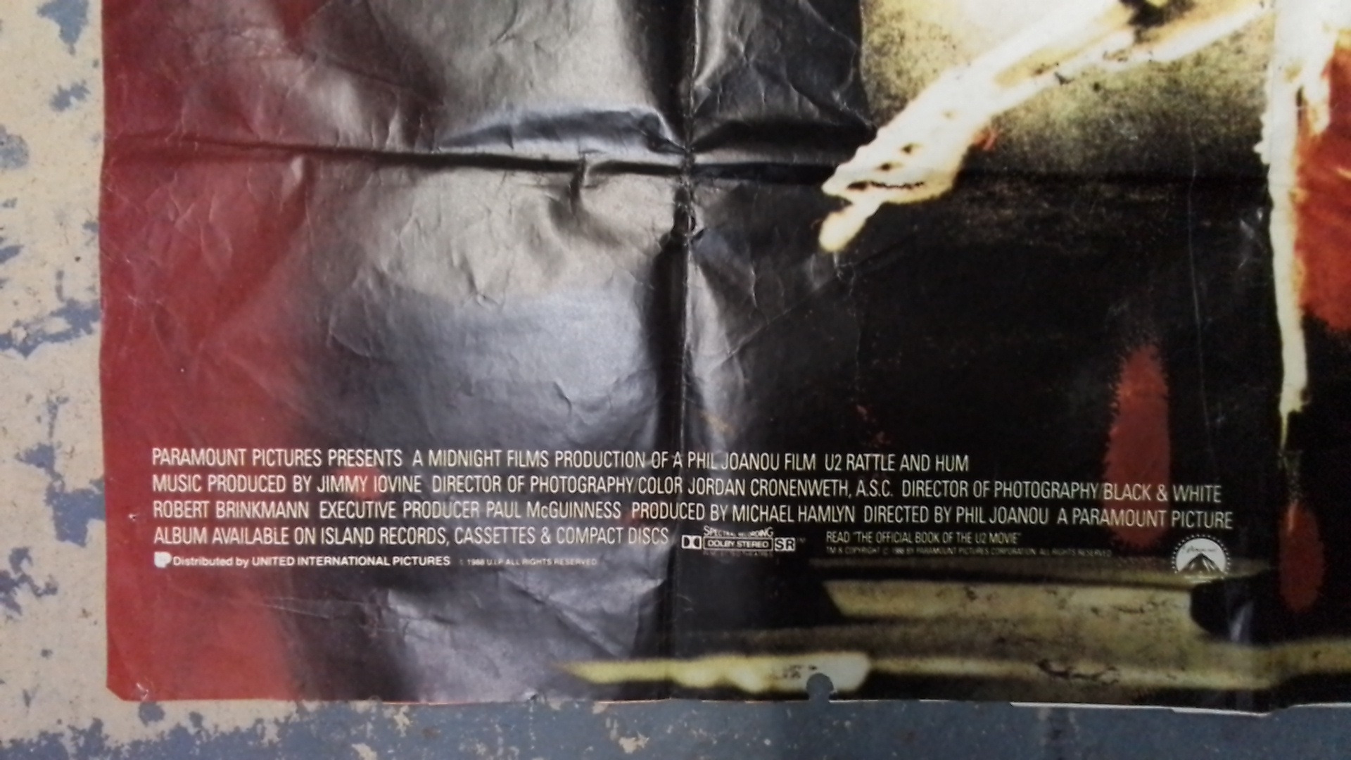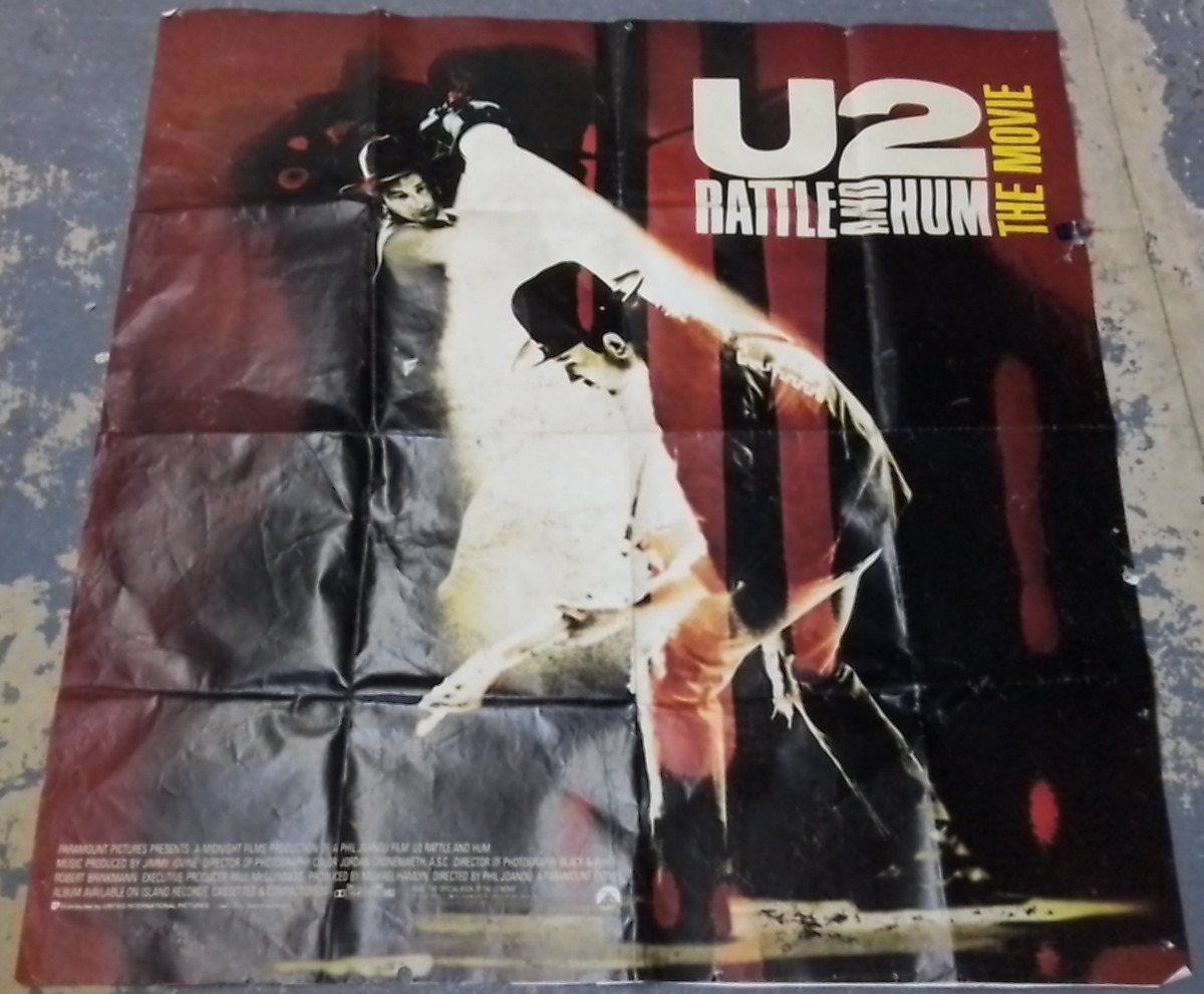 One original folded promotional poster for U2: Rattle and Hum – The Movie, Paramount Pictures/Midnight Films, with bold typographic title and concert imagery; printed credits and Dolby Stereo marks at lower margin.