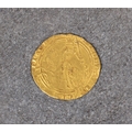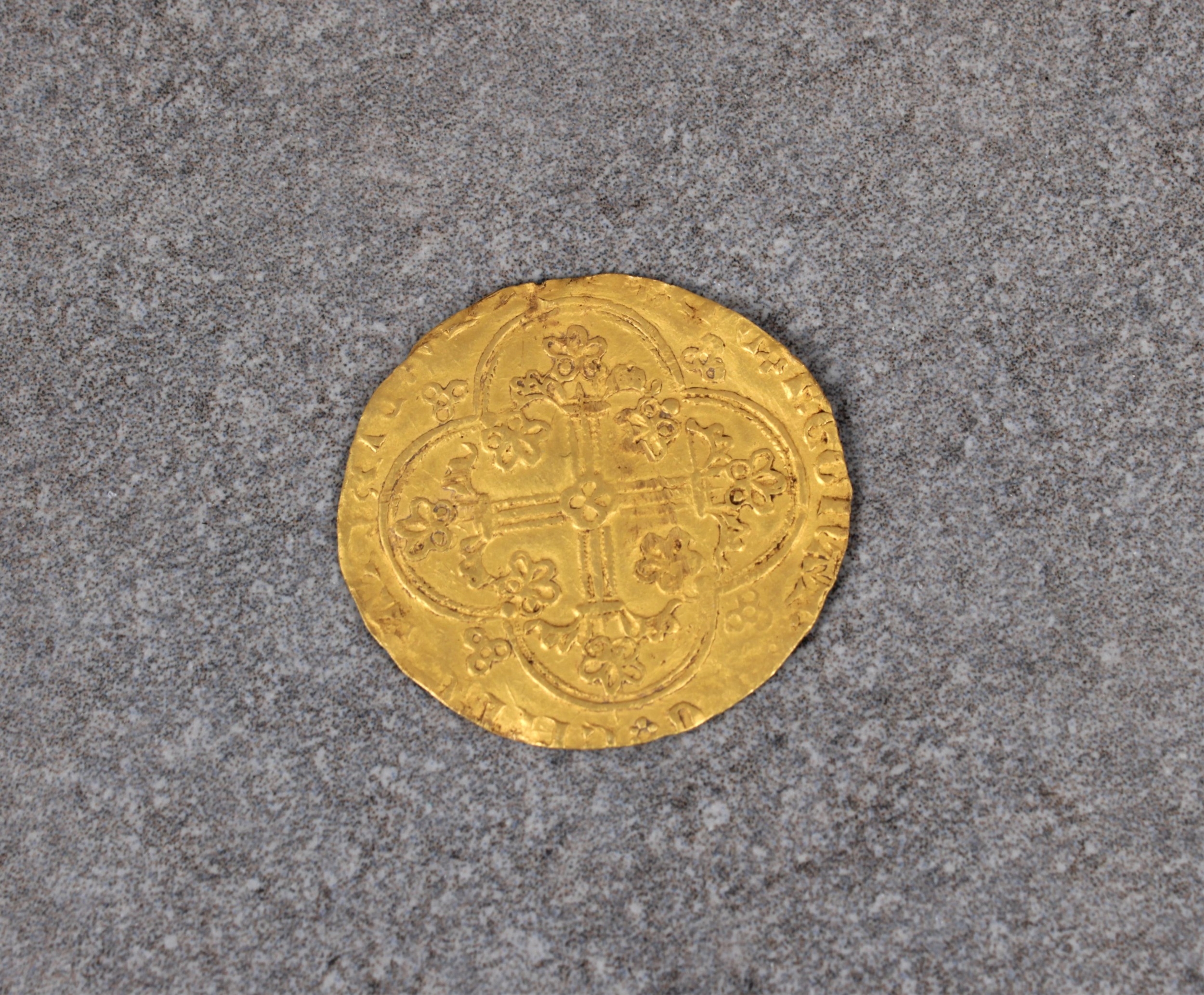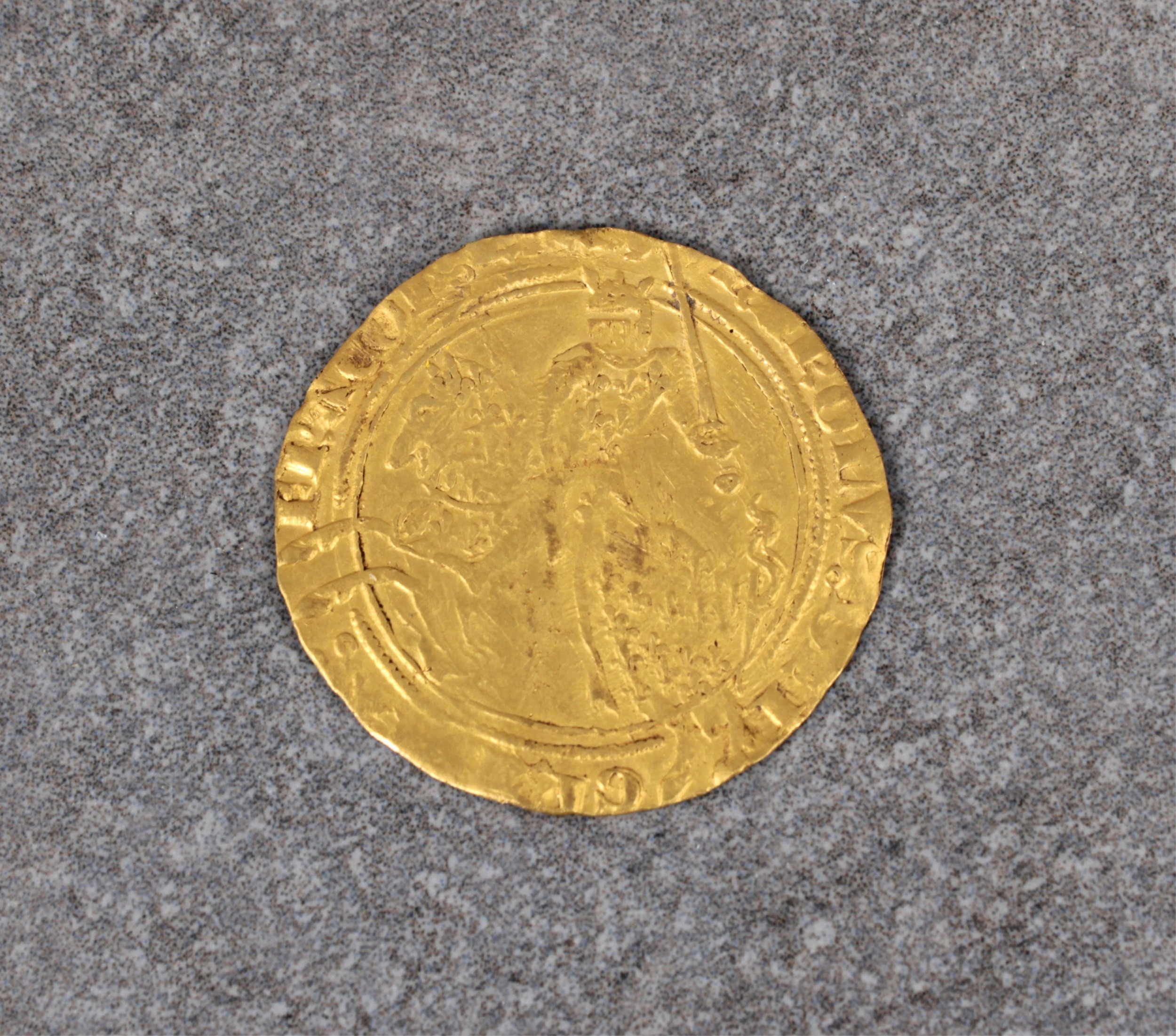 Numismatist interest - France, Charles V (1364-80), Franc cheval du Dauphin 3.8g, obverse - karolvs dei gracia fr-ancorv rex, king on horseback, galloping left, reverse - xpc vincit xpc regnat xpc imperat, cross fleury in quadrilobe, slightly irregular edge, 28mm diameter.