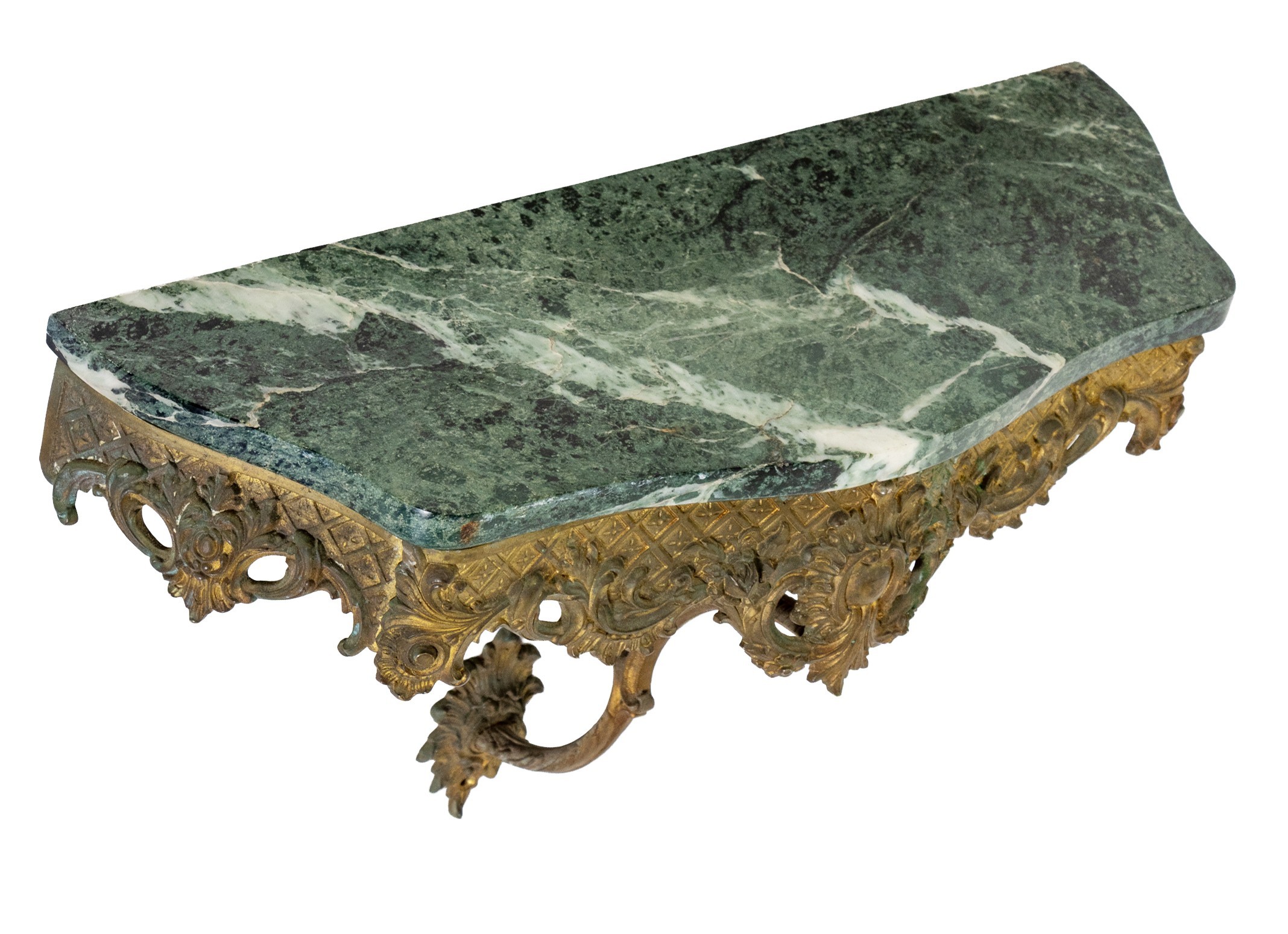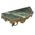The mottled green marble top above a pierced, foliate and scrolling frieze