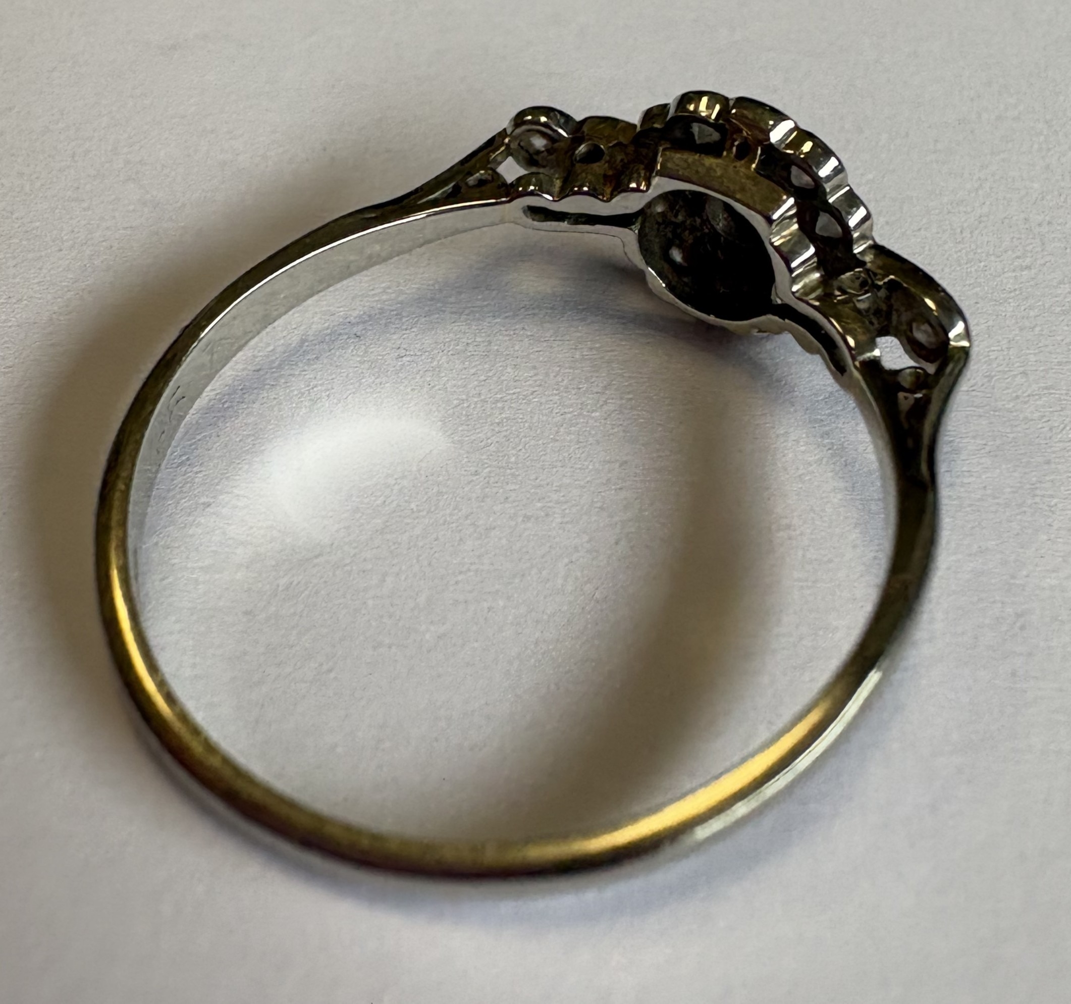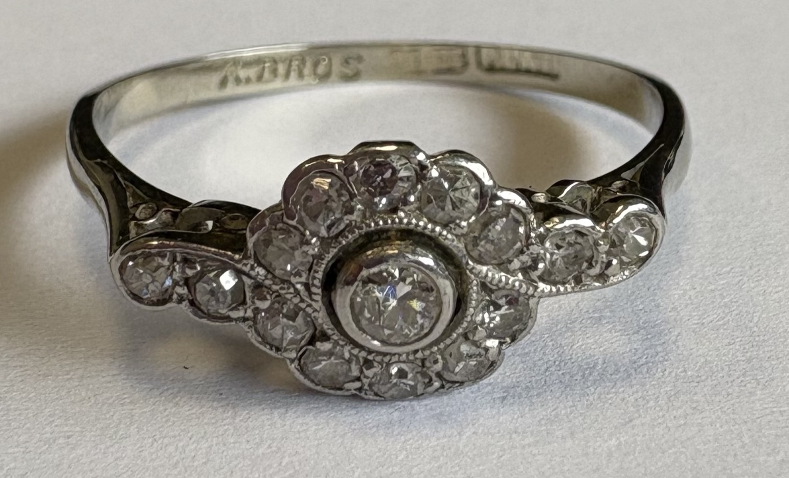 A small diamond daisy-head cluster ring in 18 carat white gold and platinum setting. Approx. 2 grams. Est. £100 - £150.