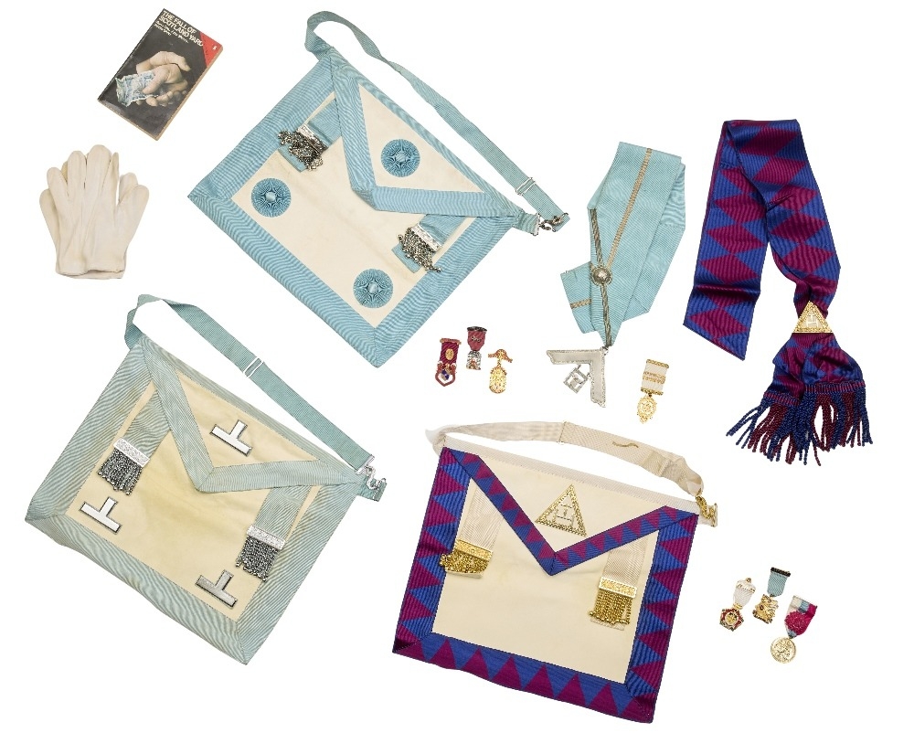 A collection of Masonic jewels and regalia once belonging to Bill Moody, 1960s, to include: a silver-gilt and gilt-metal Grand Lodge Masonic Charity Jewel, inscribed BRO A.W. MOODY SERVED AS STEWARD TO THE R.M.B.I. 1962 R.M.I.B. 1970 R.M.I.G. 1972, the reverse inscribed Honorable Testimonial of Masonic Charity and Benevolence Instituted by H:R:H: Aug Fred: Duke of Sussex M:W: Grand Master; a gilt and enamel steward badges; a Royal Arch Chapter; two collars, including one with silvered square inscribed IRENIC LODGE No. 4797 / PRESENTED TO W. Bro. ALFRED W.MOODY In appreciation of his services as W.M. 1966-67; a pair of white gloves; three aprons; and a book The Fall of Scotland Yard, Barry Cox, John Shirley, Martin Short, Penguin Books, 1977