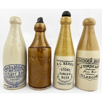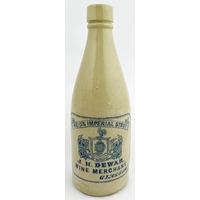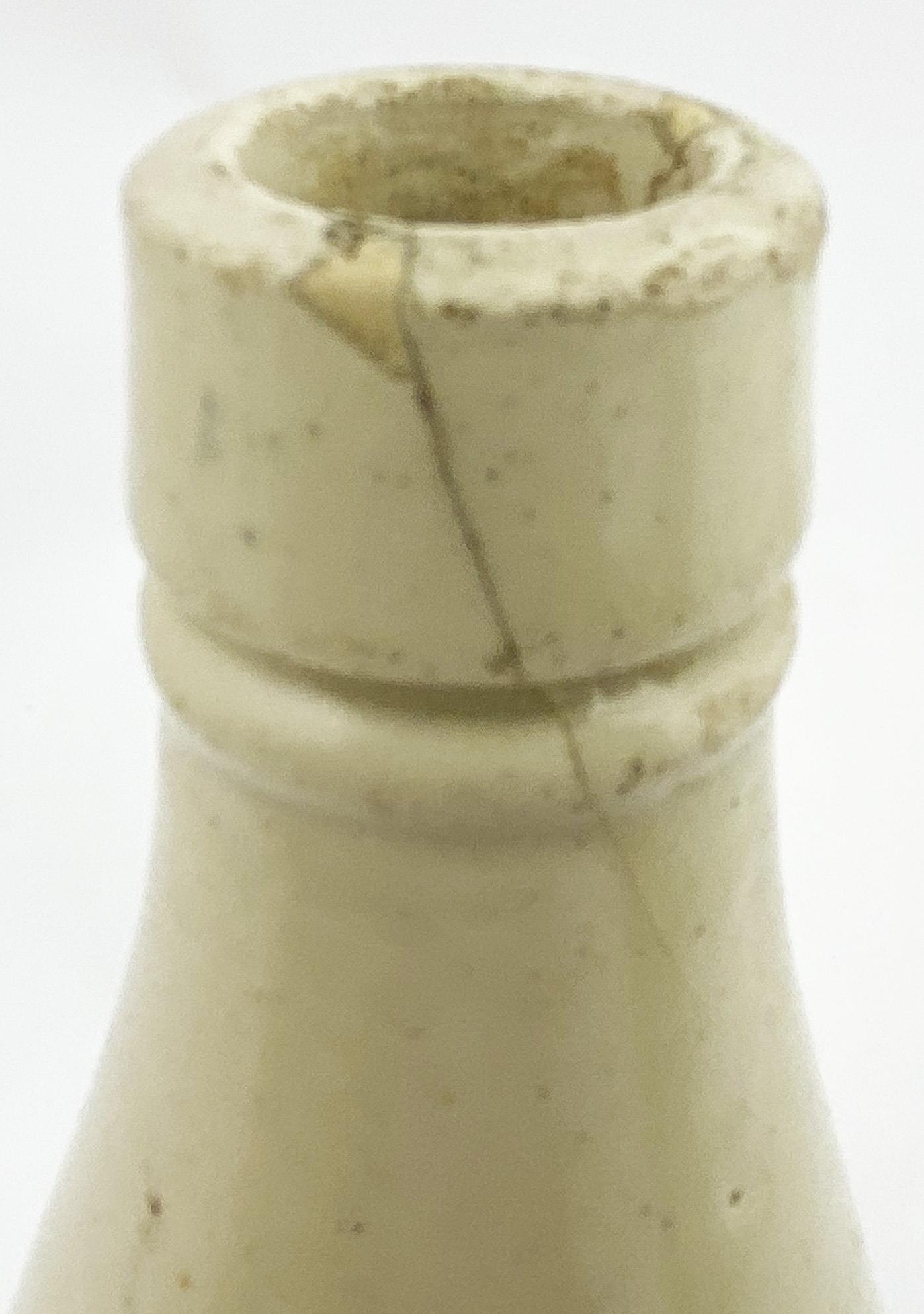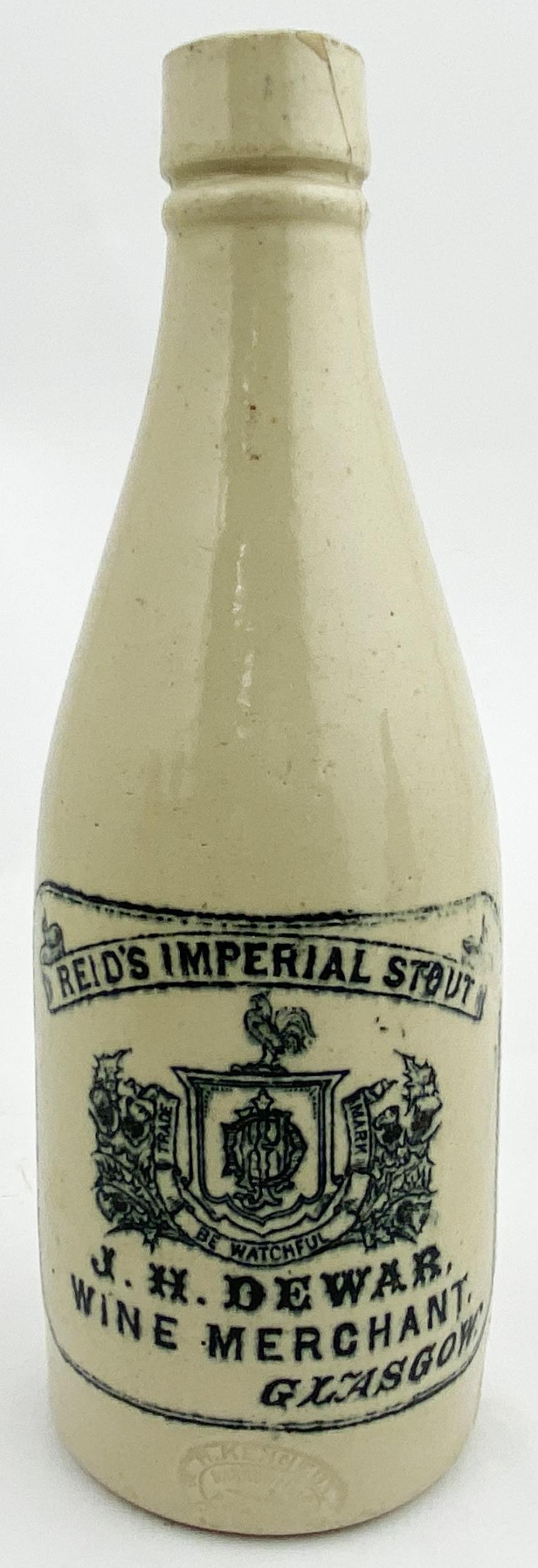 GLASGOW GINGER BEER BOTTLE. 8.7ins tall, stumpy ch. shape, all white, chisel cork lip (side hairline & pinhead repair). REIDS IMPERIAL STOUT/ J H DEWAR/ WINE MERCHANT. Kennedy p.m. Angelo Maloco Collection. Very rare.