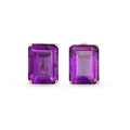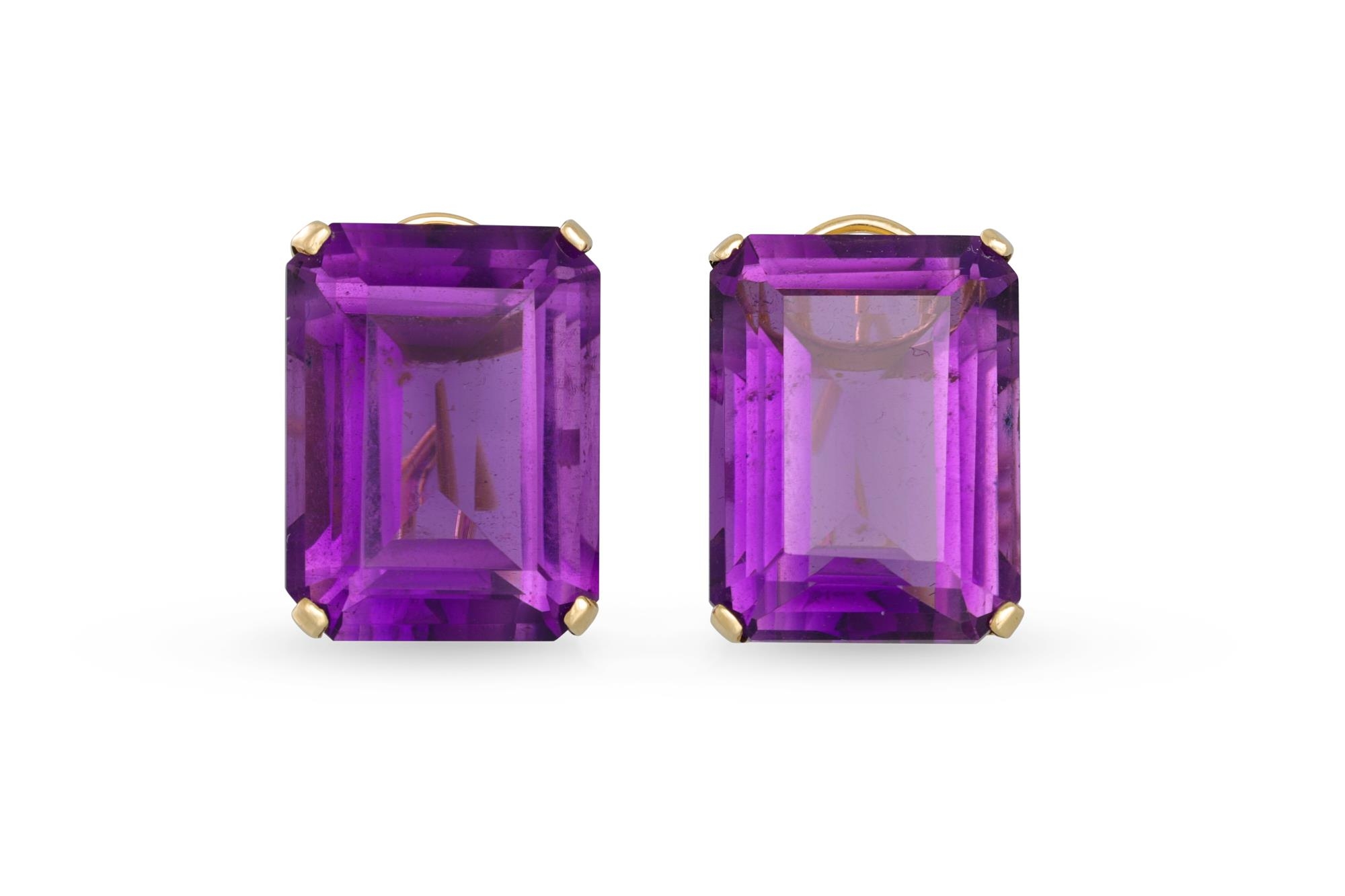 A PAIR OF AMETHYST EARRINGS, set with rectangular amethysts, mounted in 14ct yellow gold