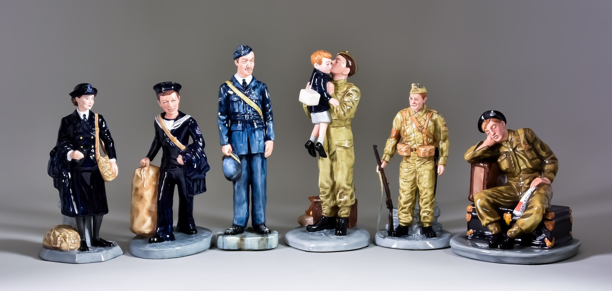 Five Royal Doulton Limited Edition "Classics" Figures, 20th Century, comprising - The Railway Sleeper HN4418 No.20/2500 7.5ins high, Home Guard HN4494 No.615/2500 9ins high, Women's Royal Navy Service HN4498 No.217/2500 8.75ins high, Sailor HN4632 No.105/2500 8.75ins high, Farewell Daddy HN4363 No.286/2500 10.5ins high, and a "Prestige" figure - RAF Corporal HN4967 No.78/2500 10.5ins high