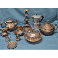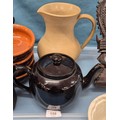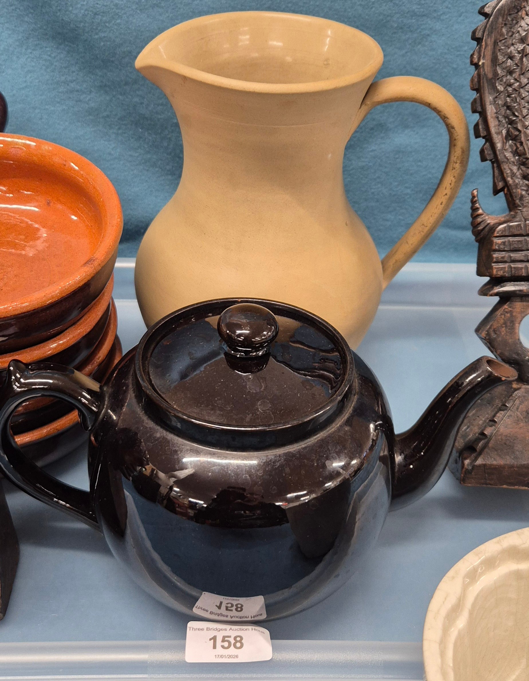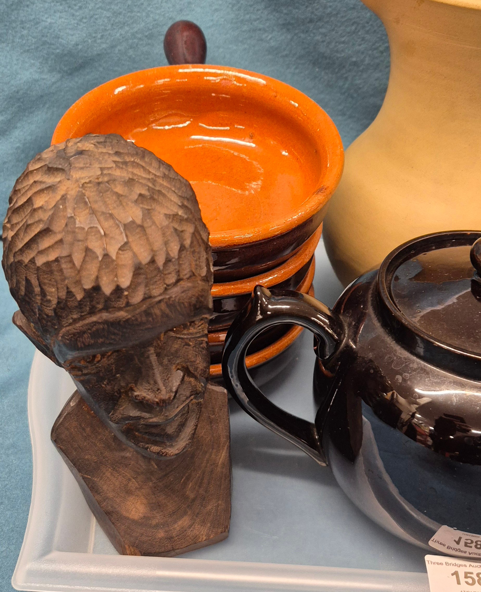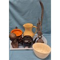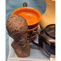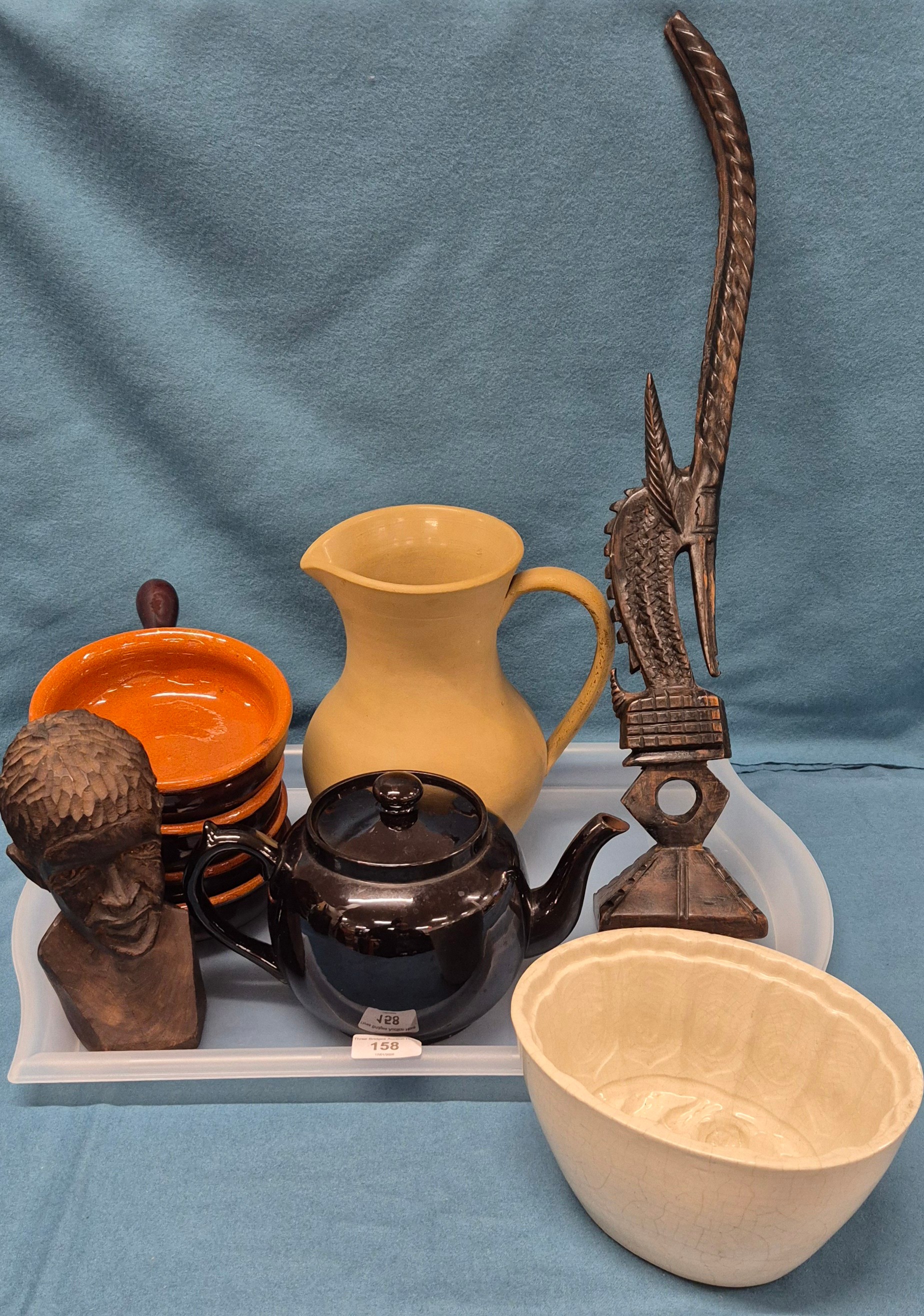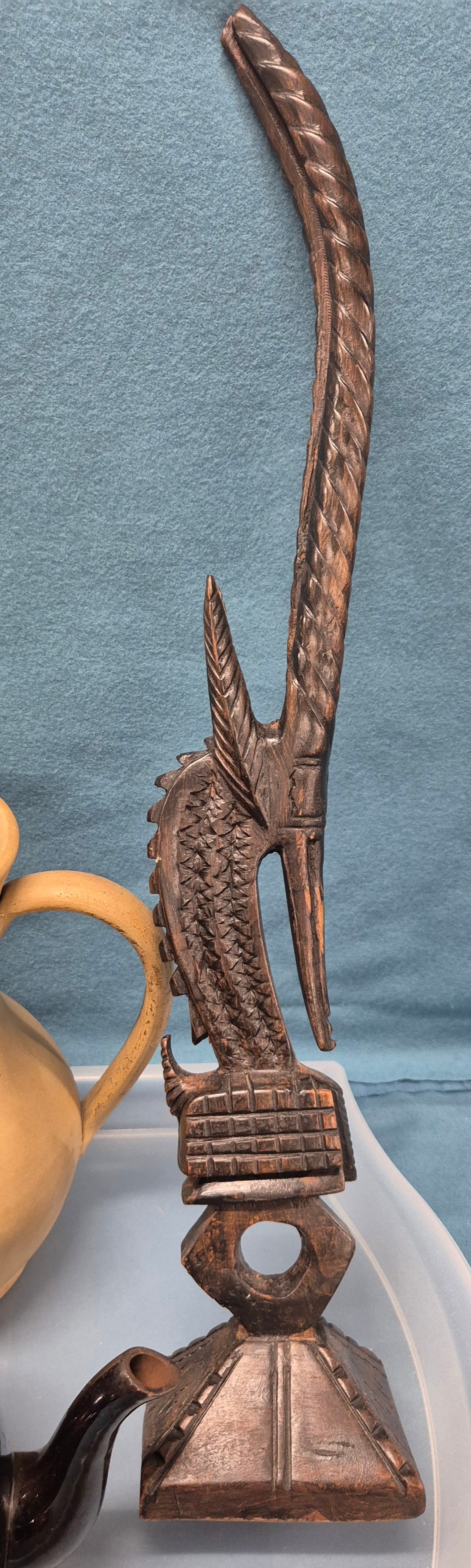 Tray of collectables; African hand carved wooden antelope sculpture- possibly by the Bamana people. African carved bust. Four ceramic pots with handles, Antique Jelly mould, Hartrox ceramic water jug and English made tea pot.
