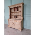 19th C. Irish pine dresser, the superstructure with two shelves and a half shelf above the bread board over two short drawers and two panelled doors flanked by two half columns, raised on bracket feet, originally from the South of Ireland {202cm H x 148cm W x 50cm D }.