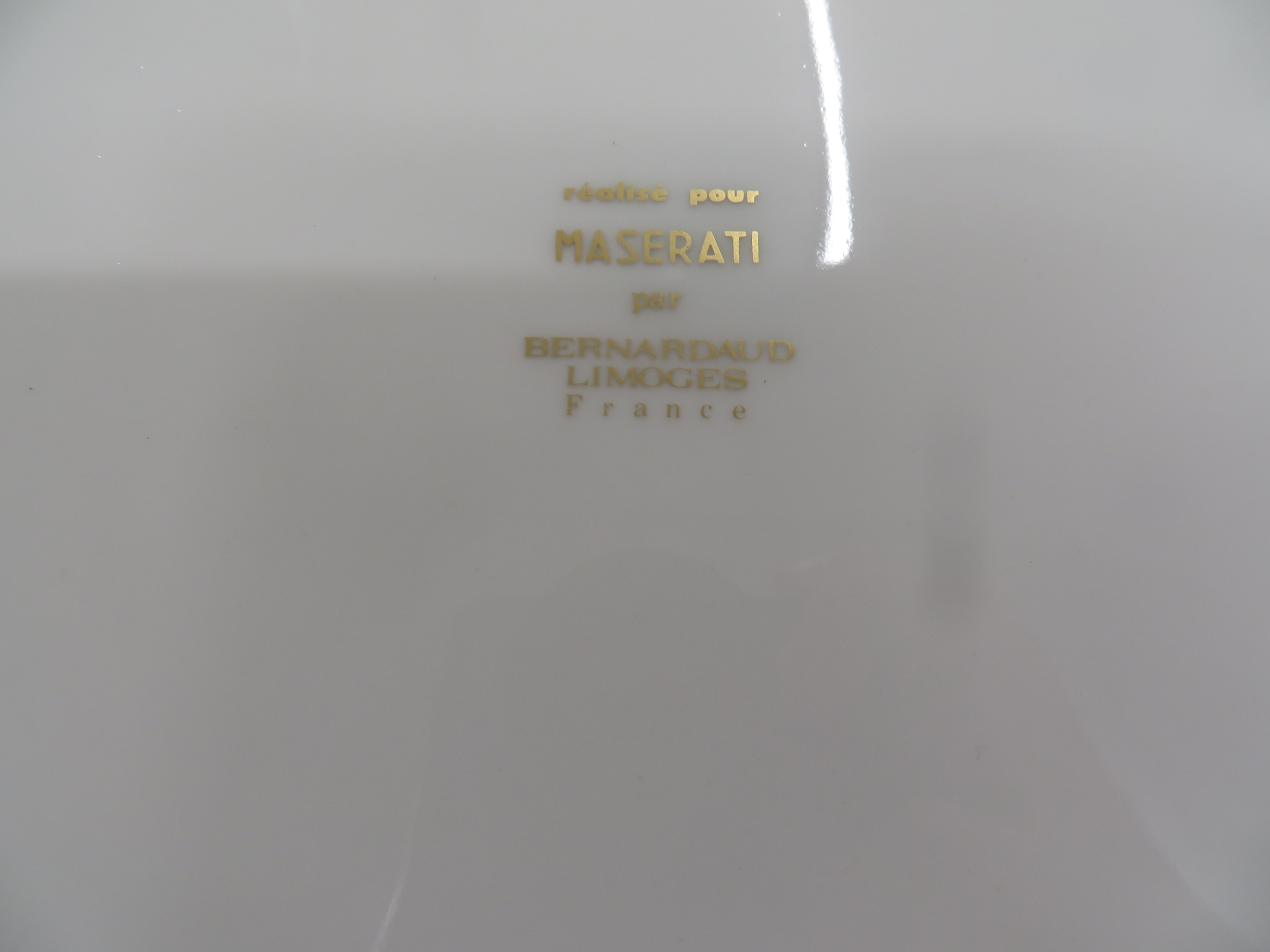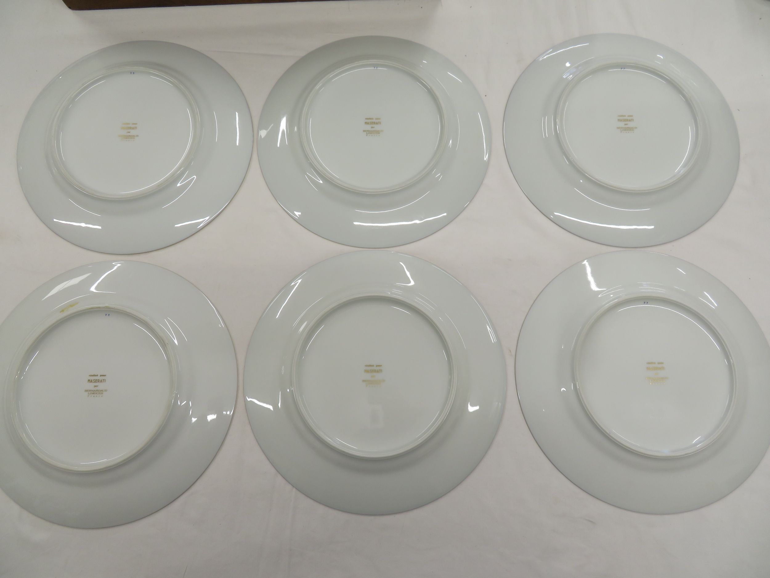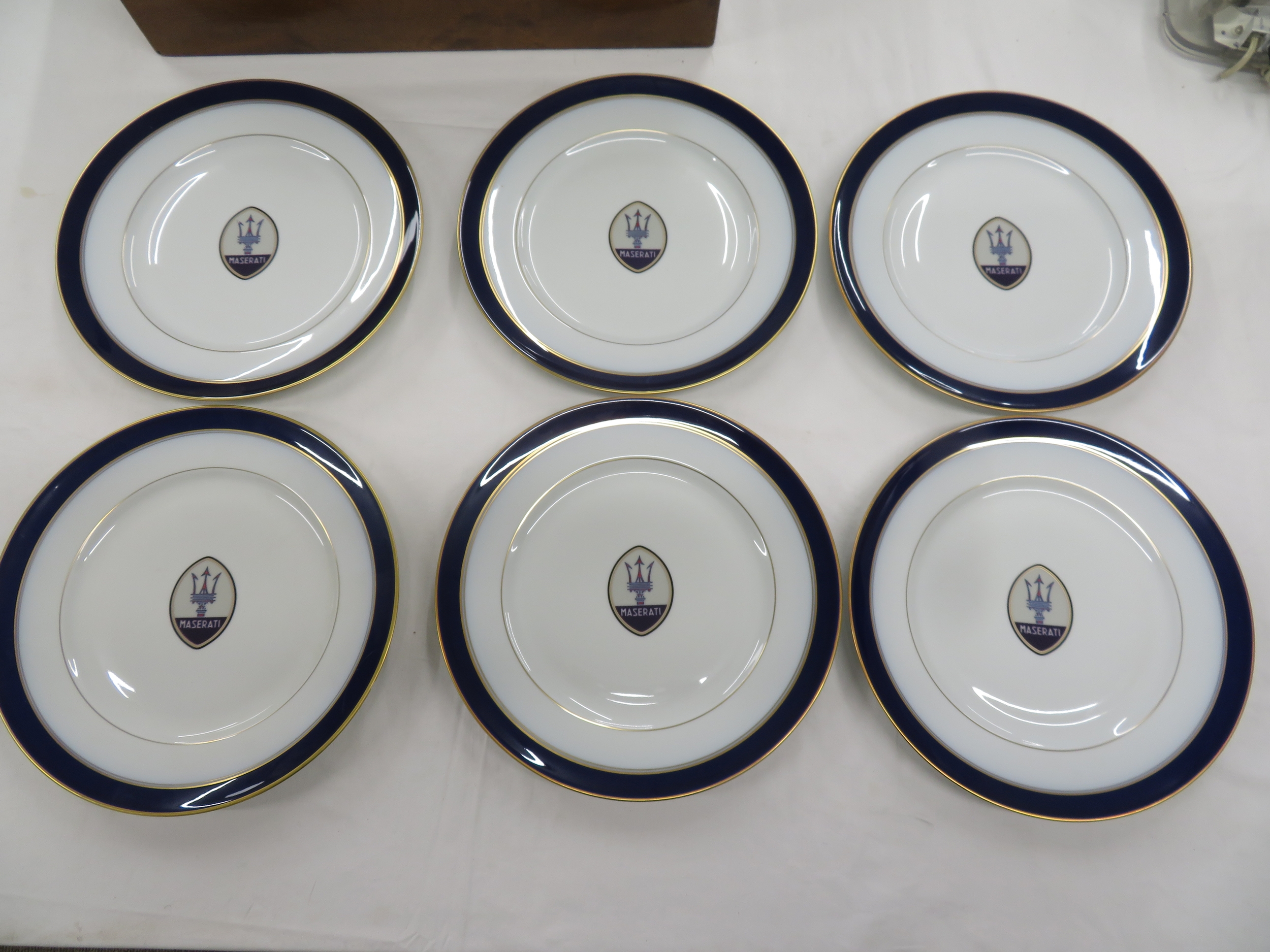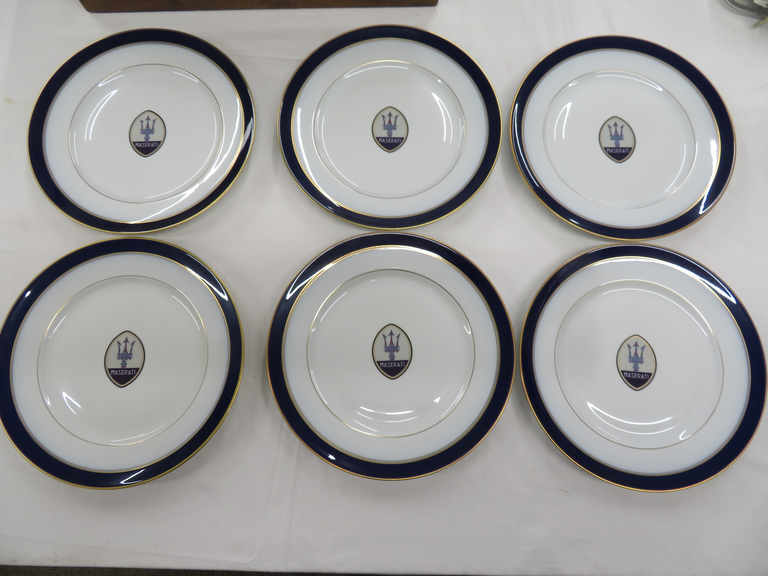 Set of Six Bernardaud Limoges Maserati dishes - with gilt and navy blue borders - bearing the Maserati logo