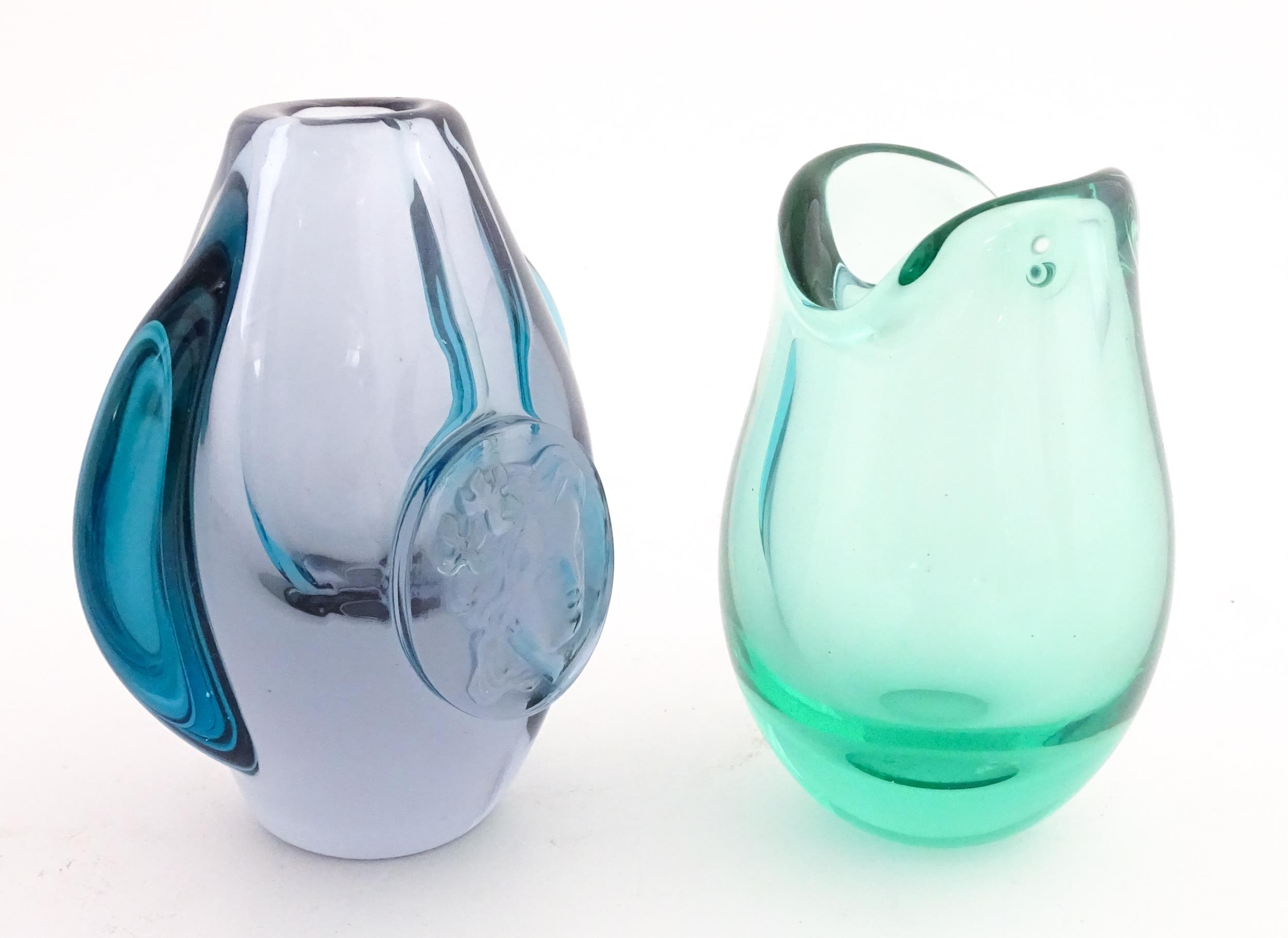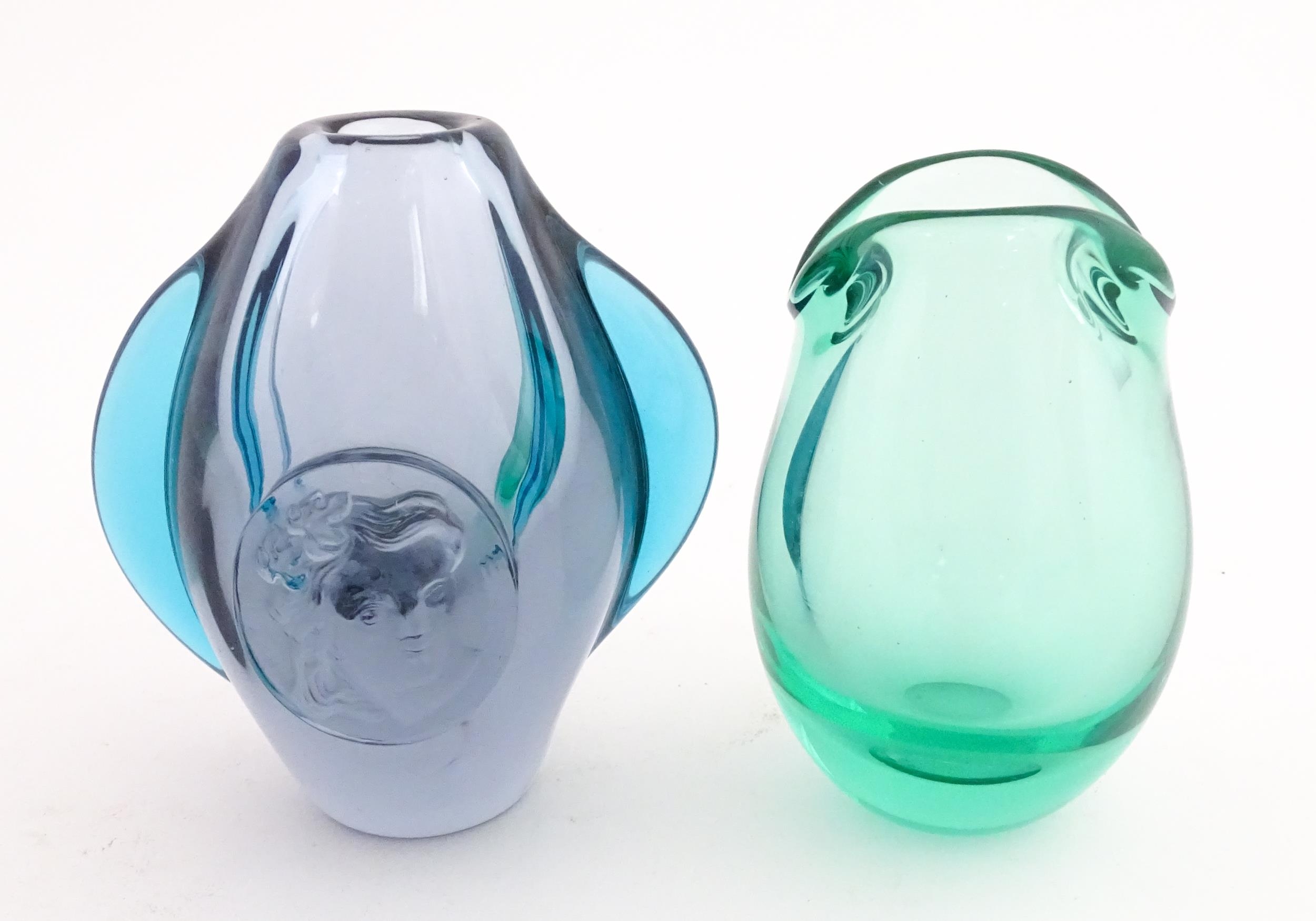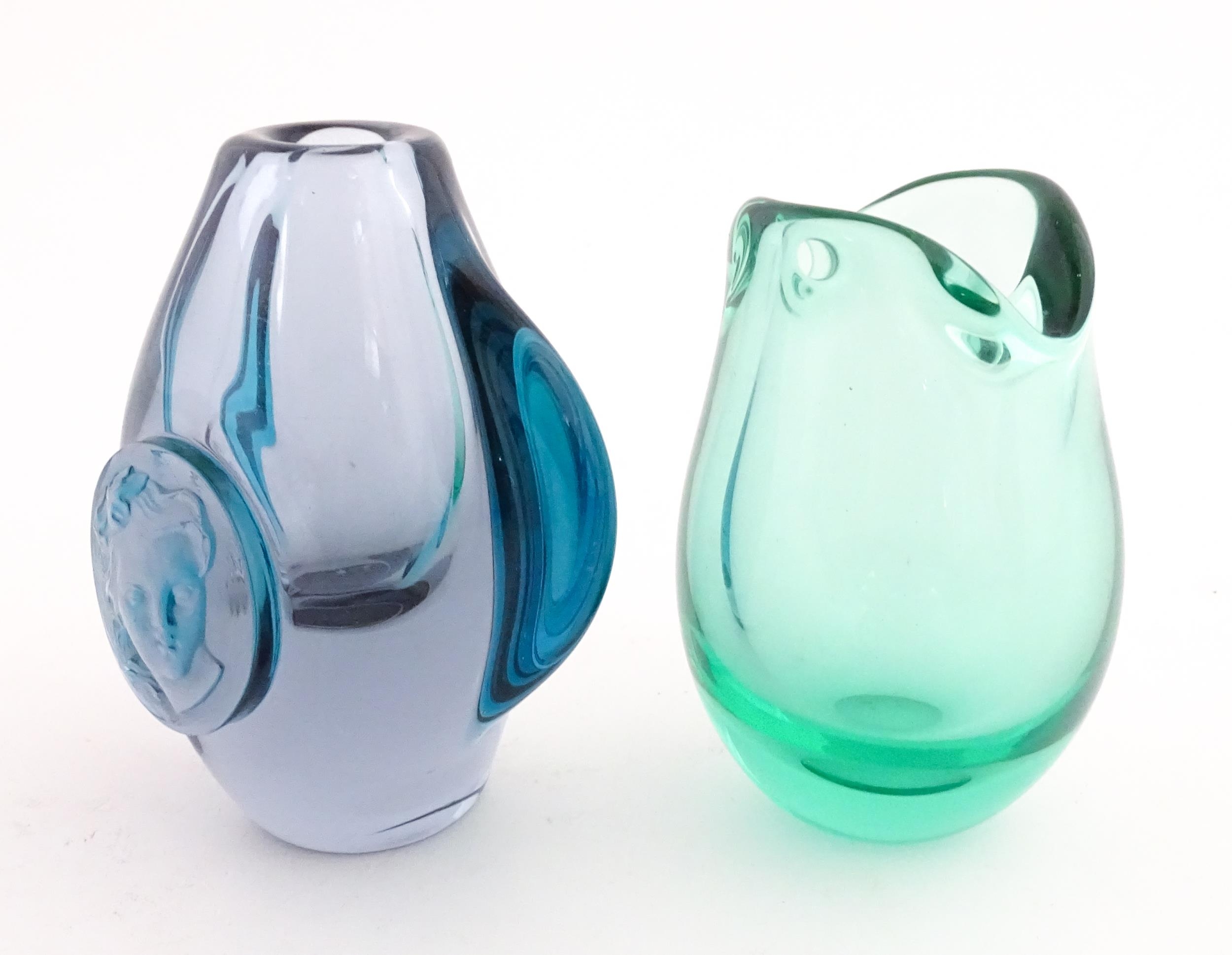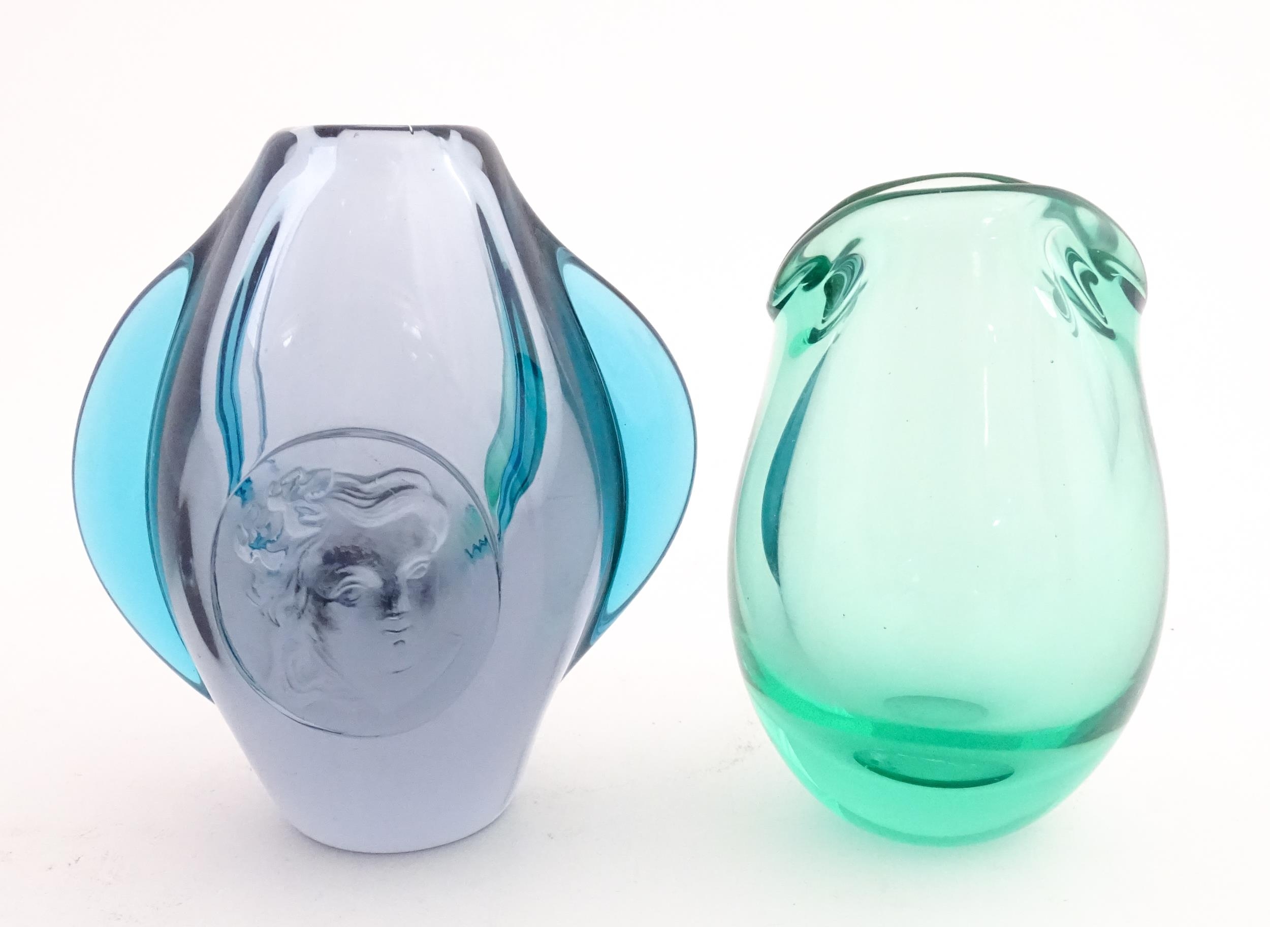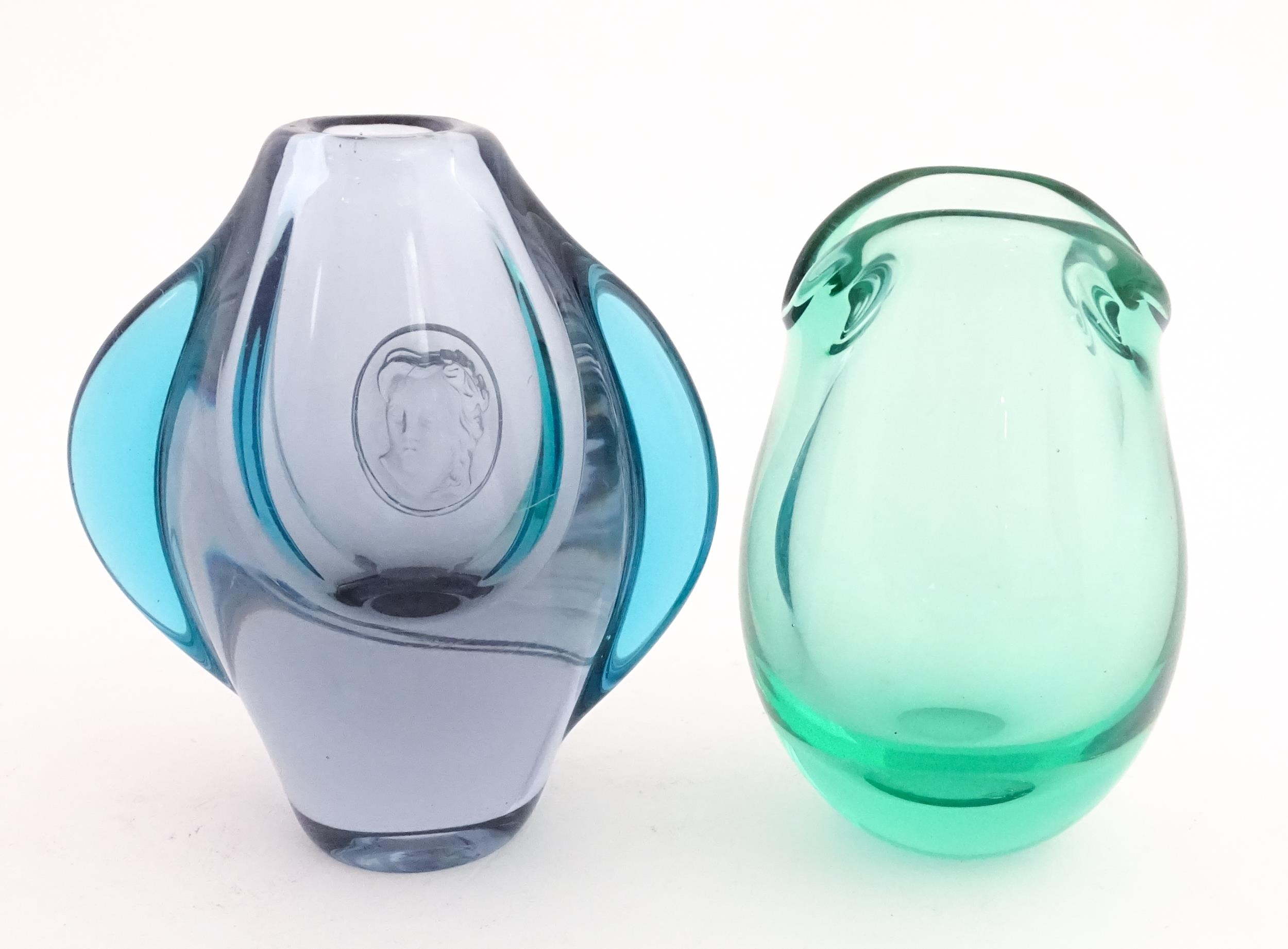 Two studio glass vases, one a green glass vase by Holmegaard signed under, the other a vase with stylised cameo roundel detail, indistinctly signed under. The largest 5 1/2" high (2)