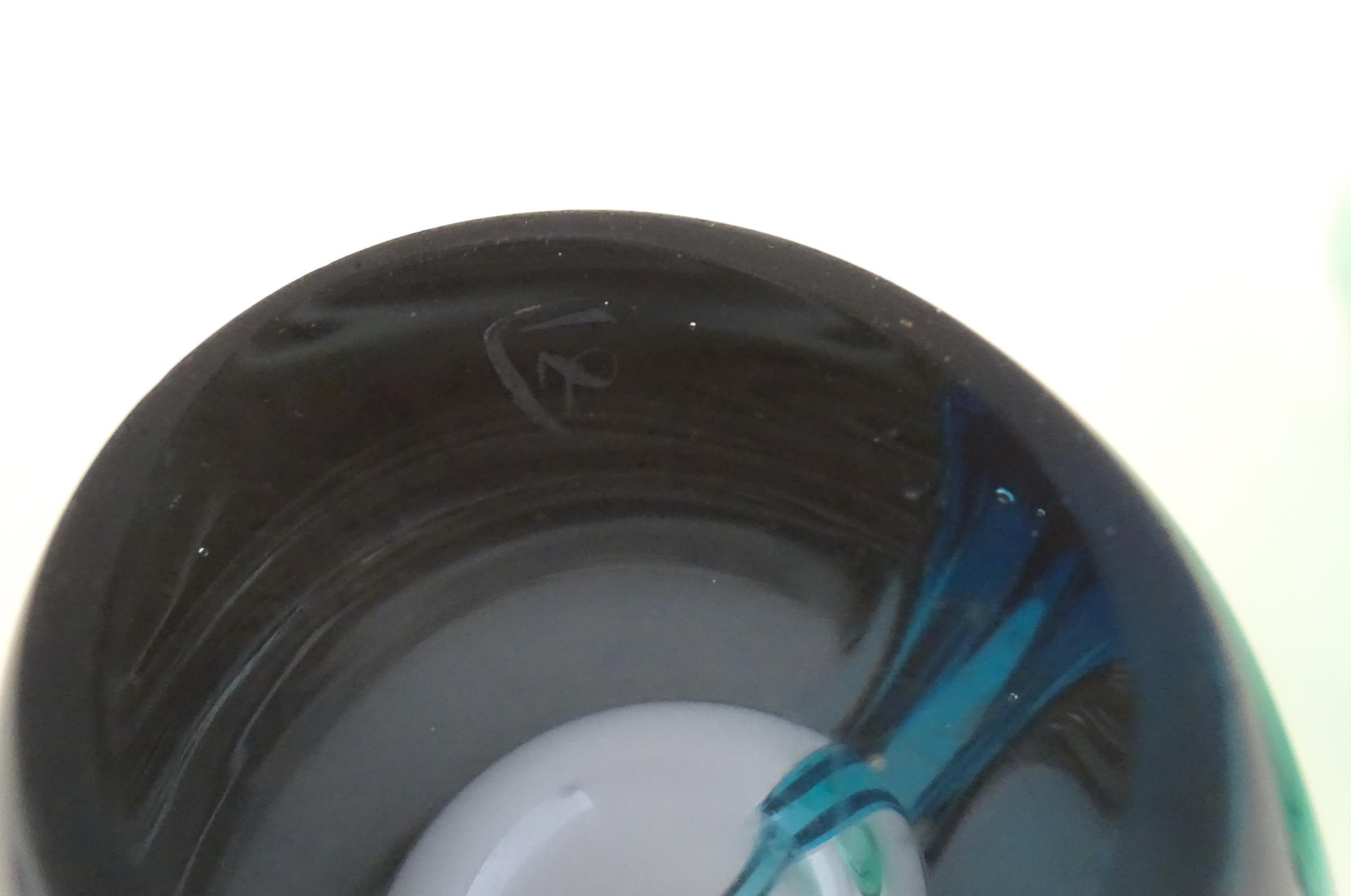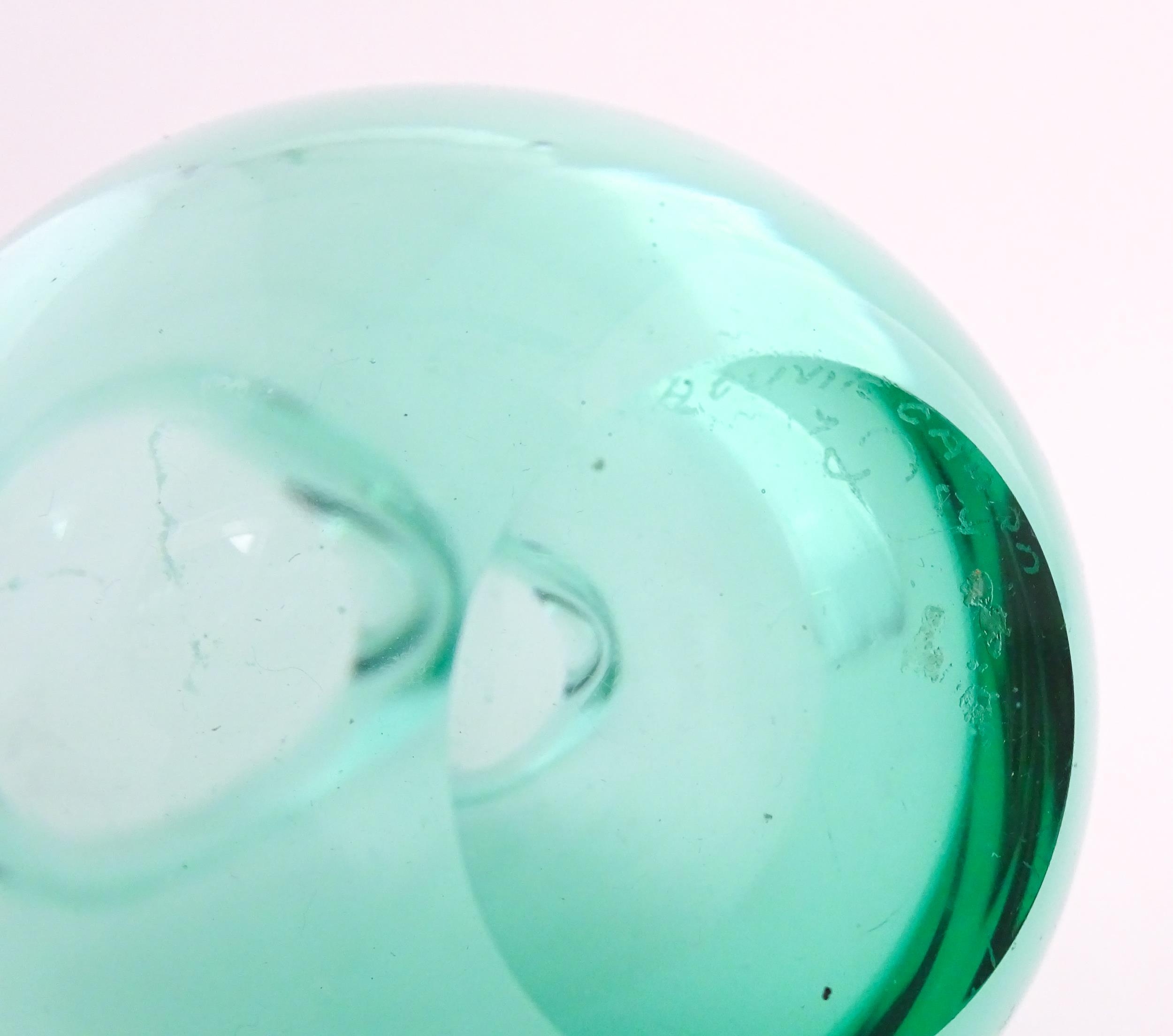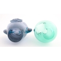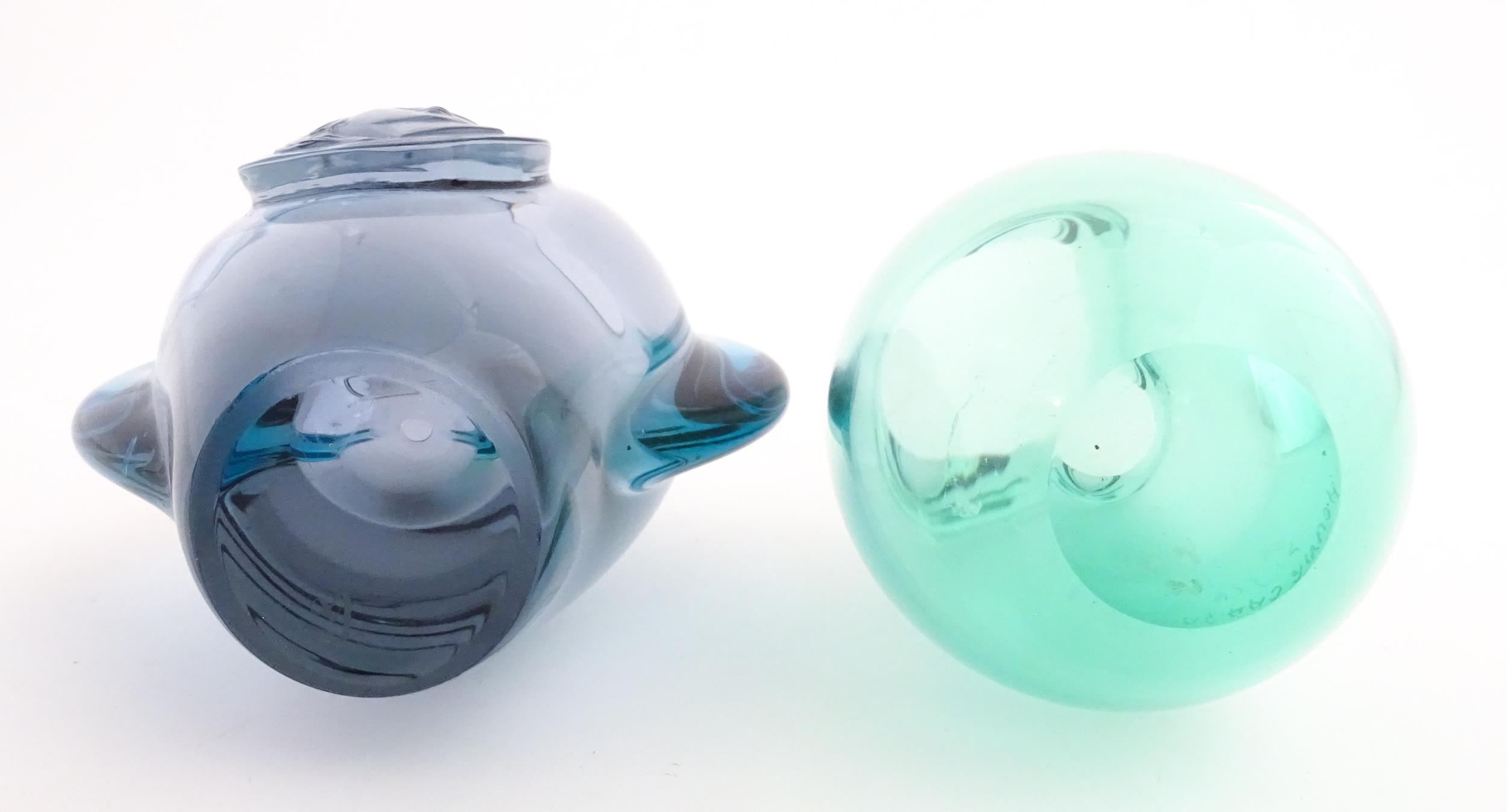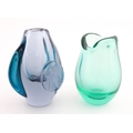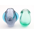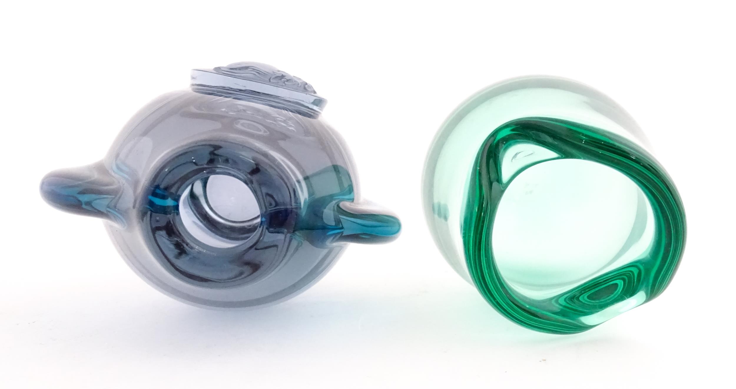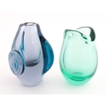 Two studio glass vases, one a green glass vase by Holmegaard signed under, the other a vase with stylised cameo roundel detail, indistinctly signed under. The largest 5 1/2" high (2)