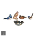 Five Royal Crown Derby bird paperweights including Chatsworth Coot, Woodland Pheasant, made for the collectors guild, Cockatoo numbered 1952 of 2500, all with printed marks, all with gold stoppers. (5)