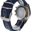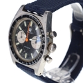 Case made from stainless steel, aftermarket fabric strap. Acrylic crystal is cracked and scratched, fixed bezel is chipped and scratched. Black reverse panda dial with sub seconds and 30 minute chronograph hands at 9 and 3 o'clock respectively.