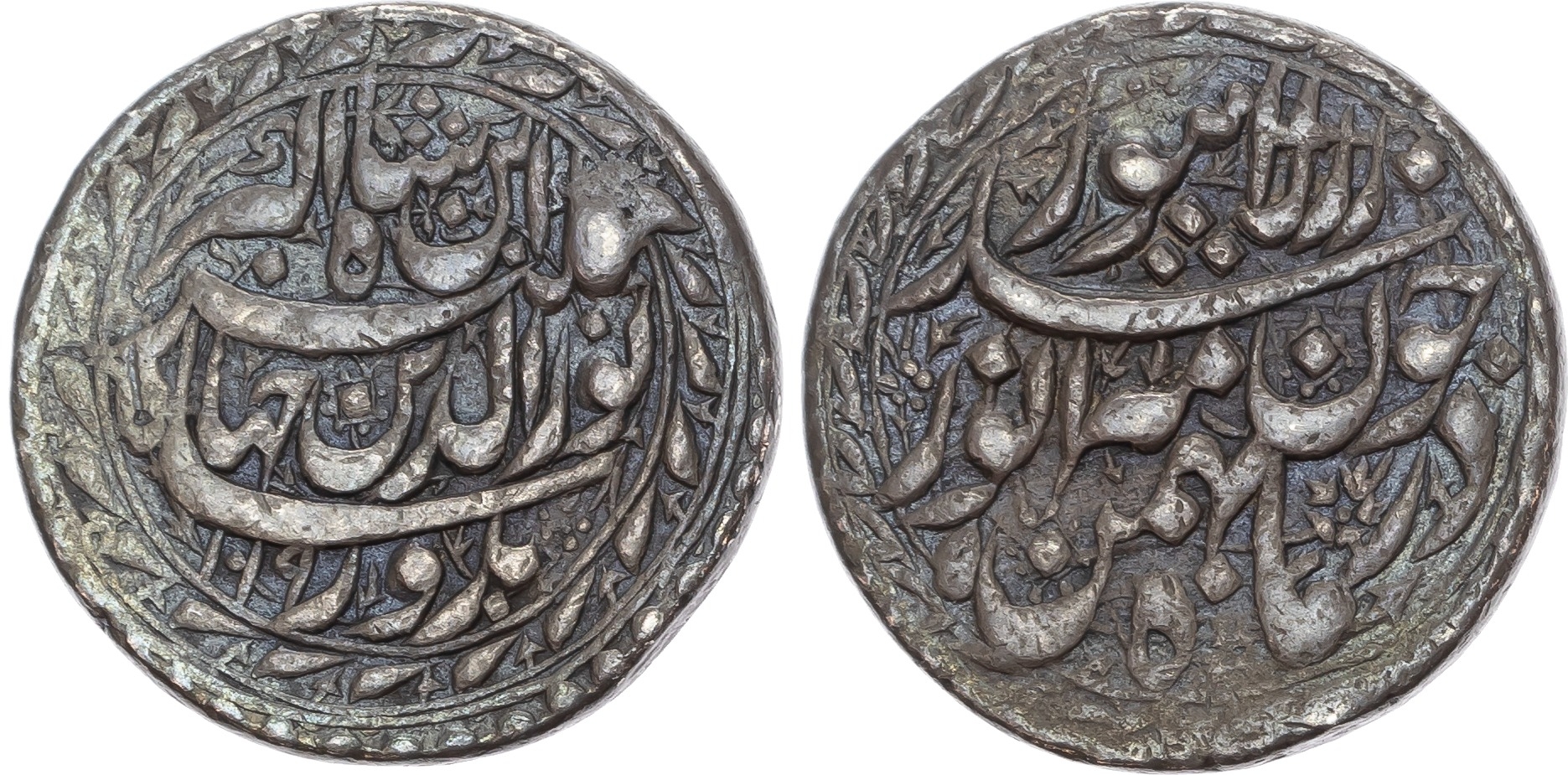India, Mughal Empire, Jahangir (AH 1014-1037 / 1605-1627 AD), silver Sawai Rupee, Bahman mah-e-Anwar couplet, AH 1019, Ilahi month Bahman, Lahore, wreath border, 14.28g (KM 159.1). Good Very Fine. Extremely rare.