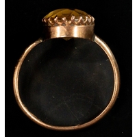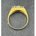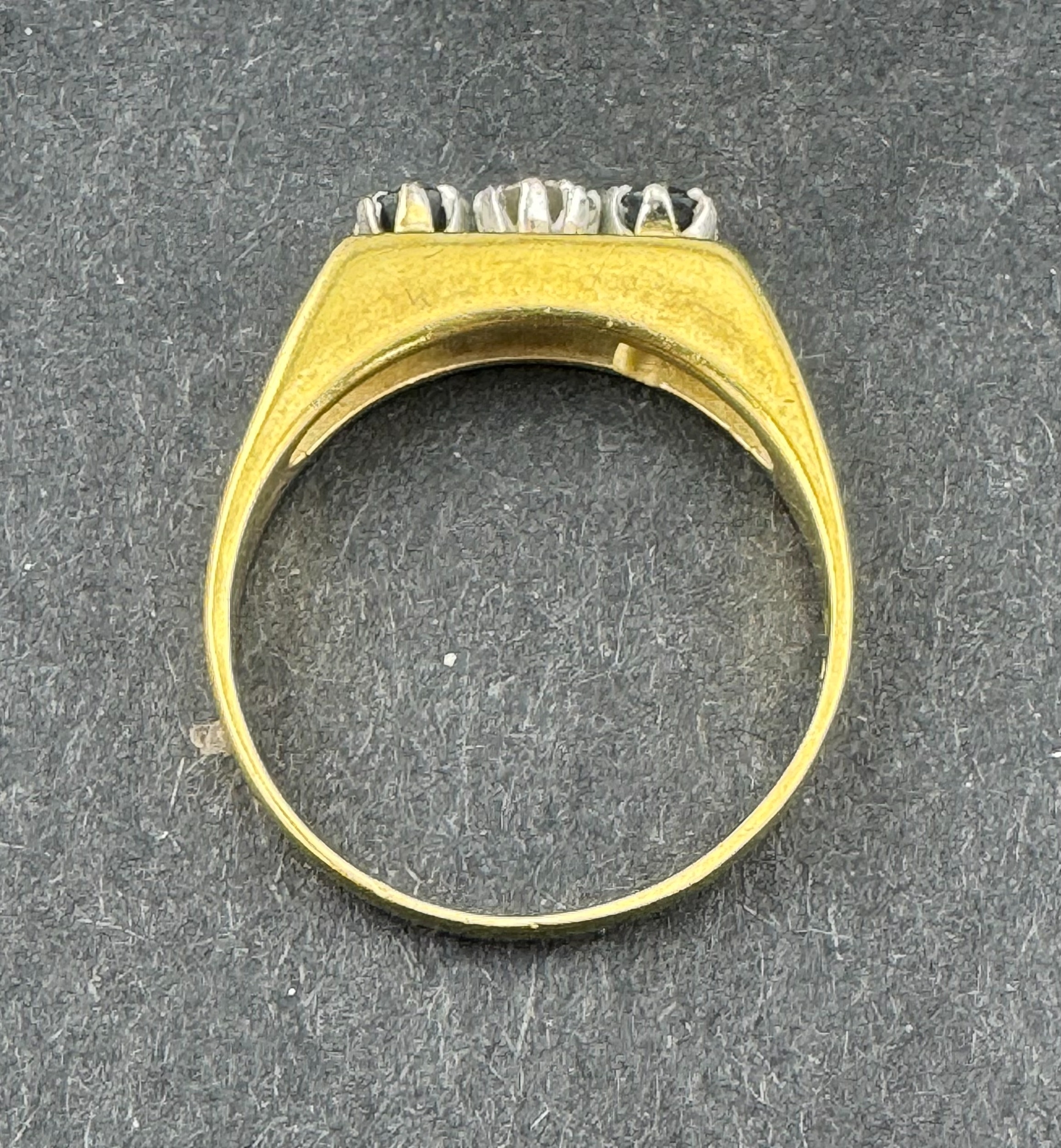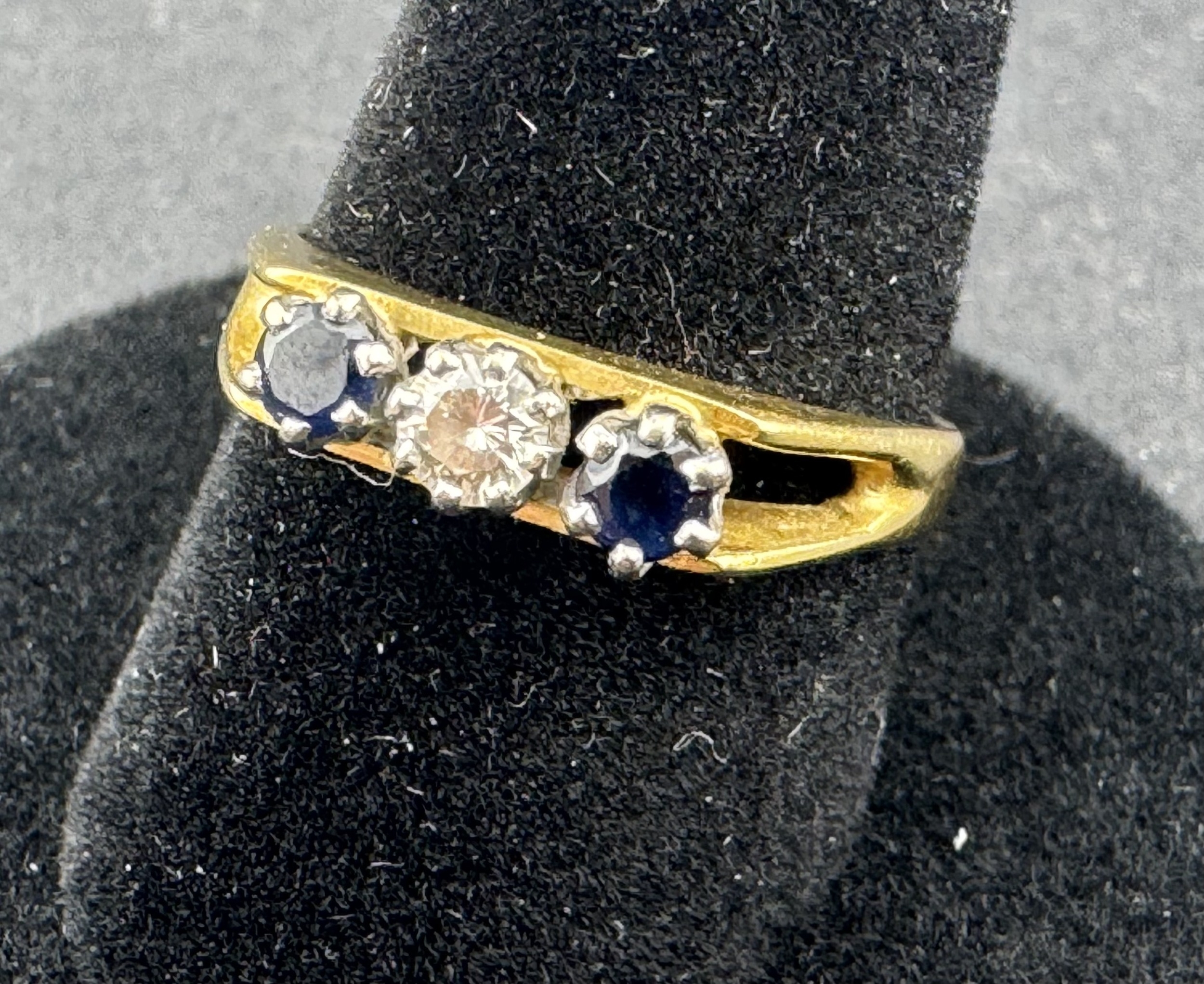 Jewellery: 18ct gold ring with split shoulders set with a brilliant-cut diamond, estimated weight 1.12ct, with a round sapphire either side, estimated weight of (2) 0.20ct, ring size O, 2.8g.
