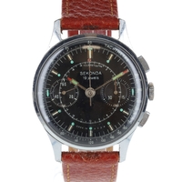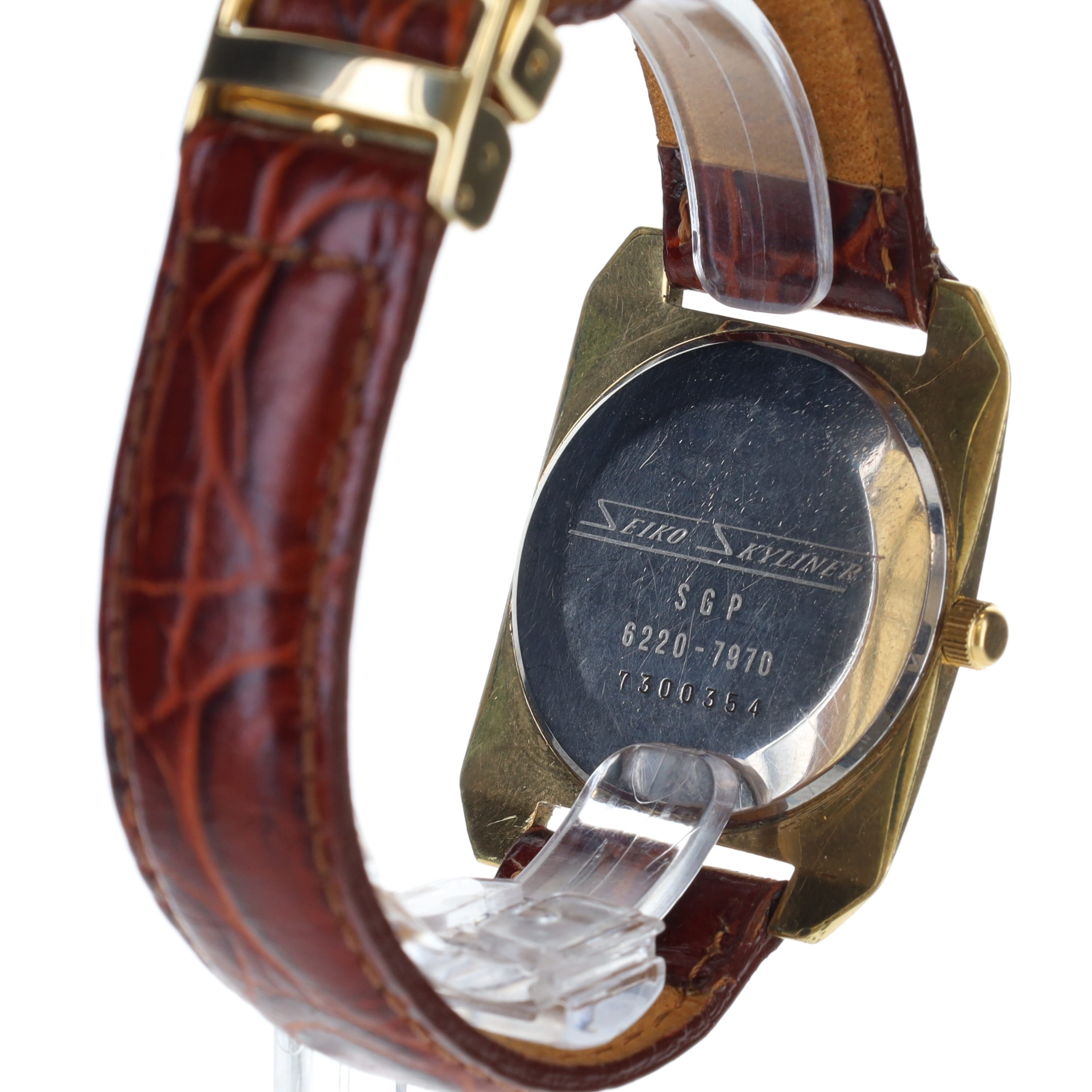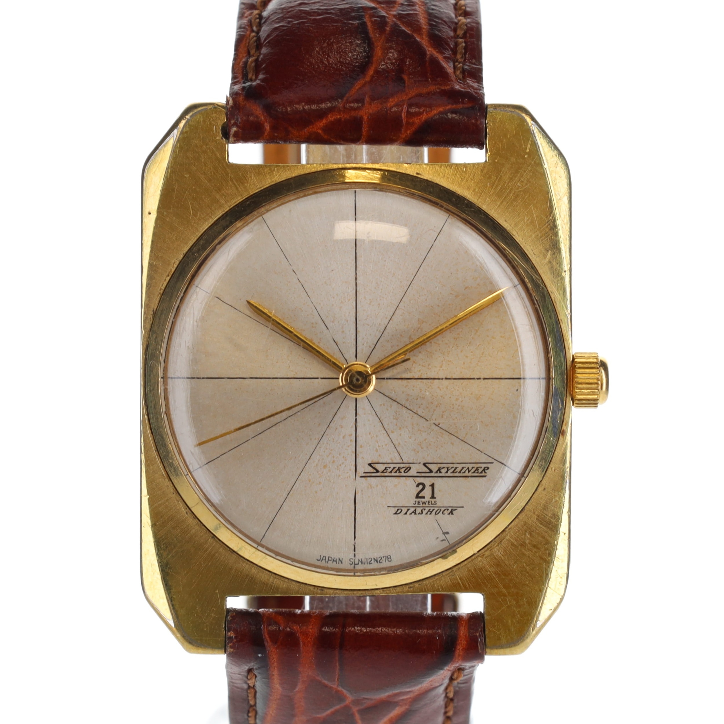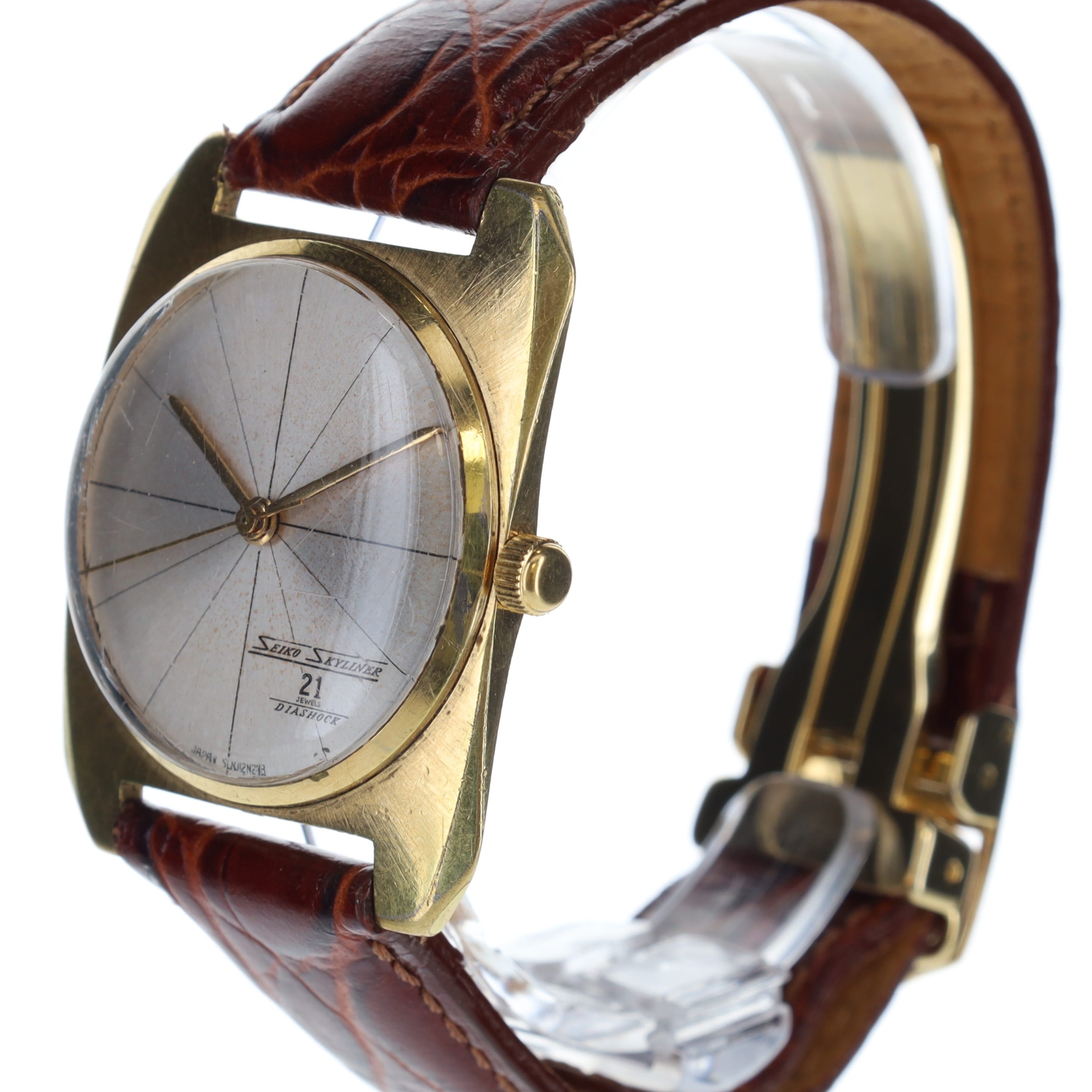 Case made from gold tone base metal with aftermarket leather strap and gold tone butterfly buckle. Acrylic crystal with some minor cosmetic defects. Silver tone 'segmented' style dial with gold hands and Seiko Skyliner logo in between 6 & 4 o'clock lines.