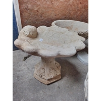Large concrete garden birdbath with six sided top and floral pattern on plinth. approx. 45cm diameter and 45cm tall