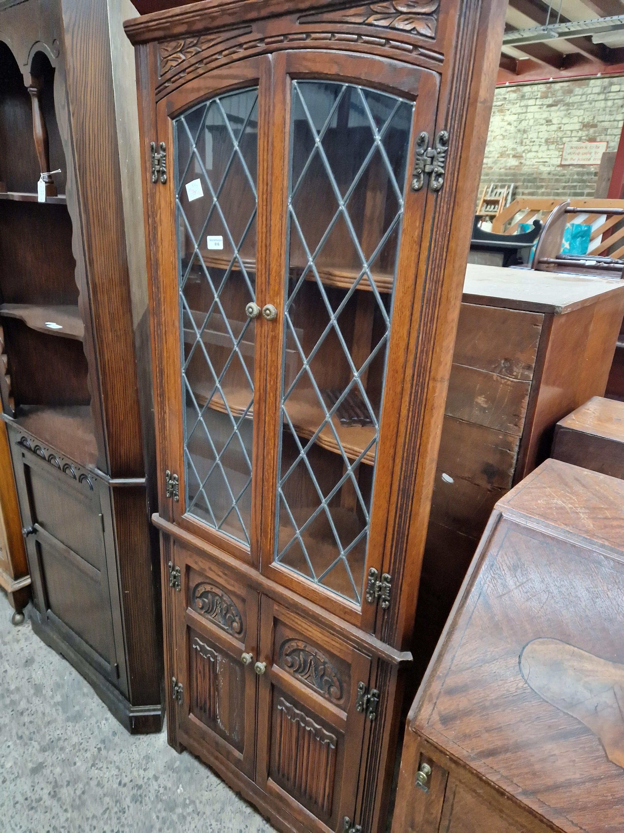 A vintage carved oak corner cabinet with lead glazed doors
