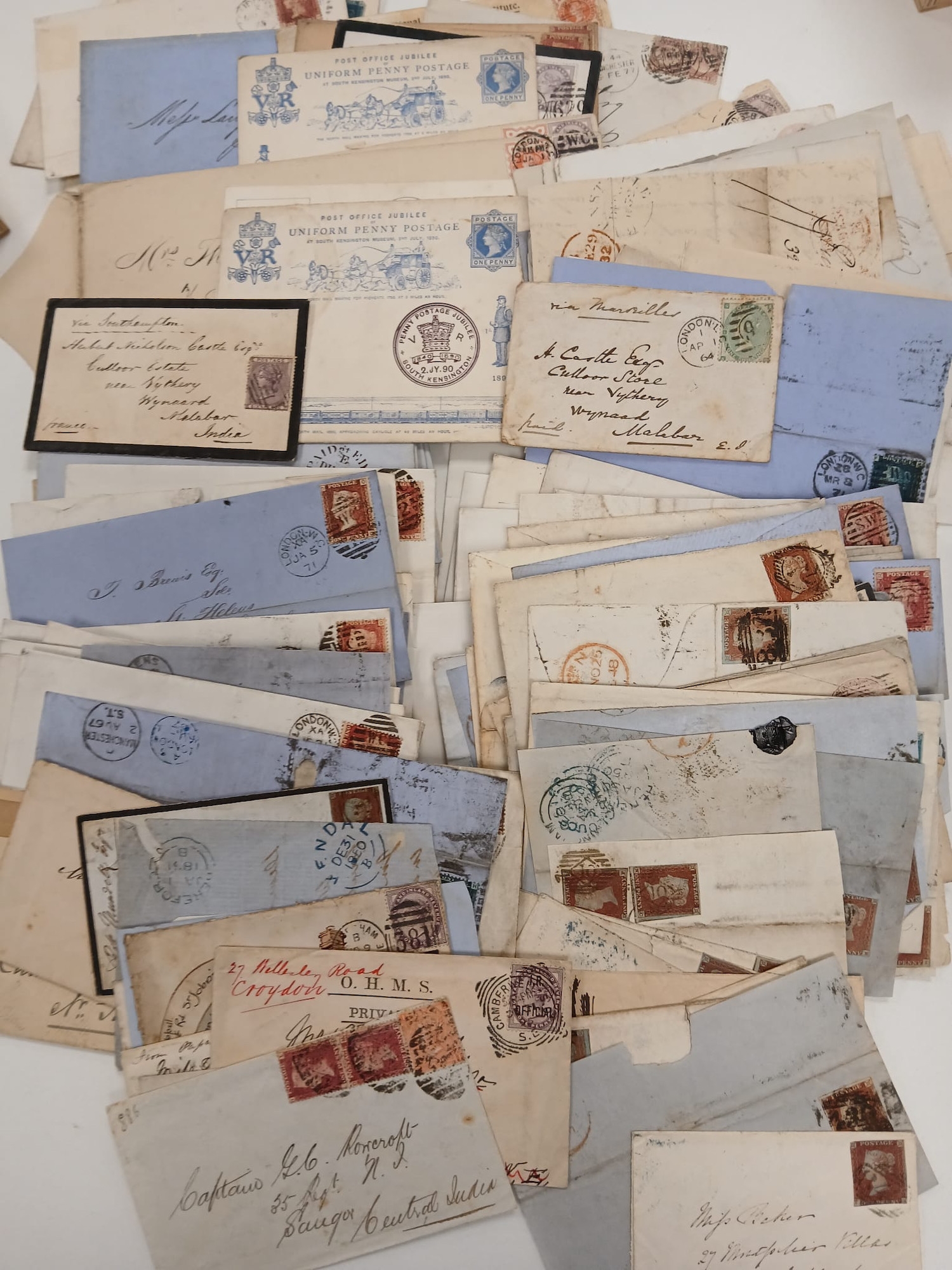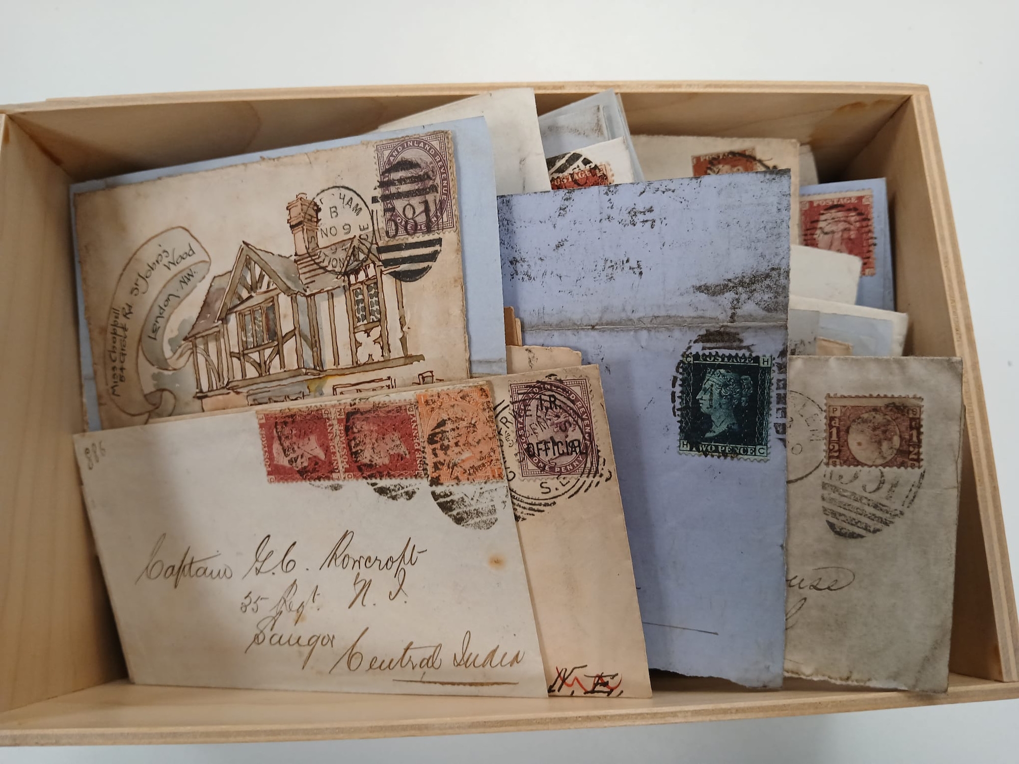 Great Britain. A quantity of Queen Victorian covers, entries, fronts etc (over 200 items) in wooden box, including some pre-stamps, 1d reds, 2d blues, Bantums, some surface printed, postcards, postal stationary. Requires viewing.