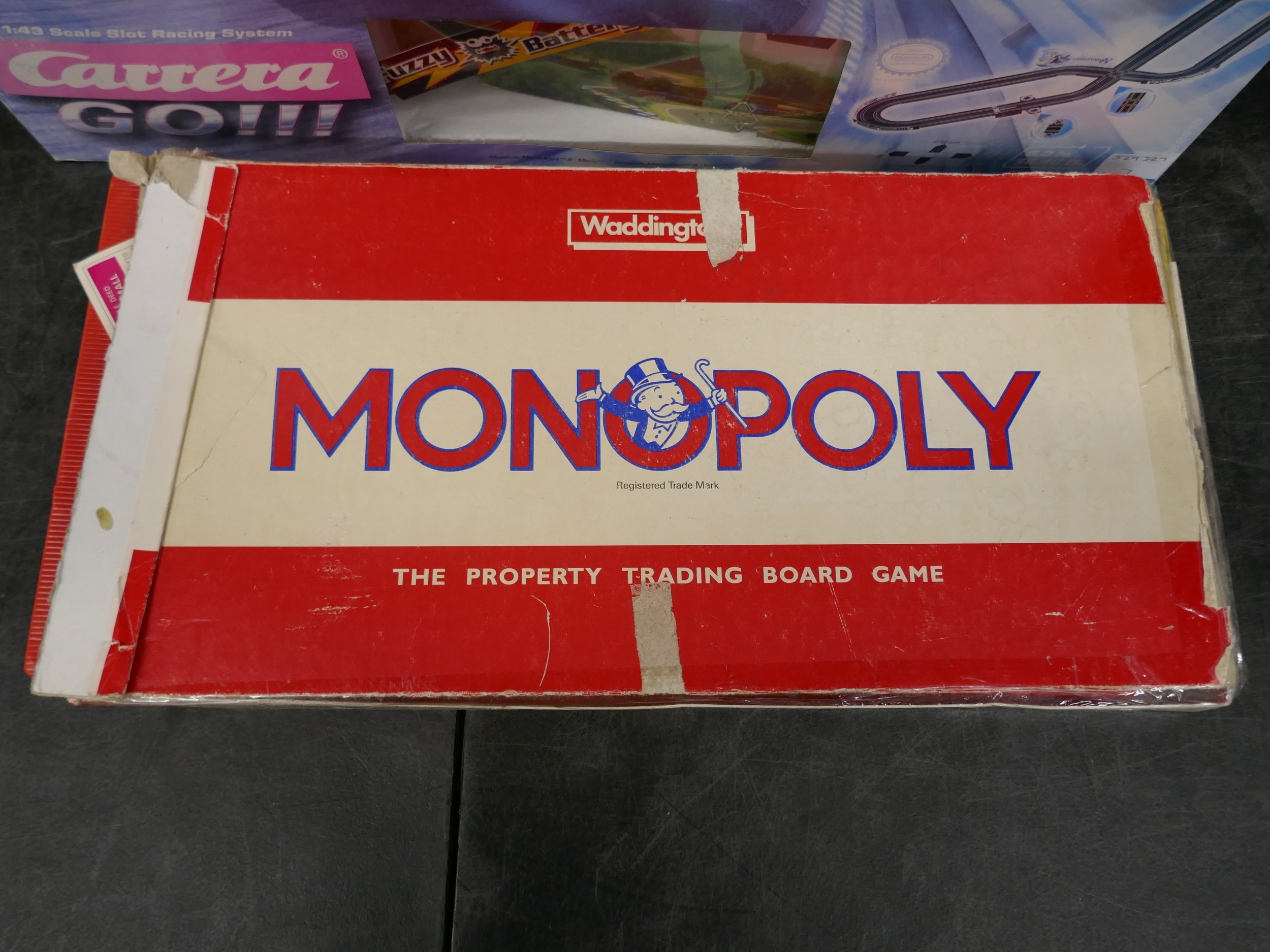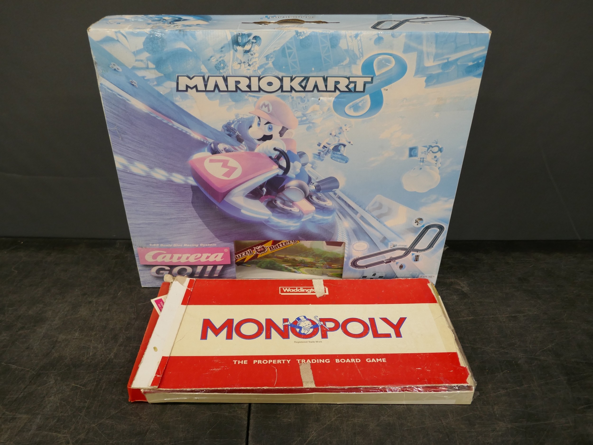 A Carrera Go Mario Karts racing system and a vintage Monopoly game