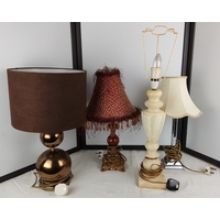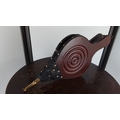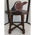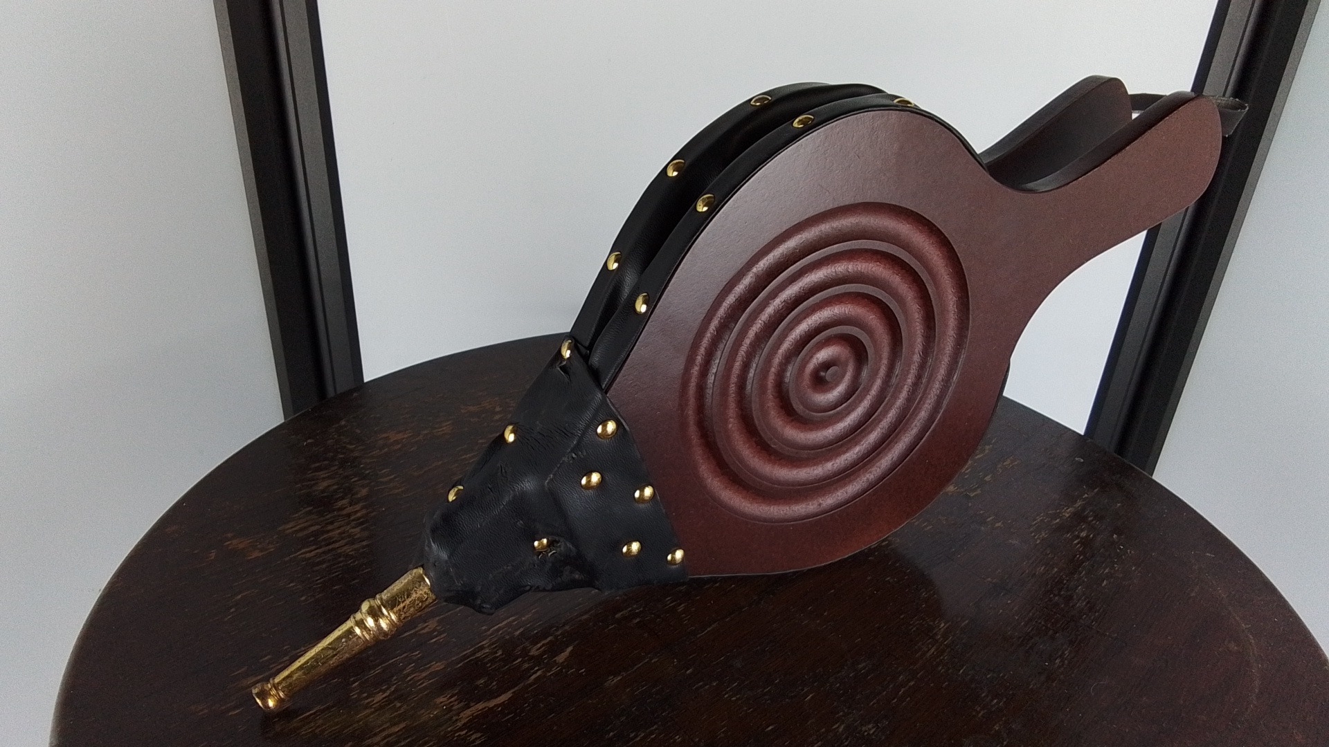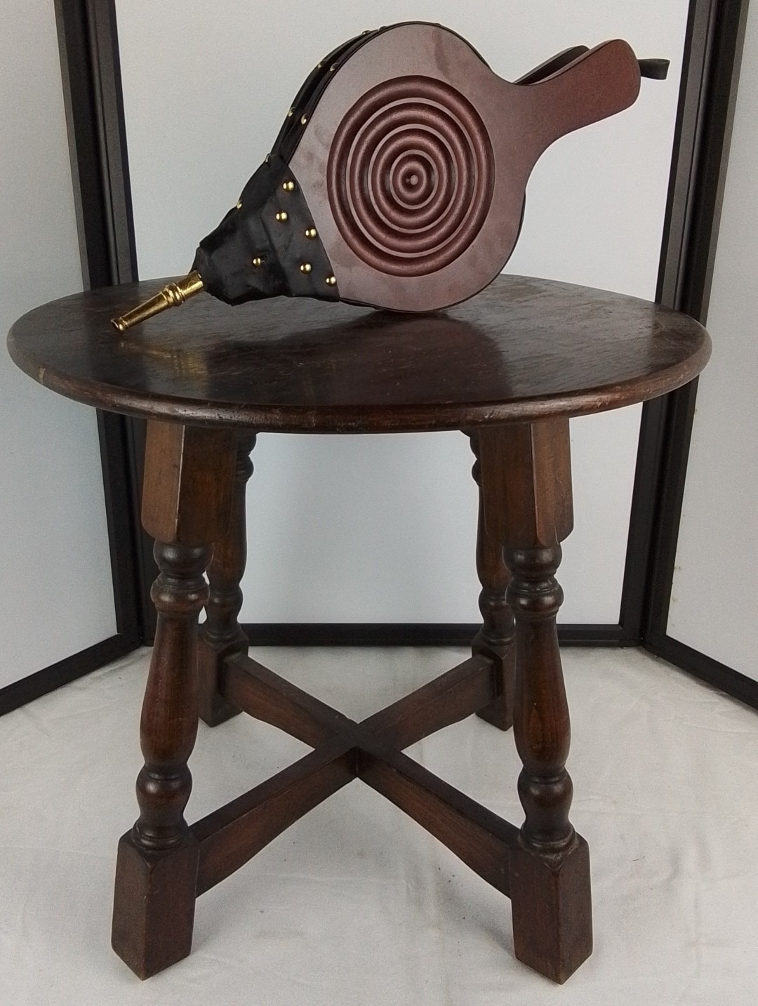 A leather and ebonised wood fireplace bellows with brass nozzle and a vintage circular topped table.