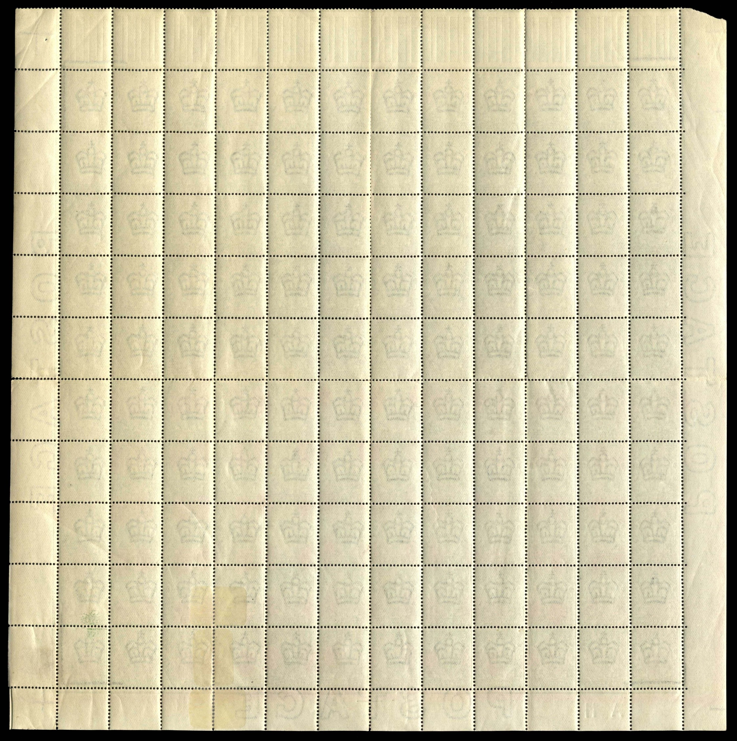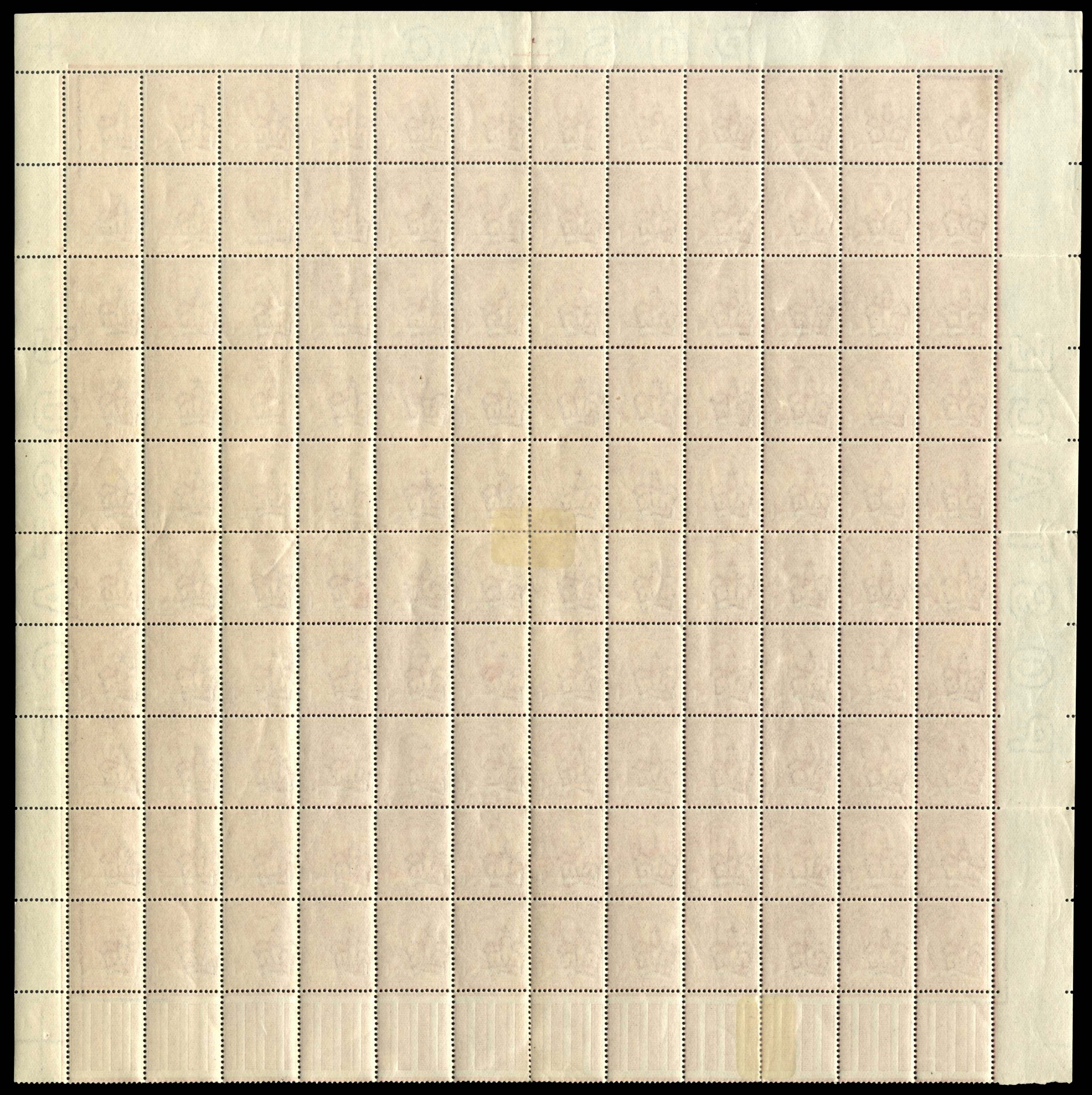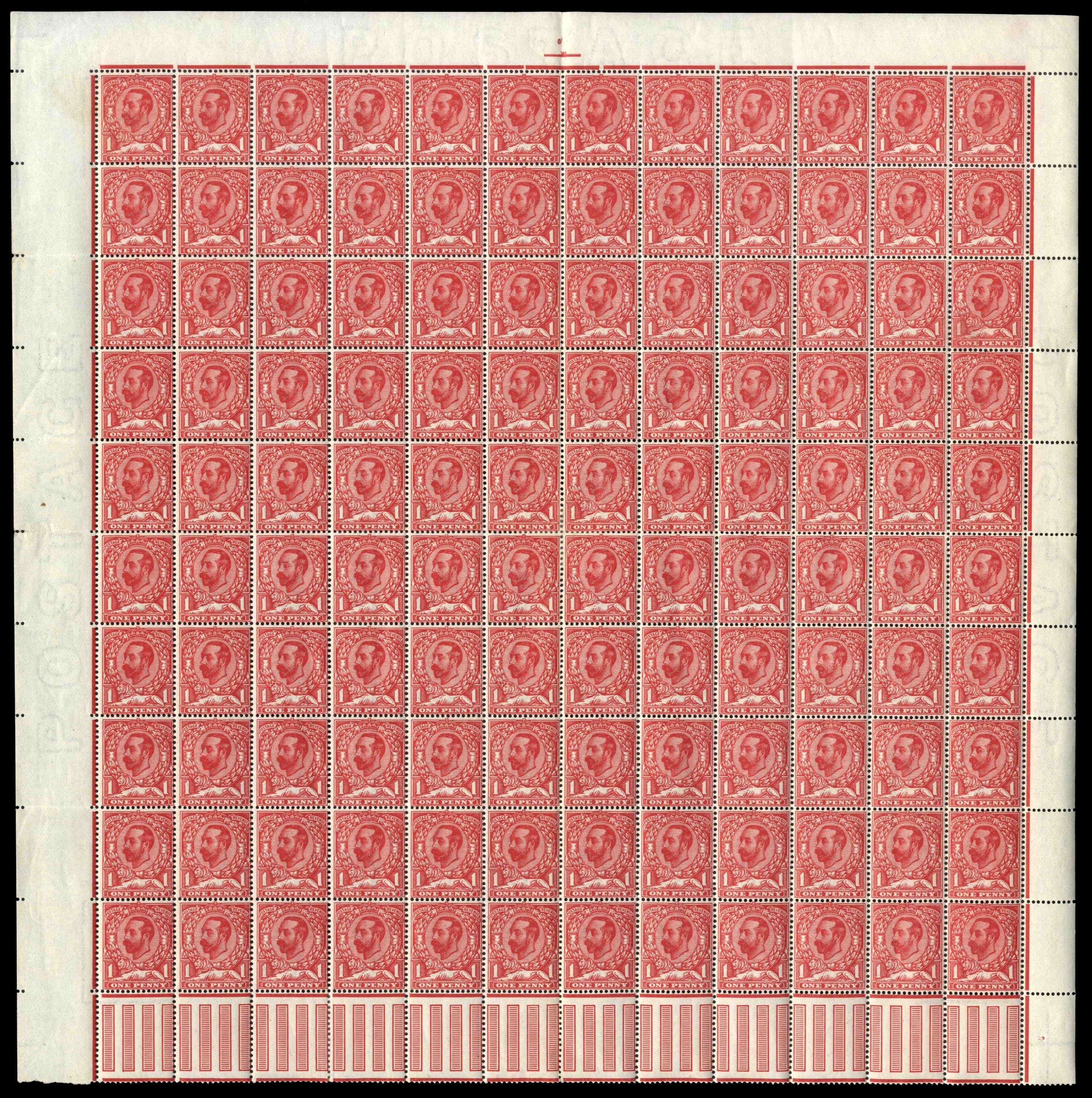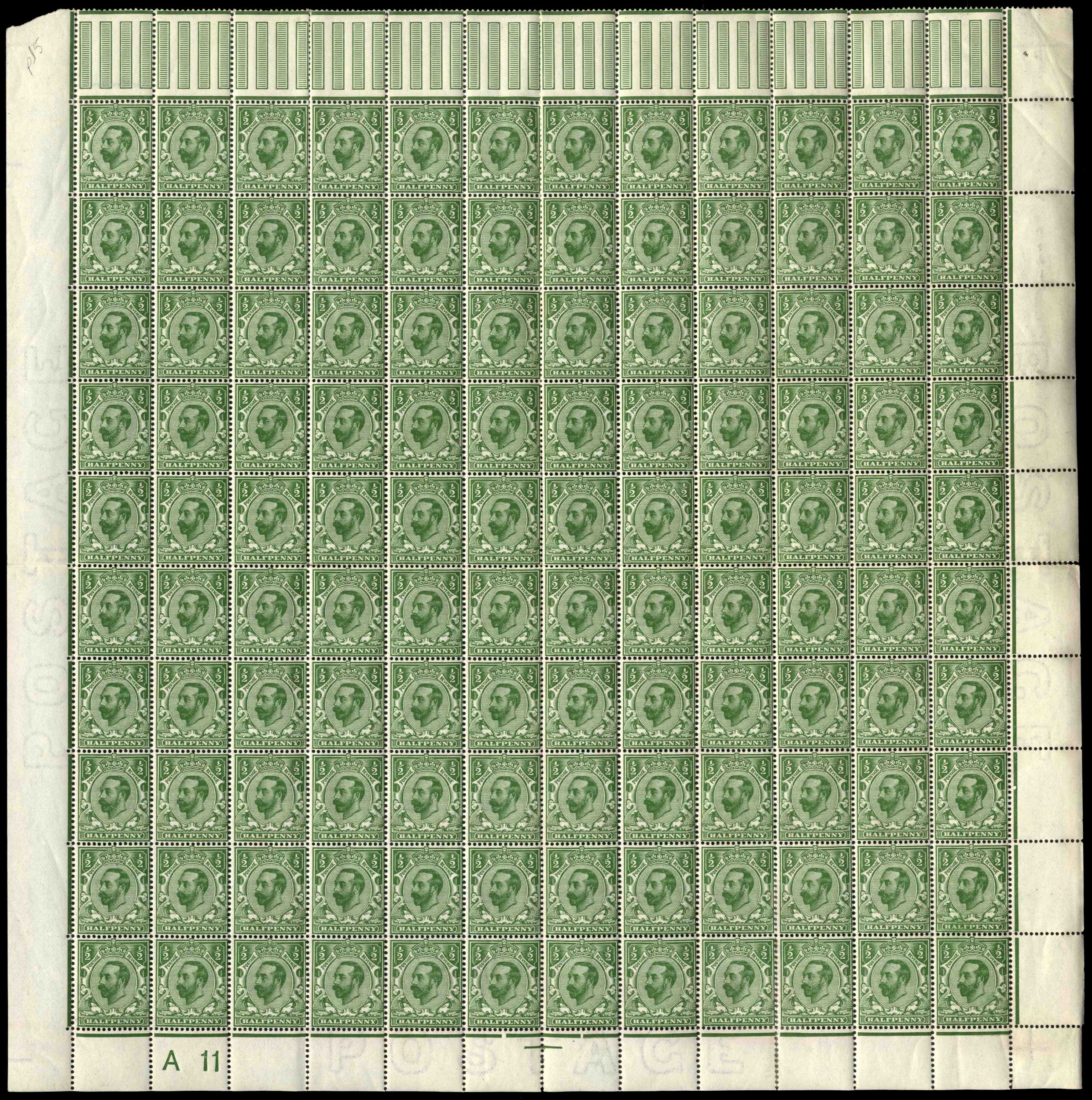 1911-12 ½d green and 1d pale carmine, complete panes of 120 (12x10), the former from the lower half of the sheet with control A 11(w), and latter from upper half of the sheet, both with interpane pillars and perf type 1A, mint, o.g., some splitting sensibly reinforced but the vast majority are unmounted. A few folds and wrinkles as to be expected, still very impressive and scarce survivors. SG 322, 328, Cat £3,304