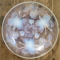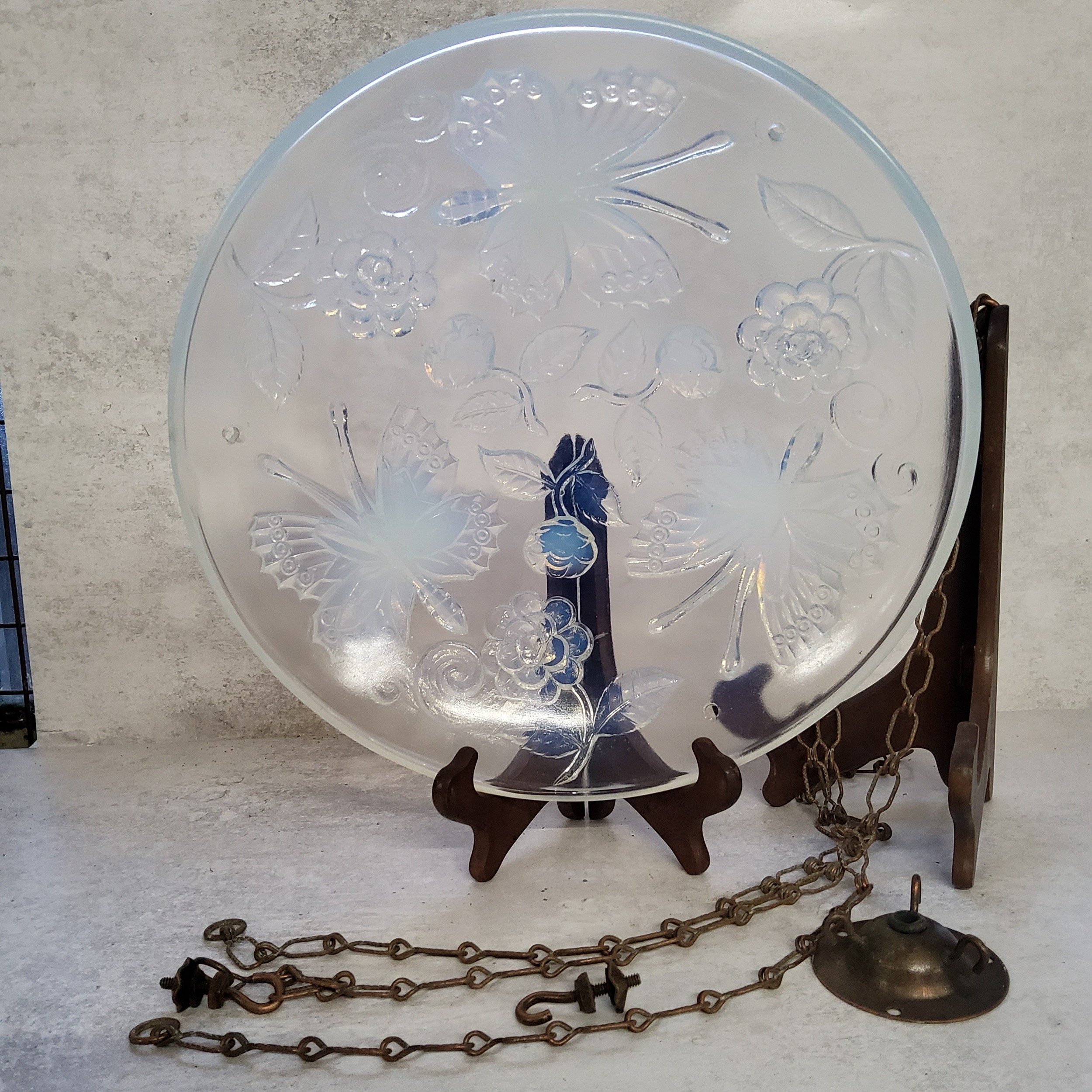 A vintage French vaseline glass hanging ceiling light shade moulded in relief with roses & butterflies