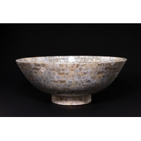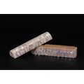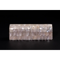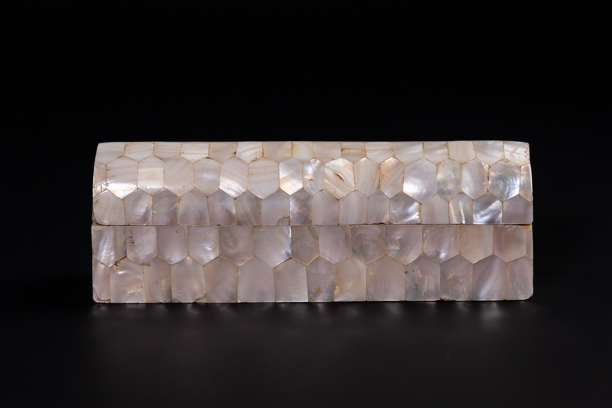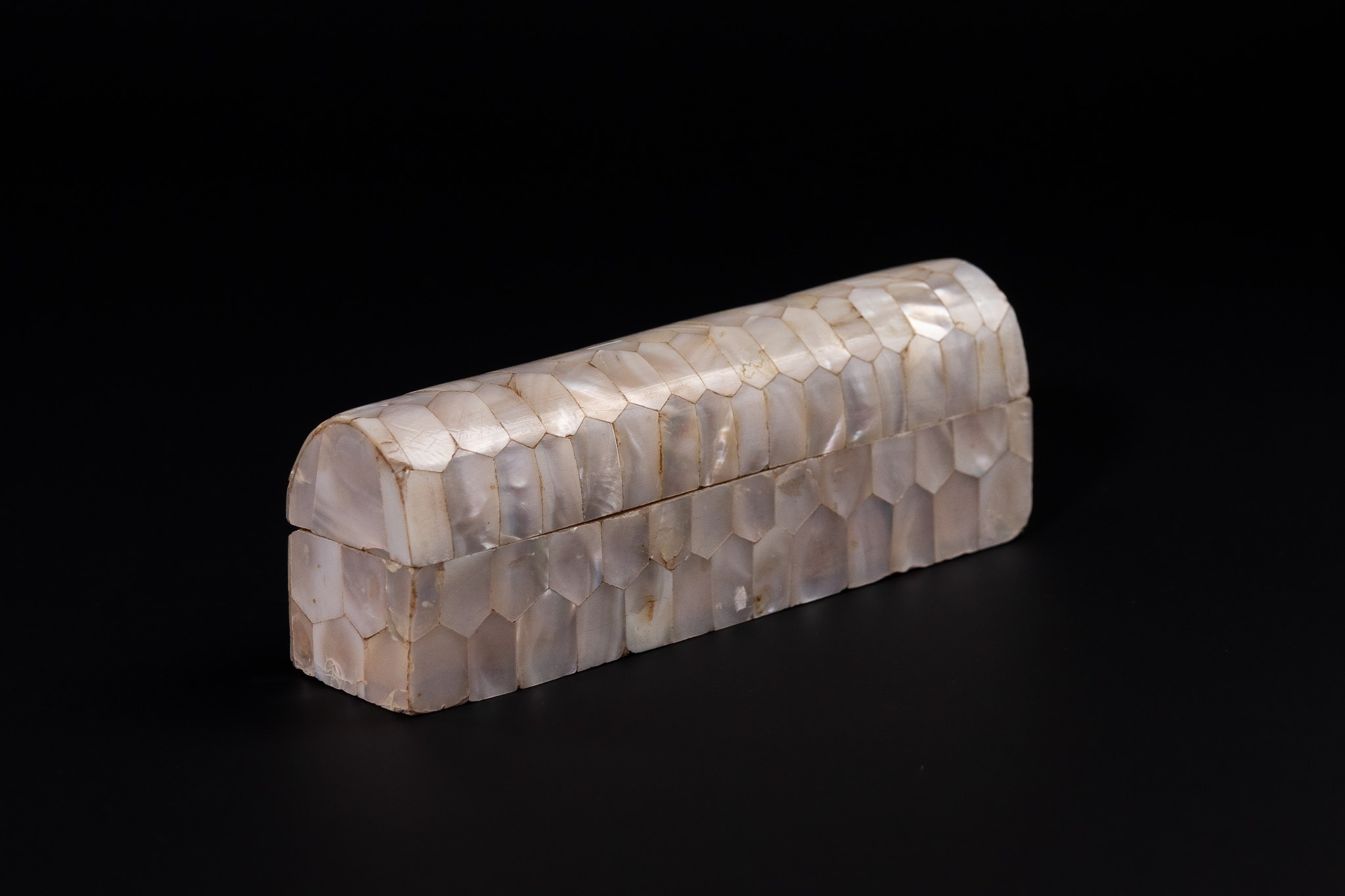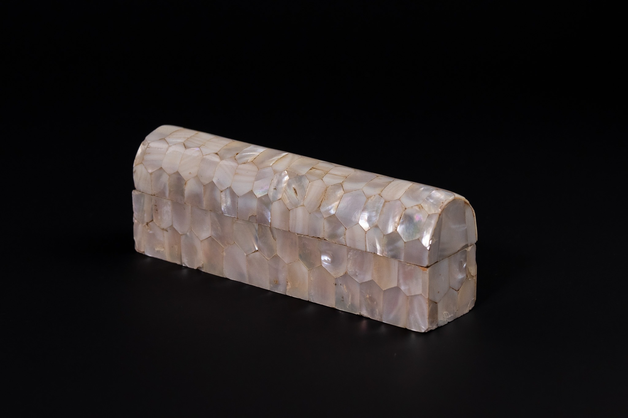 A small decorative casket of rectangular trunk form, featuring a domed lift-off lid and a wood-lined interior. The exterior is entirely clad in mother-of-pearl shell veneers, applied in a rhythmic geometric mosaic of vertical tiles with pointed tops to create a distinctive scaled or shingle effect. The iridescent shell exhibits a lustrous palette of cream and white tones with subtle flashes of pink and green.