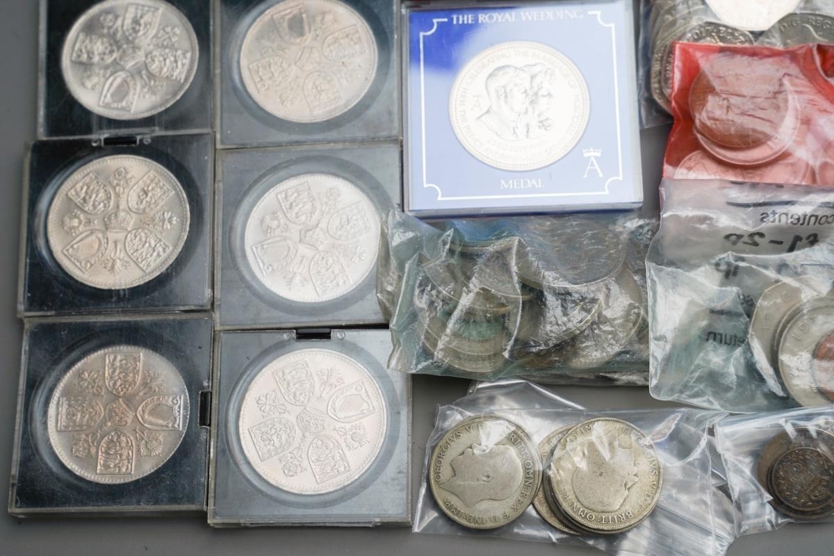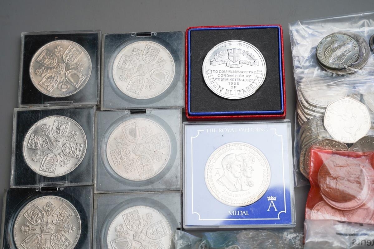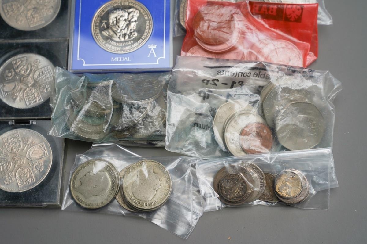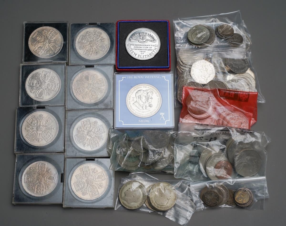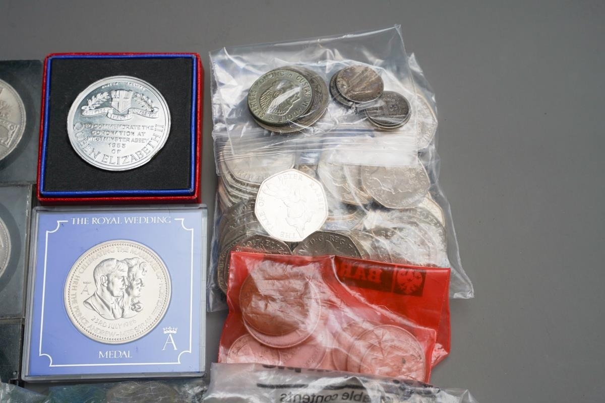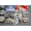 Pre 1947 silver coins (65 grams approx) Pre 1920 silver coins (33.5 grams approx) Mixed foreign silver coins (27 grams approx) A quantity of 50p coins. A quantity of mixed British coins. 10 commemorative coins