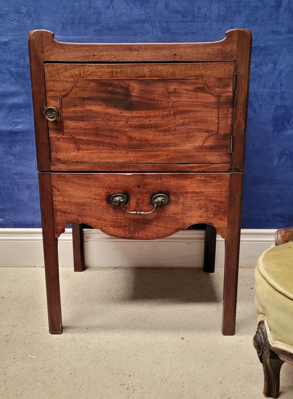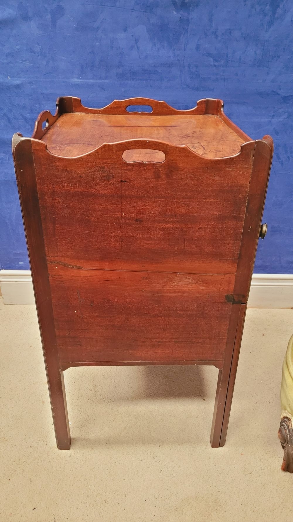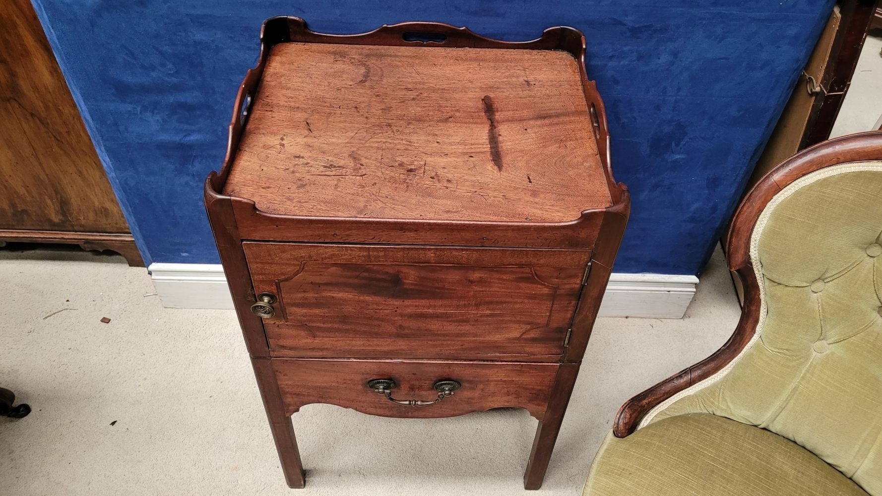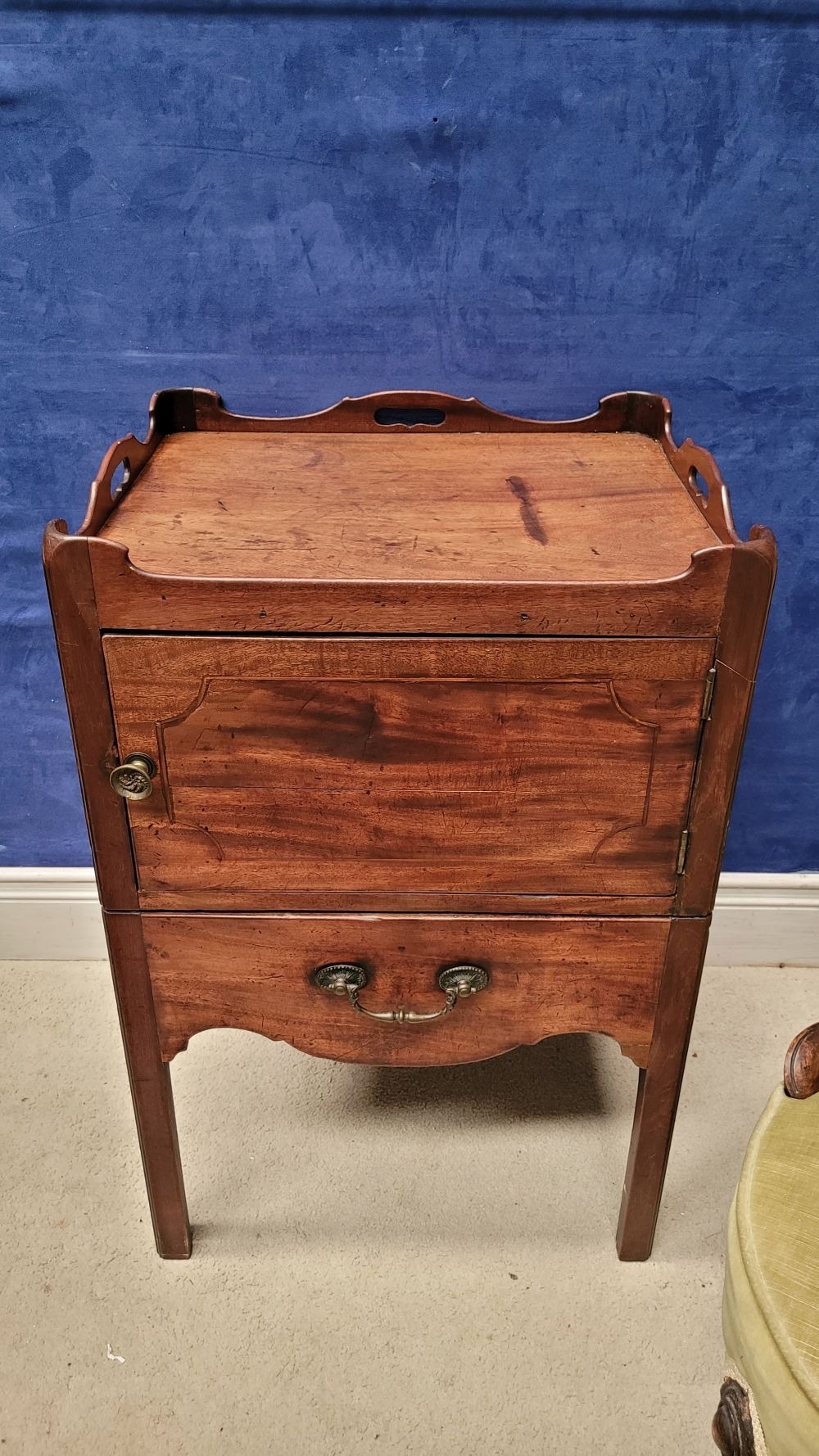 A CHARMING IRISH GEORGE III DRESSING ROOM / BEDSIDE CABINET, lovely tone to the wood, with raised gallery sides having pierced kidney shaped handles, a large cabinet beneath with inlaid detail and brass pull handle, over a pull out drawer beneath supports on legs. Dimensions: 76 x 45.5 x 50cm (H x D x W)