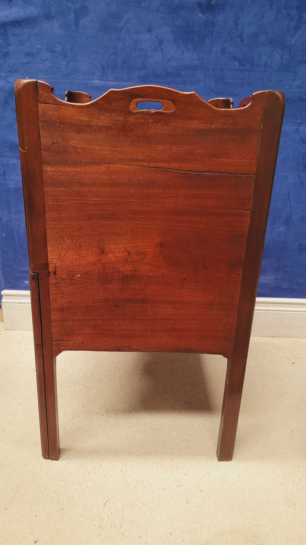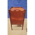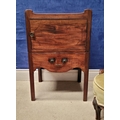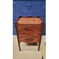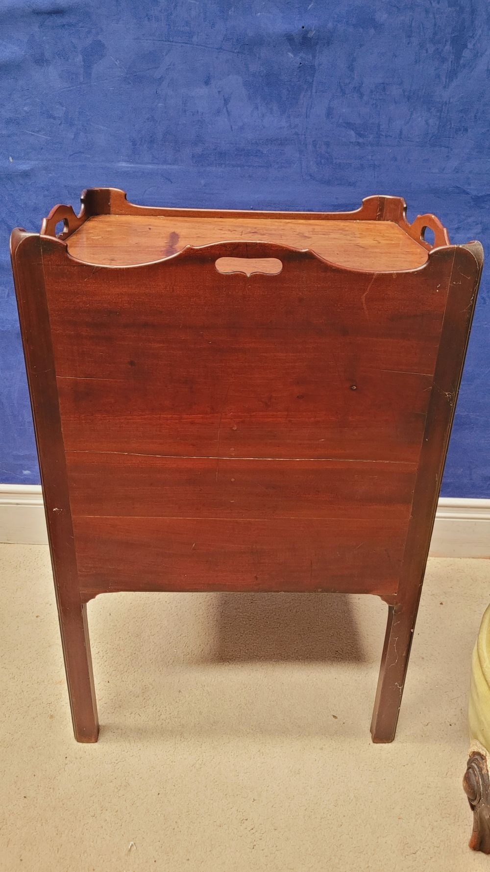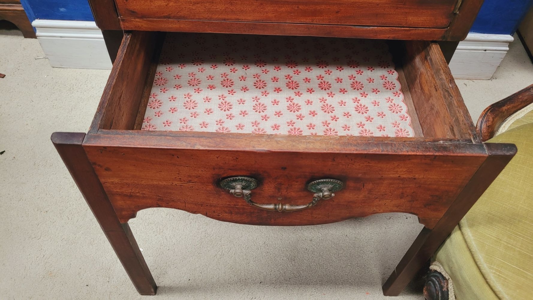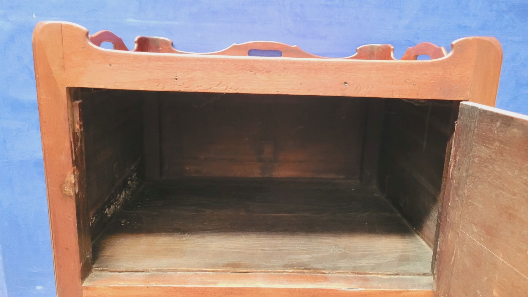 A CHARMING IRISH GEORGE III DRESSING ROOM / BEDSIDE CABINET, lovely tone to the wood, with raised gallery sides having pierced kidney shaped handles, a large cabinet beneath with inlaid detail and brass pull handle, over a pull out drawer beneath supports on legs. Dimensions: 76 x 45.5 x 50cm (H x D x W)