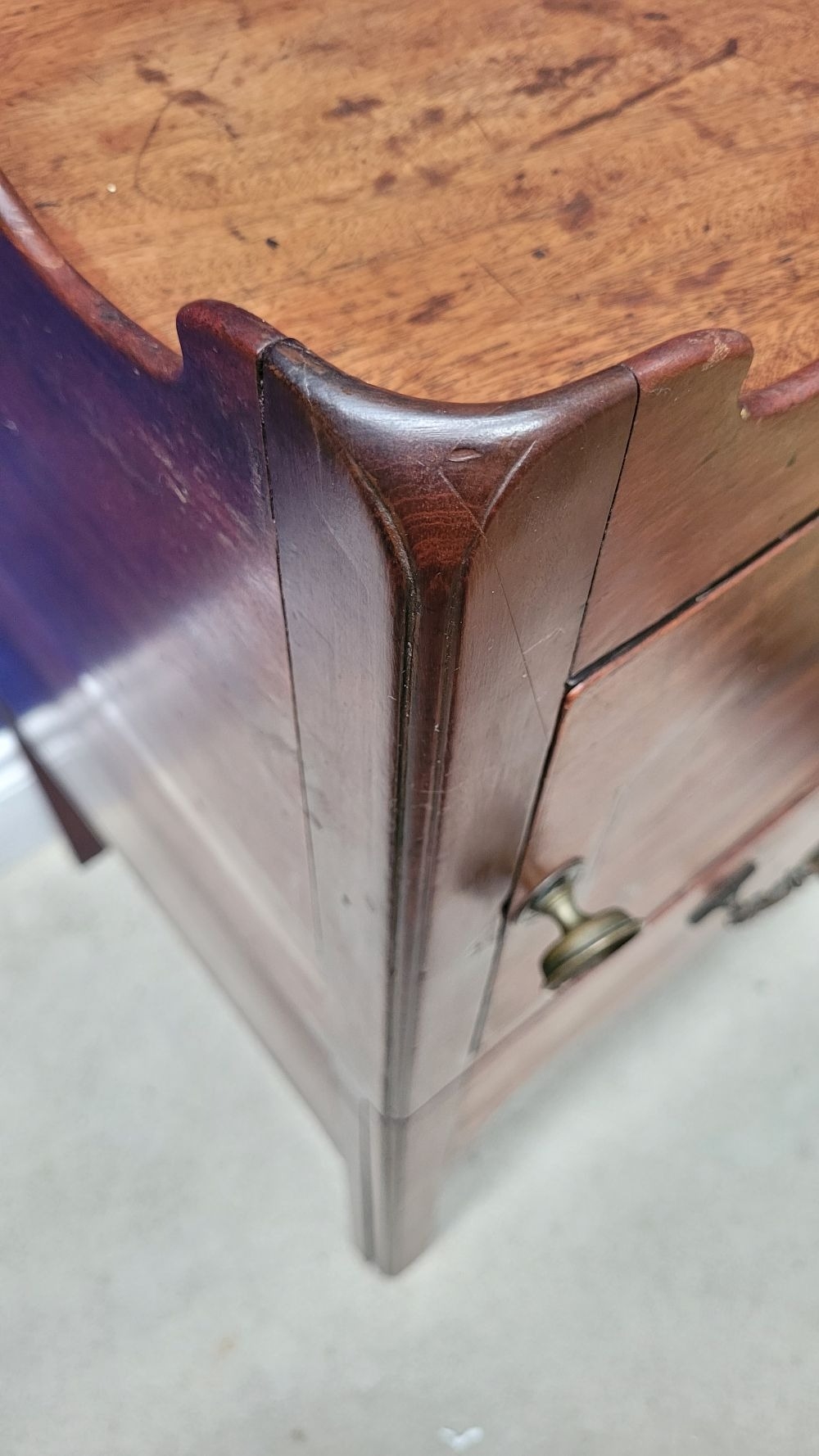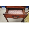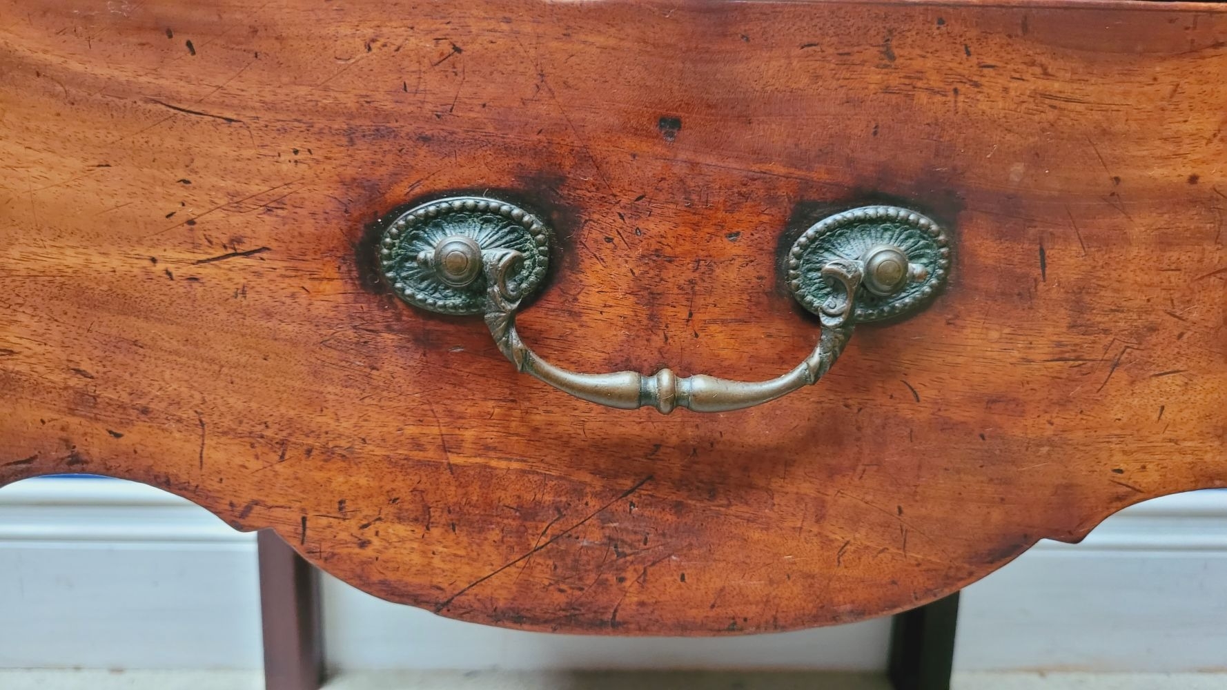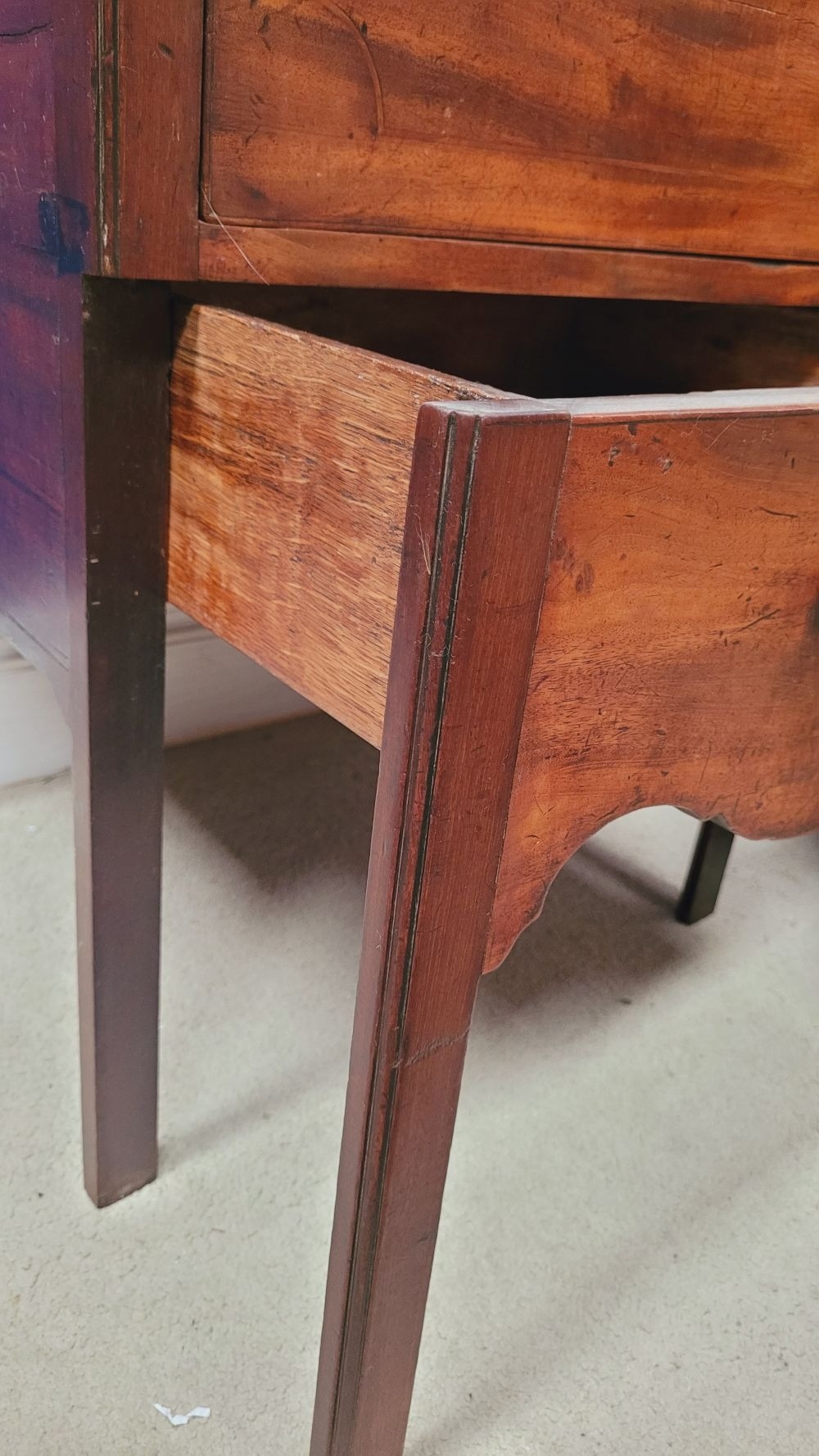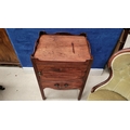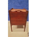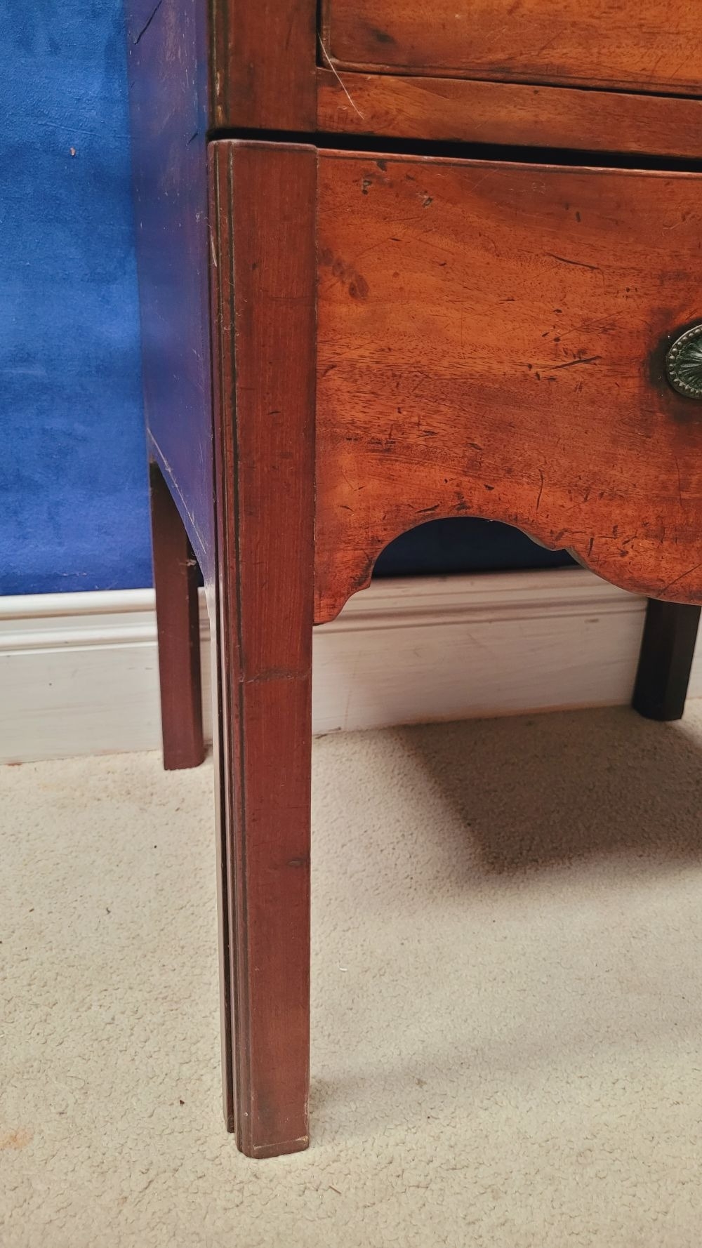 A CHARMING IRISH GEORGE III DRESSING ROOM / BEDSIDE CABINET, lovely tone to the wood, with raised gallery sides having pierced kidney shaped handles, a large cabinet beneath with inlaid detail and brass pull handle, over a pull out drawer beneath supports on legs. Dimensions: 76 x 45.5 x 50cm (H x D x W)