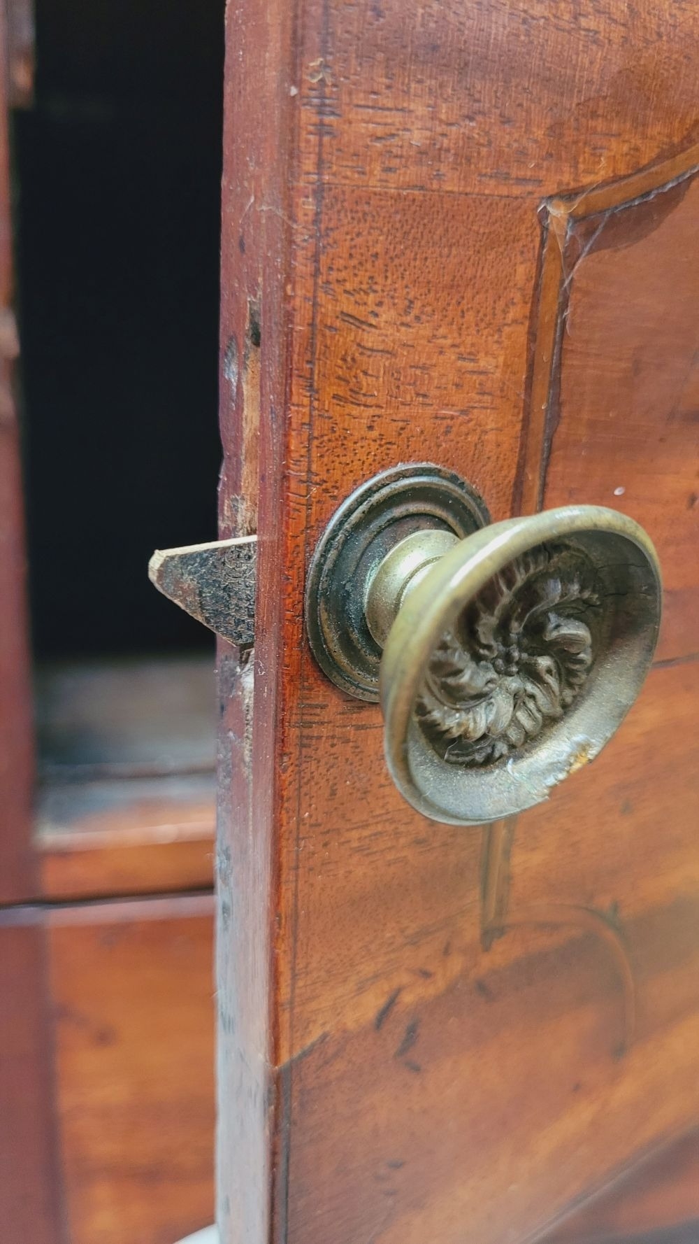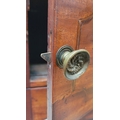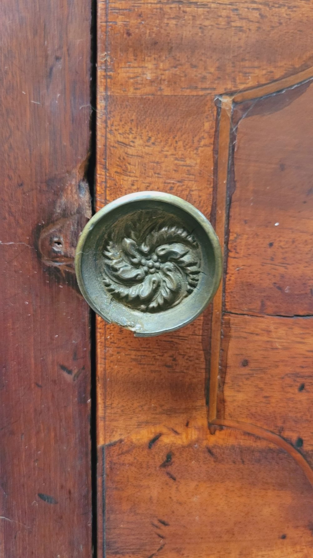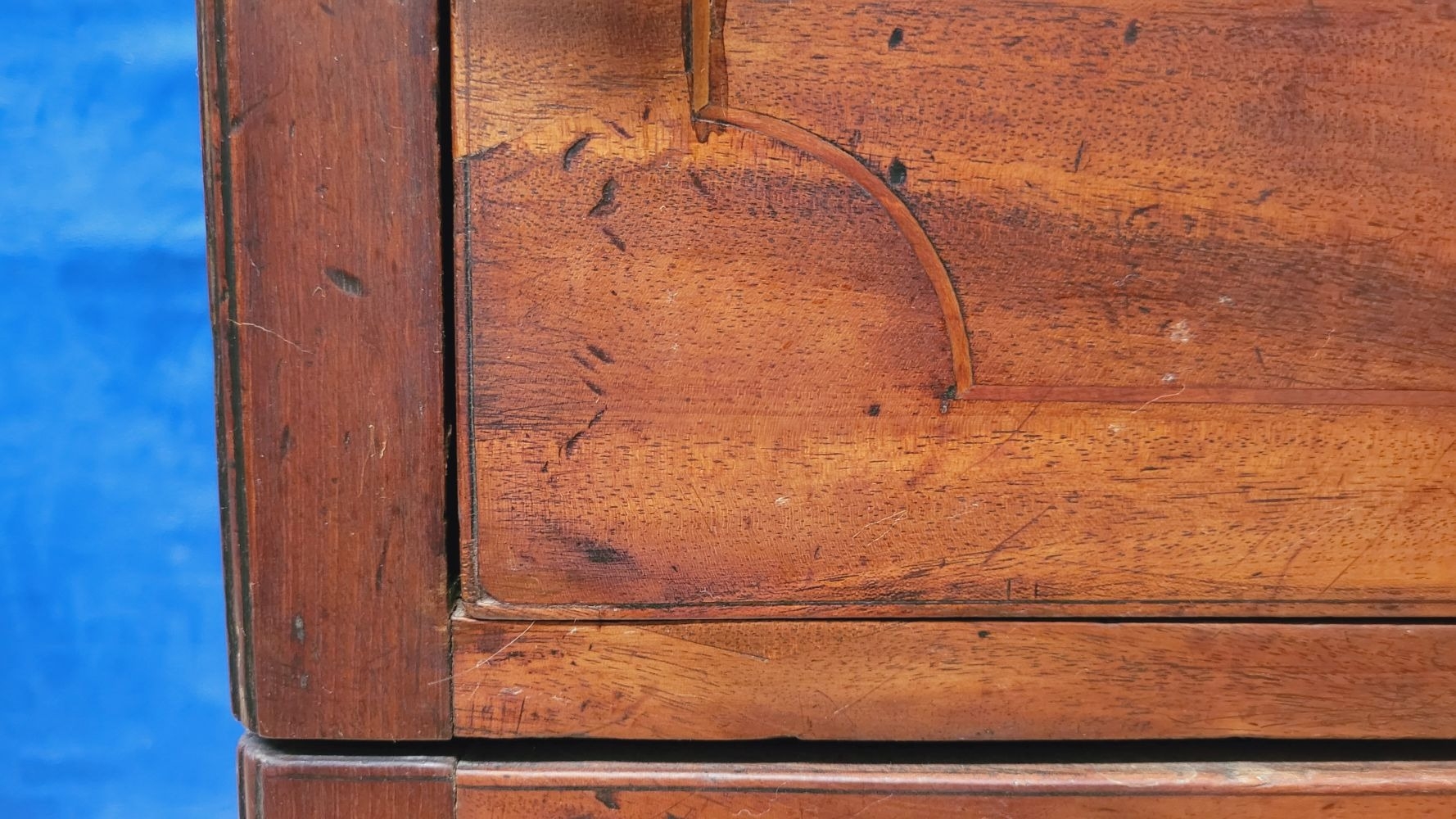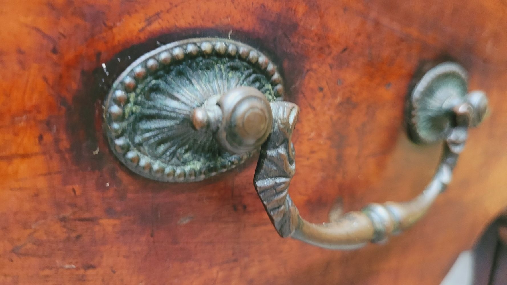 A CHARMING IRISH GEORGE III DRESSING ROOM / BEDSIDE CABINET, lovely tone to the wood, with raised gallery sides having pierced kidney shaped handles, a large cabinet beneath with inlaid detail and brass pull handle, over a pull out drawer beneath supports on legs. Dimensions: 76 x 45.5 x 50cm (H x D x W)